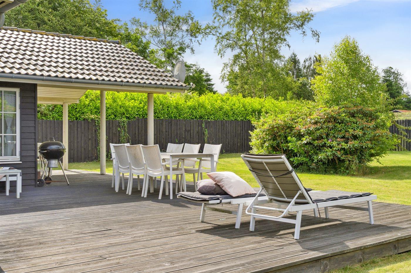 Ferieboligen er beliggende på en 940 m² stor havegrund. Der er 1200 m til havet. Nærmeste forretning er beliggende i en afstand af 475 m. Der er en golfbane i en afstand af 3700 m. Til ferieboligen hører åbent terrasseareal. Desuden er der overdækket terrasse. Grill til rådighed. Parkering ved ferieboligen.