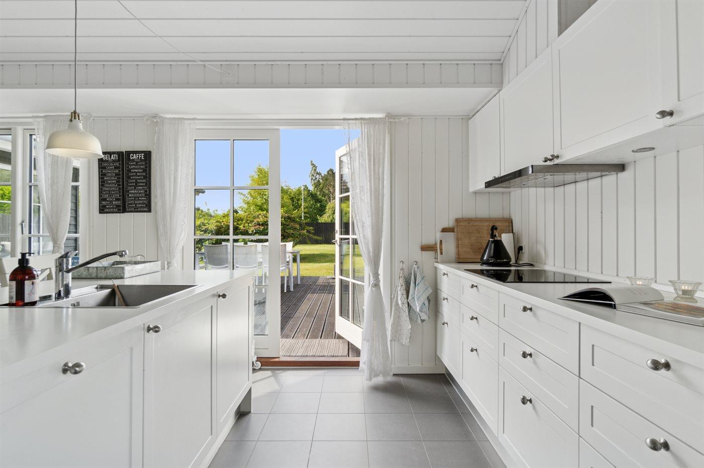 Køkkenet er udstyret med 1 køleskab. Der er 4 keramiske kogeplader, varmluftovn, mikrobølgeovn samt opvaskemaskine.