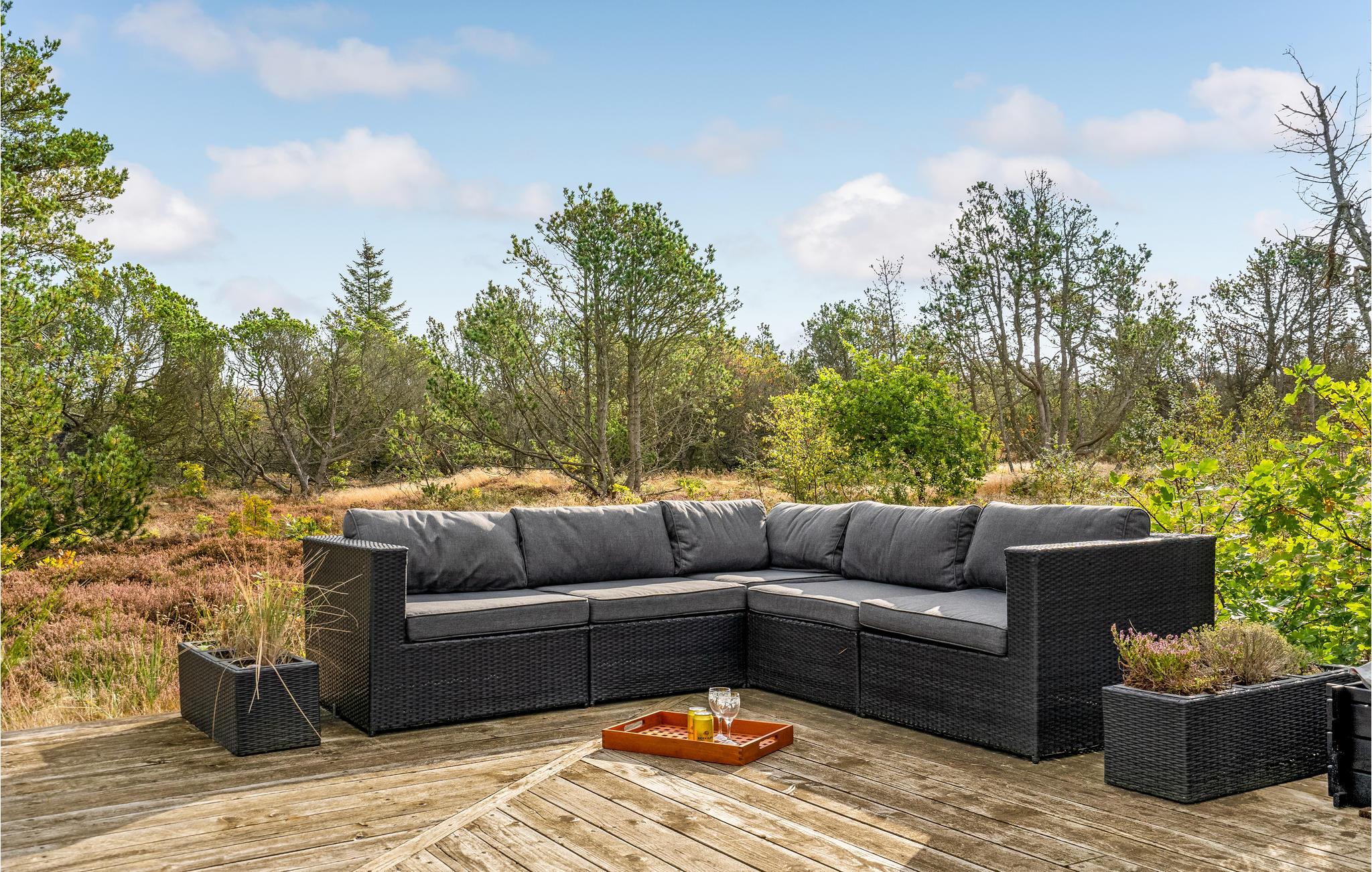 Hyggeligt sommerhus i Hulsig Strand med stor terrasse, trampolin og tæt på stranden.