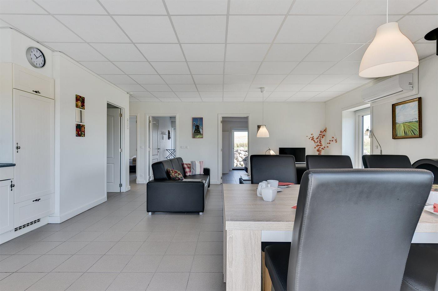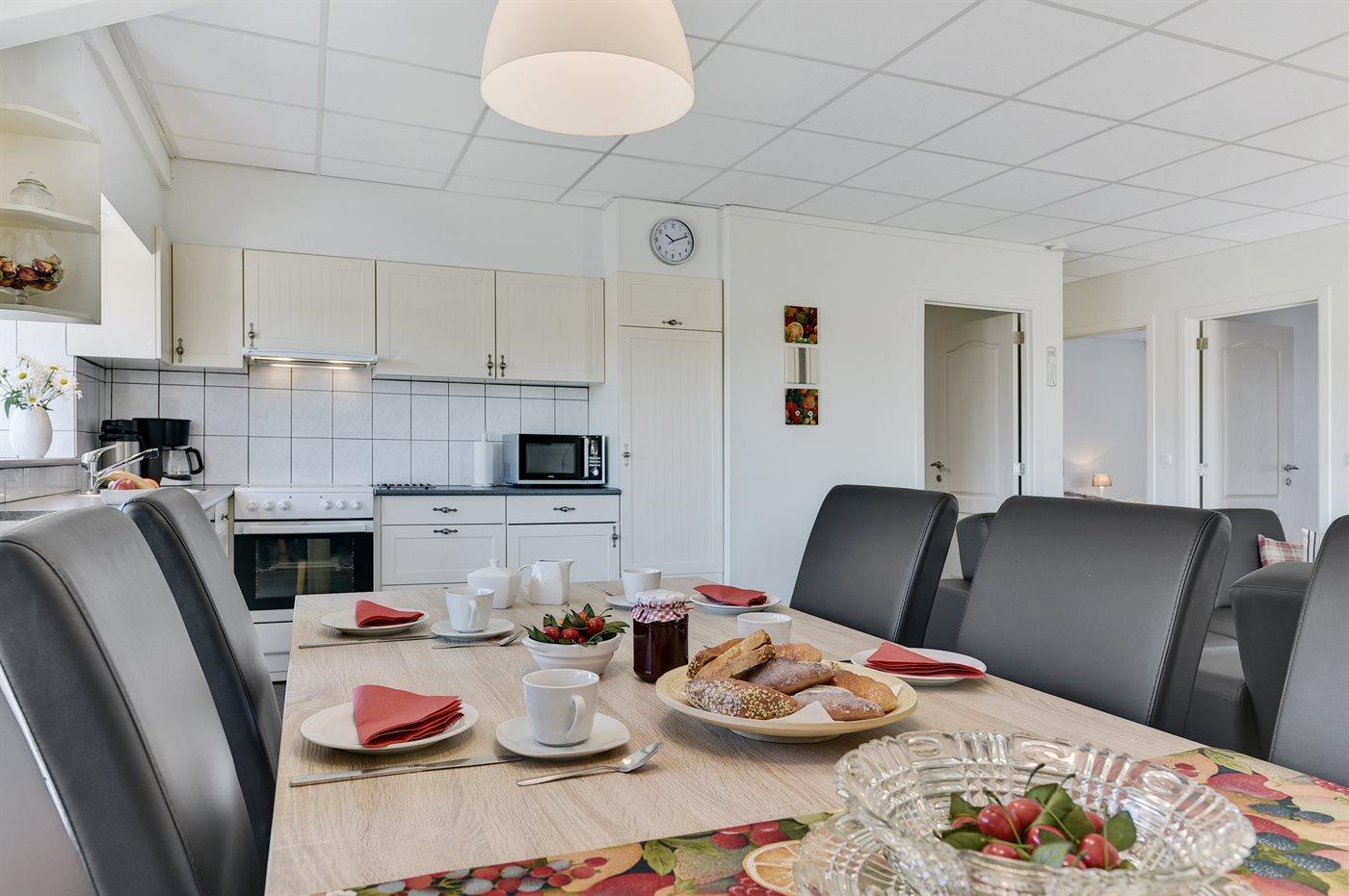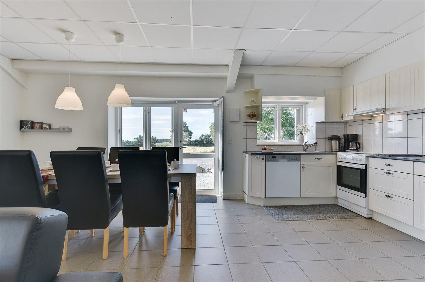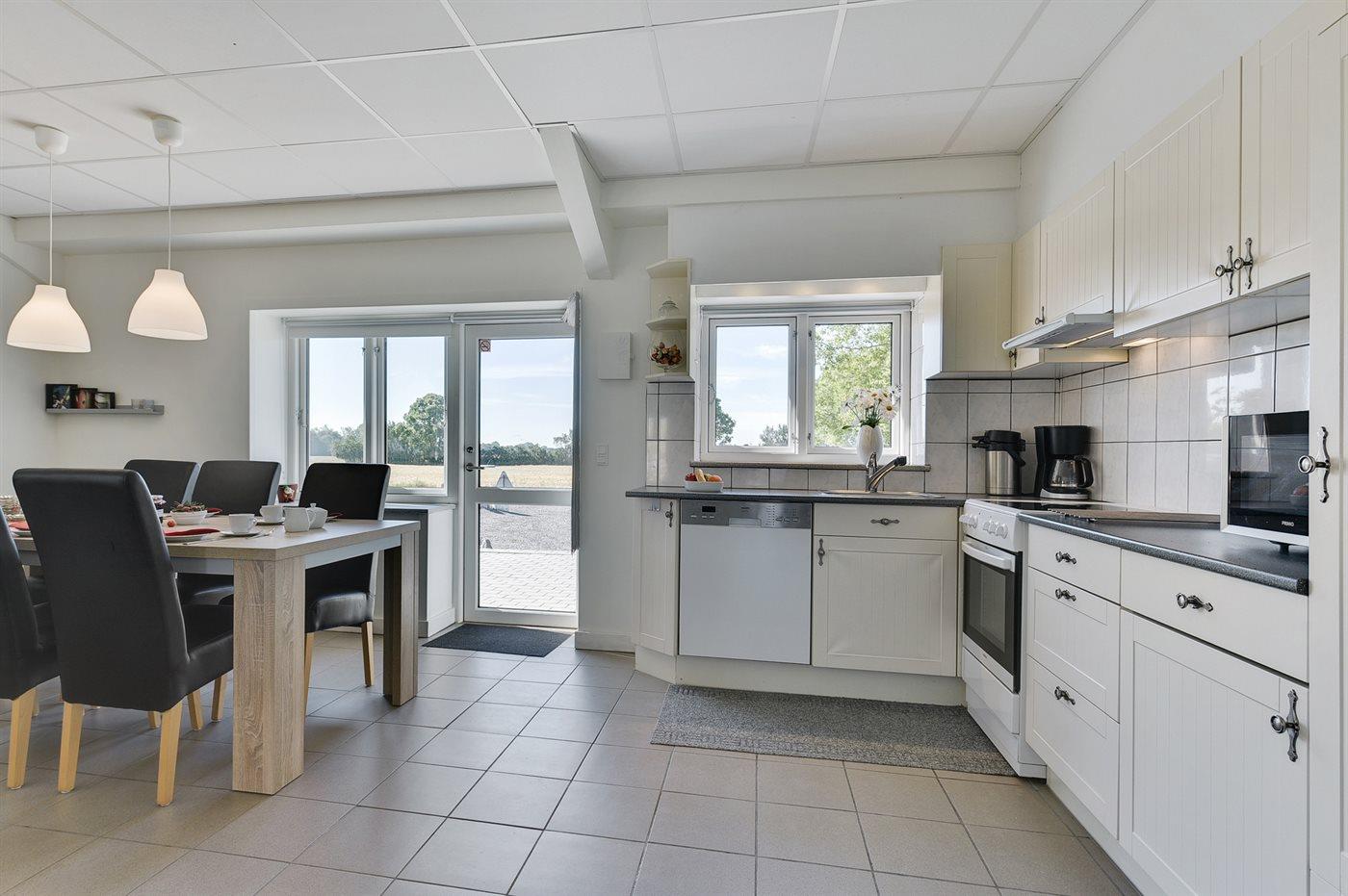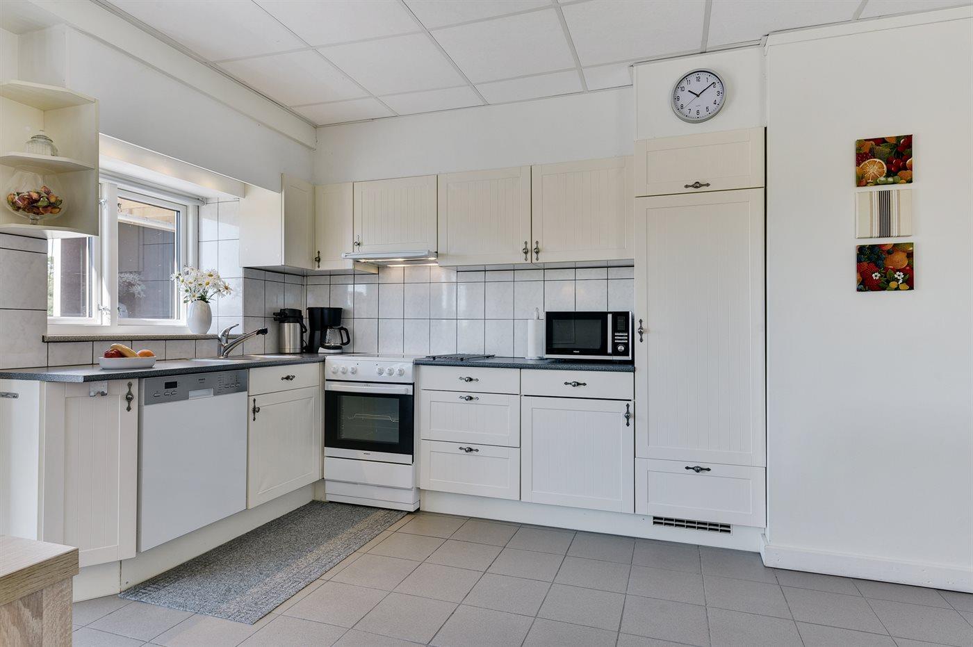 Køkkenet er udstyret med 1 køleskab. Der er 4 keramiske kogeplader, varmluftovn, mikrobølgeovn samt opvaskemaskine.