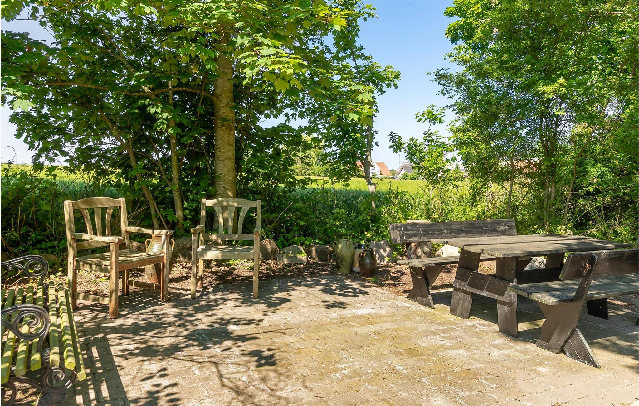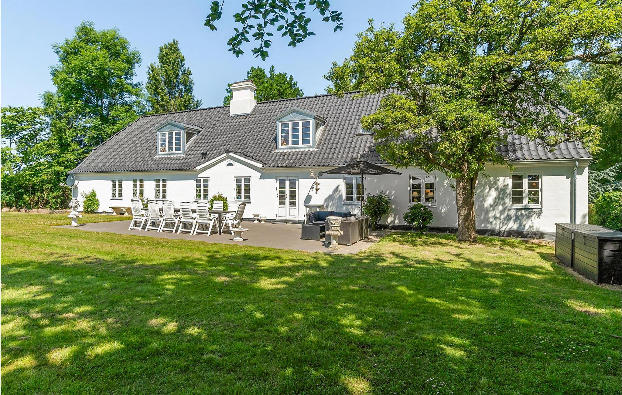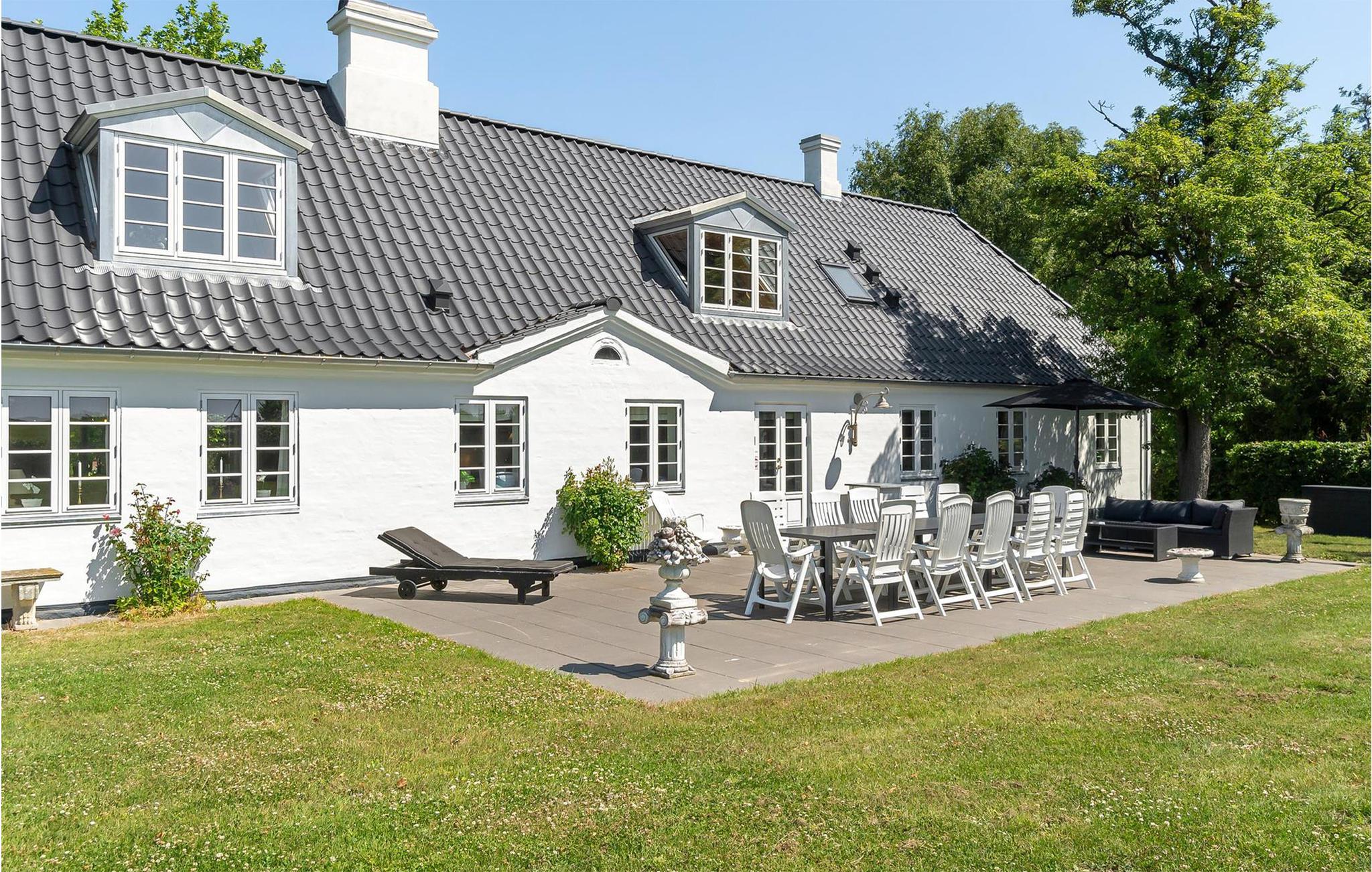 Oplev det romantiske Drostgaarden i Humble med charme, store terrasser og udsigt til marker på Sydlangeland.