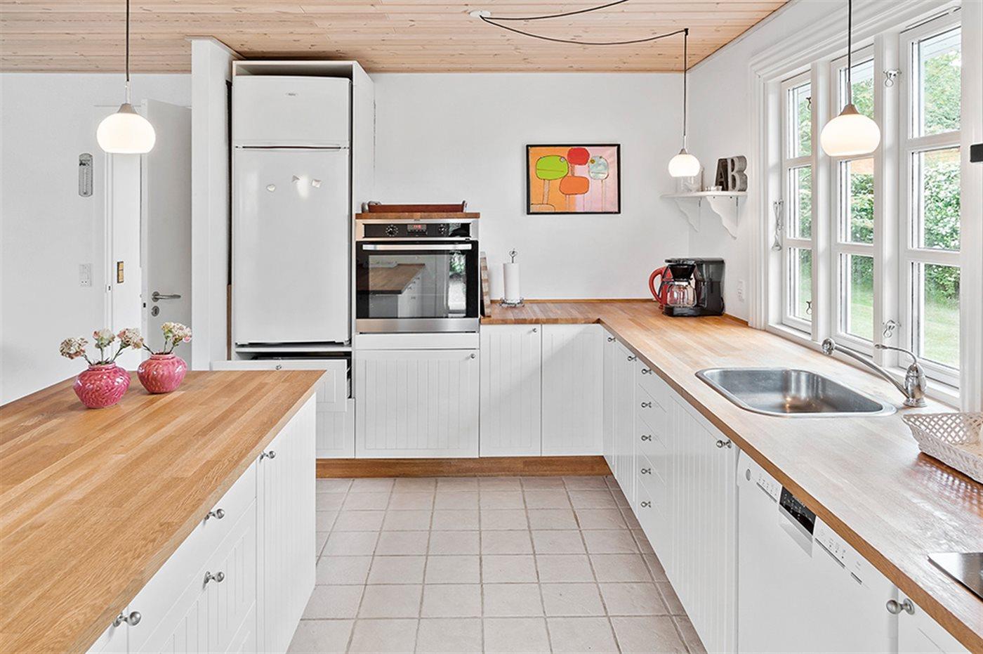 Køkkenet er udstyret med 1 køleskab. Der er 4 keramiske kogeplader, varmluftovn, mikrobølgeovn samt opvaskemaskine.