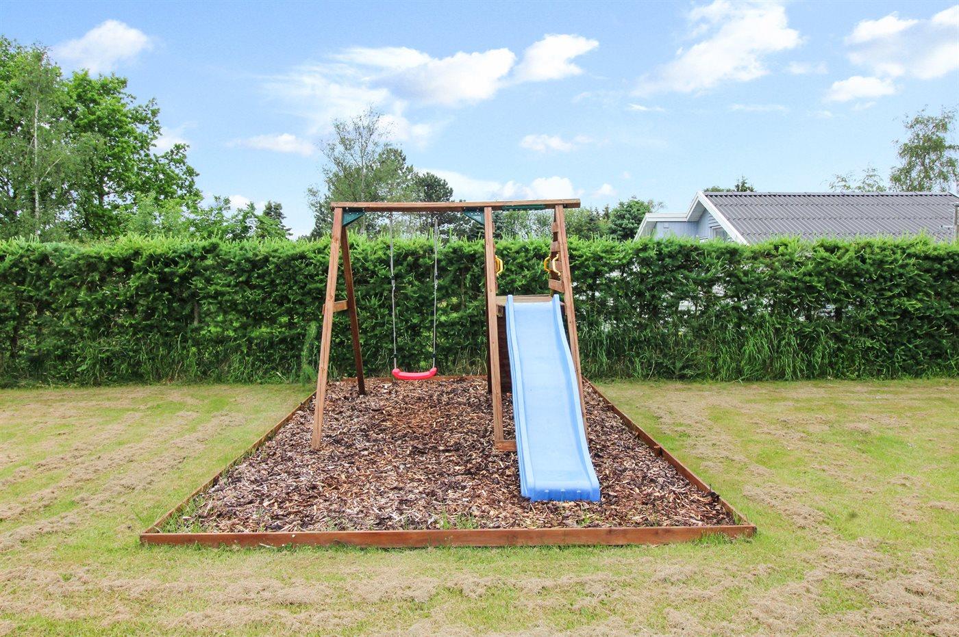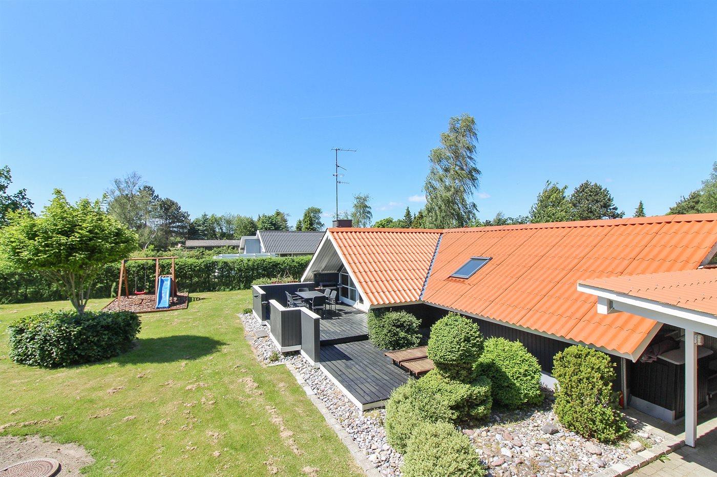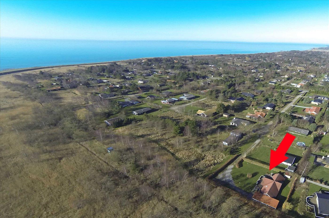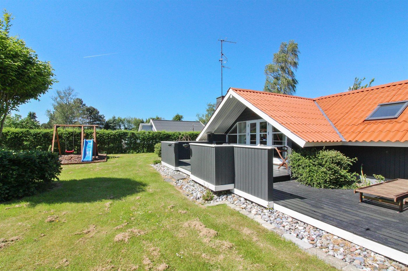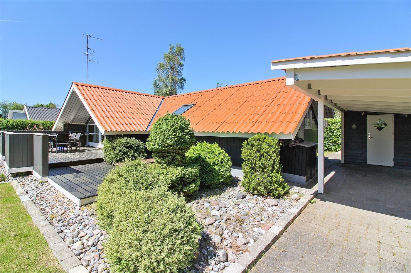 Ferieboligen er beliggende på en 1013 m² stor havegrund. Grunden er indhegnet. Der er 400 m til havet. Nærmeste forretning er beliggende i en afstand af 1700 m. Til ferieboligen hører 40 m² terrasseareal. Gynge. Rutchebane. Weber kul-grill til rådighed. Der er carport til rådighed. Der er installeret stik til opladning af elbil. Type 2 stik. Med 11 kW ladeeffekt. Parkering ved ferieboligen.
