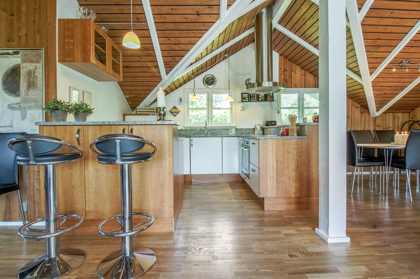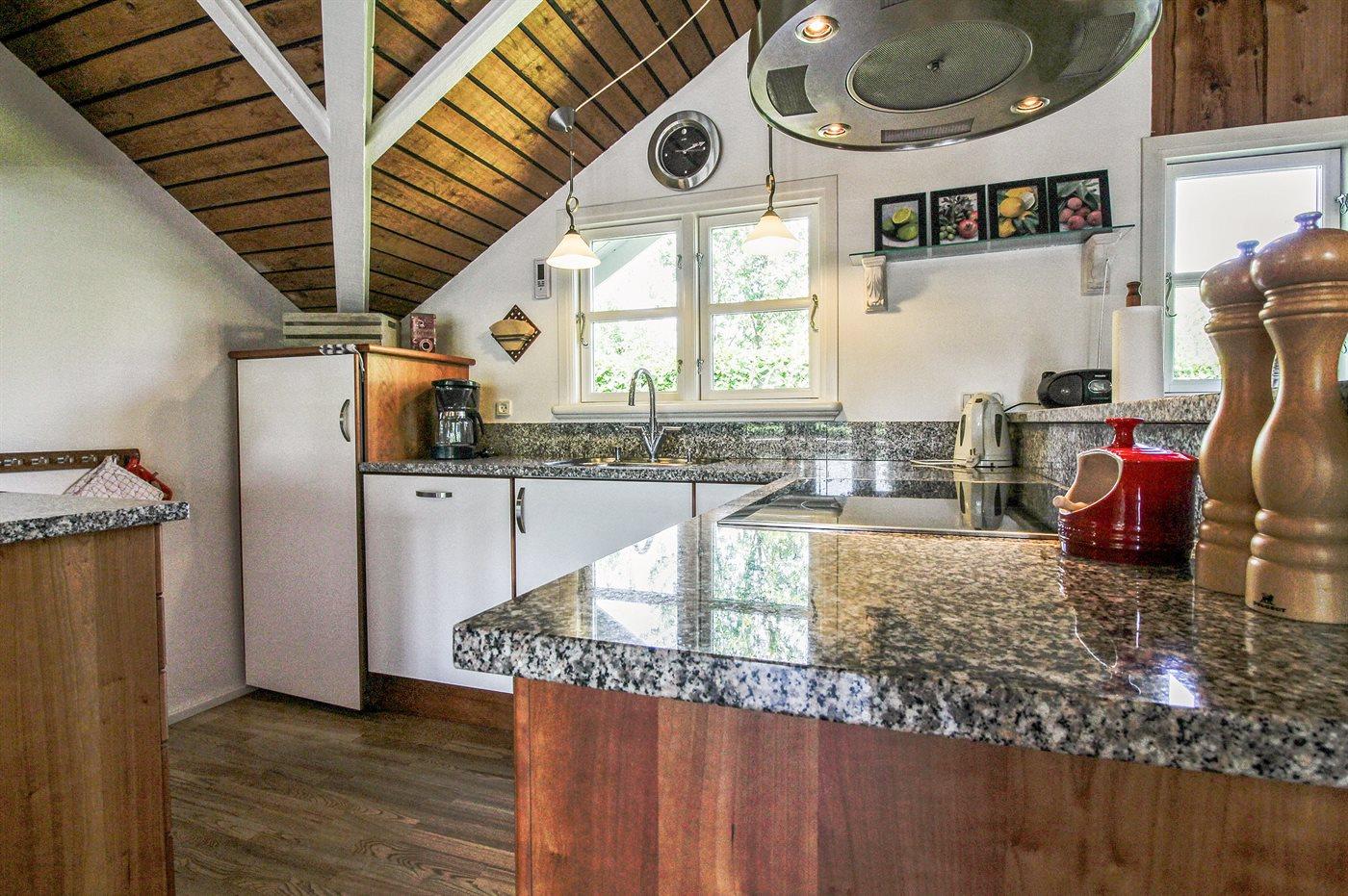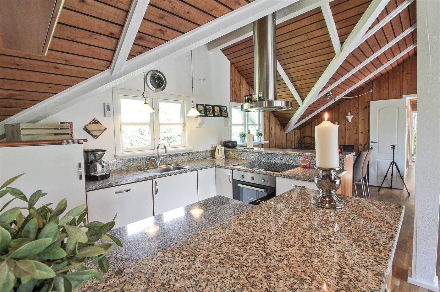 Køkkenet er udstyret med 1 køleskab. Der er 4 induktionskogeplader, varmluftovn, mikrobølgeovn samt opvaskemaskine.