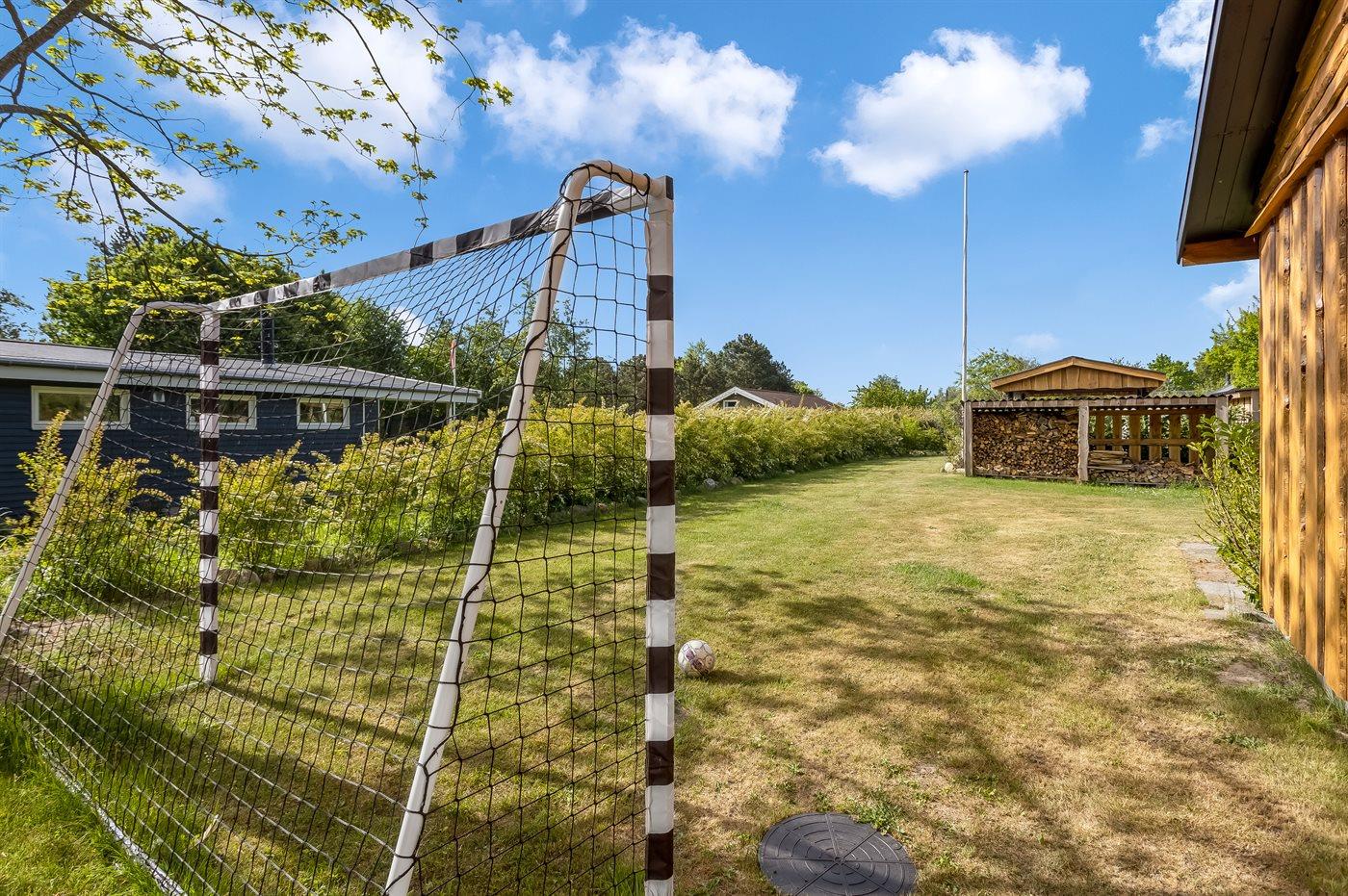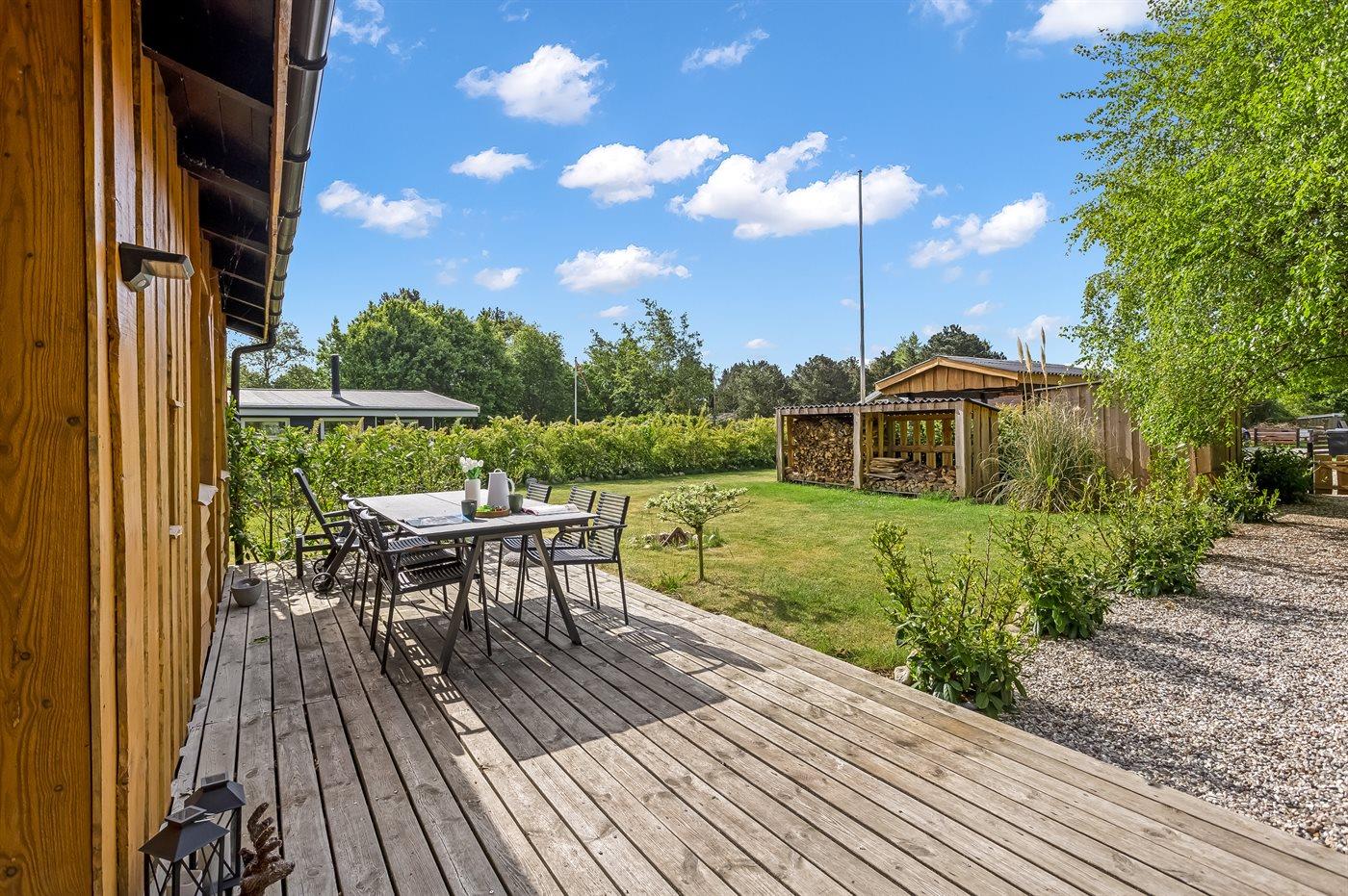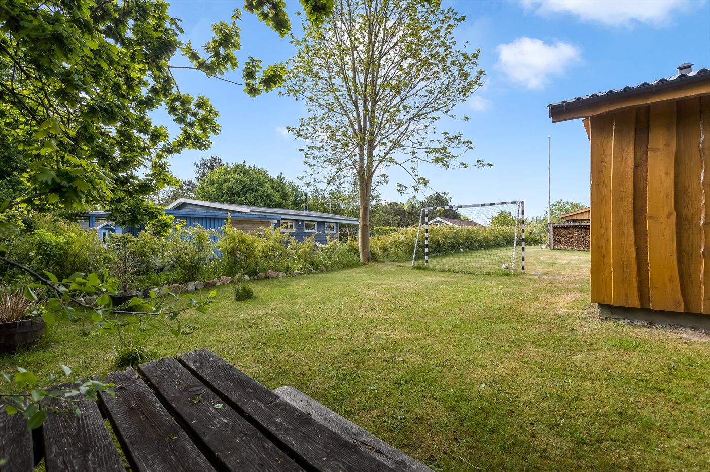 Ferieboligen er beliggende på en 1030 m² stor naturgrund. Der er 700 m til havet. Nærmeste forretning er beliggende i en afstand af 2400 m. Til ferieboligen hører åbent terrasseareal. Desuden er der overdækket terrasse. Trampolin. Fodboldmål. Der ligger en legeplads i en afstand af 200 m. Bålsted. Grill til rådighed. Der er carport til rådighed. Parkering ved ferieboligen.