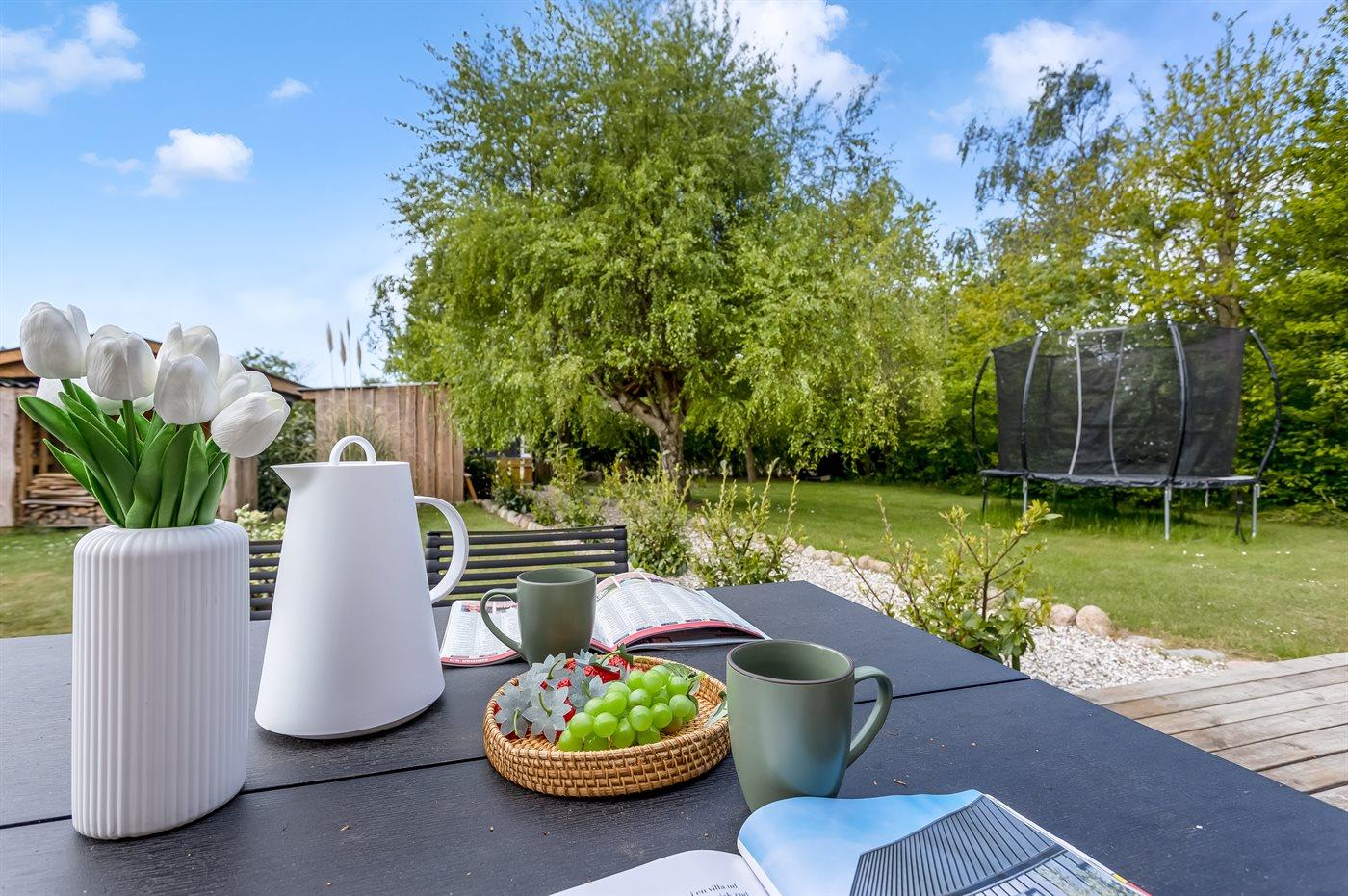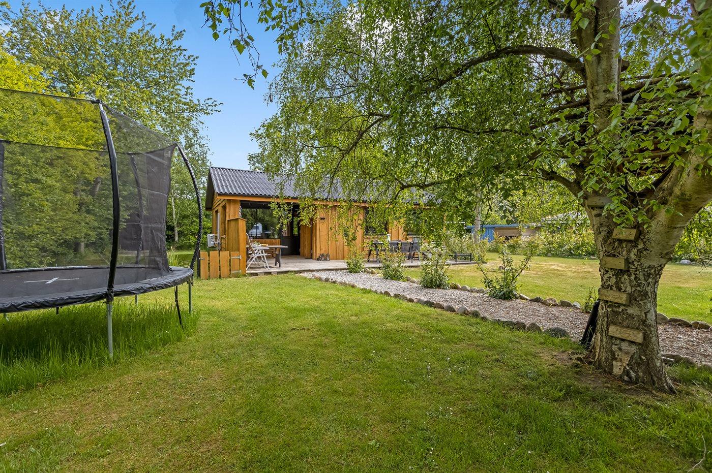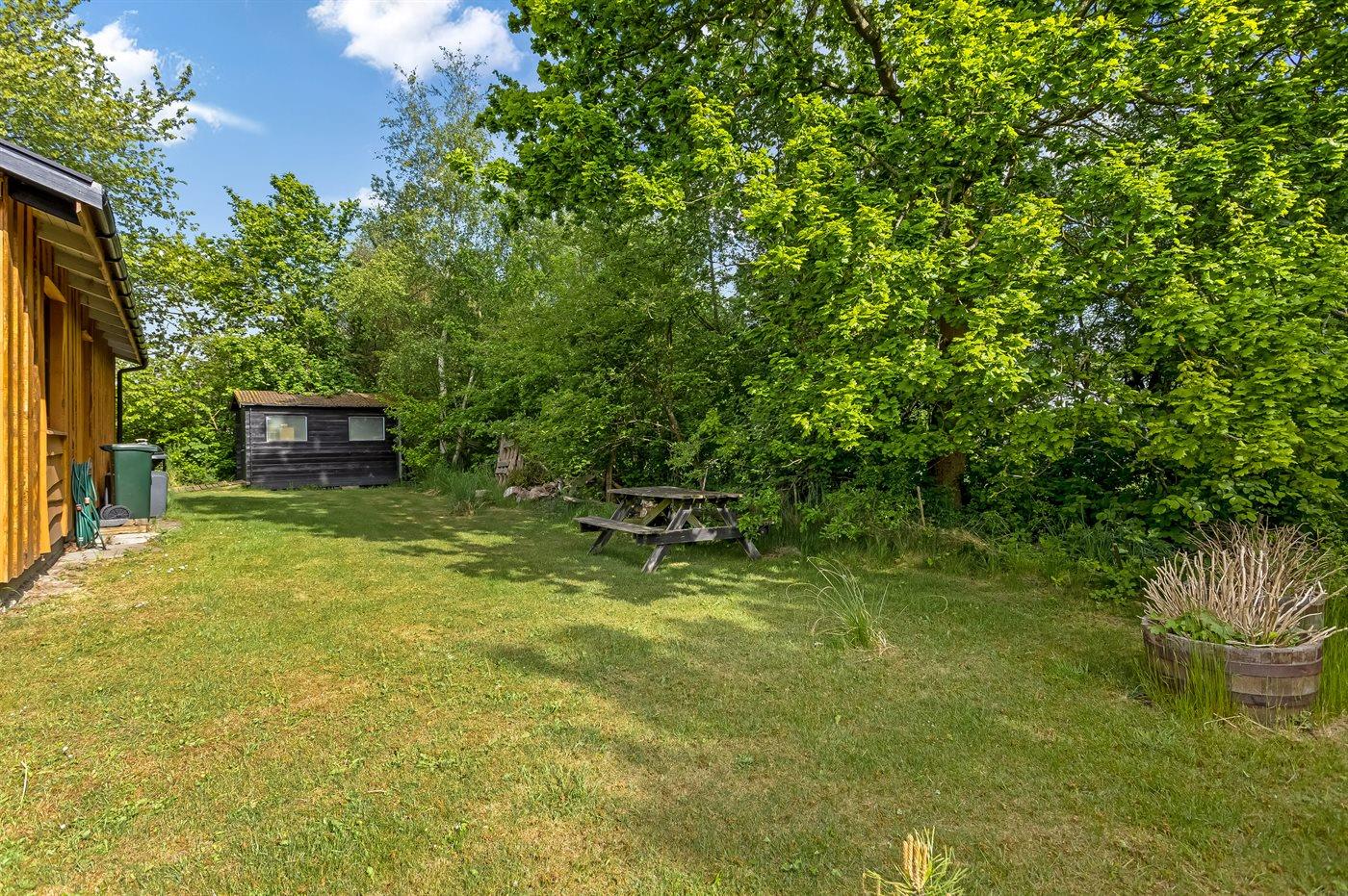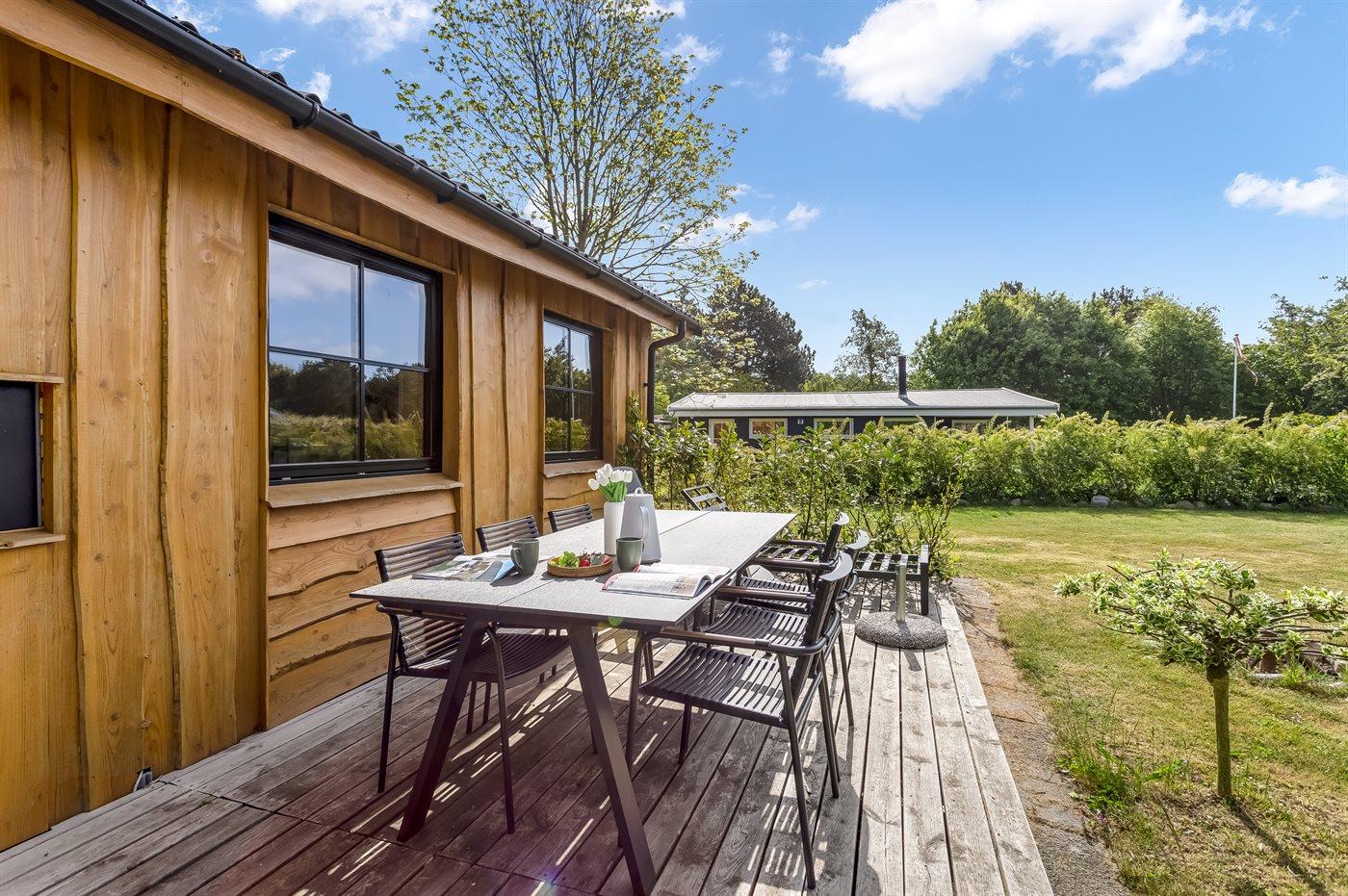 Ferieboligen er beliggende på en 1030 m² stor naturgrund. Der er 700 m til havet. Nærmeste forretning er beliggende i en afstand af 2400 m. Til ferieboligen hører åbent terrasseareal. Desuden er der overdækket terrasse. Trampolin. Fodboldmål. Der ligger en legeplads i en afstand af 200 m. Bålsted. Grill til rådighed. Der er carport til rådighed. Parkering ved ferieboligen.