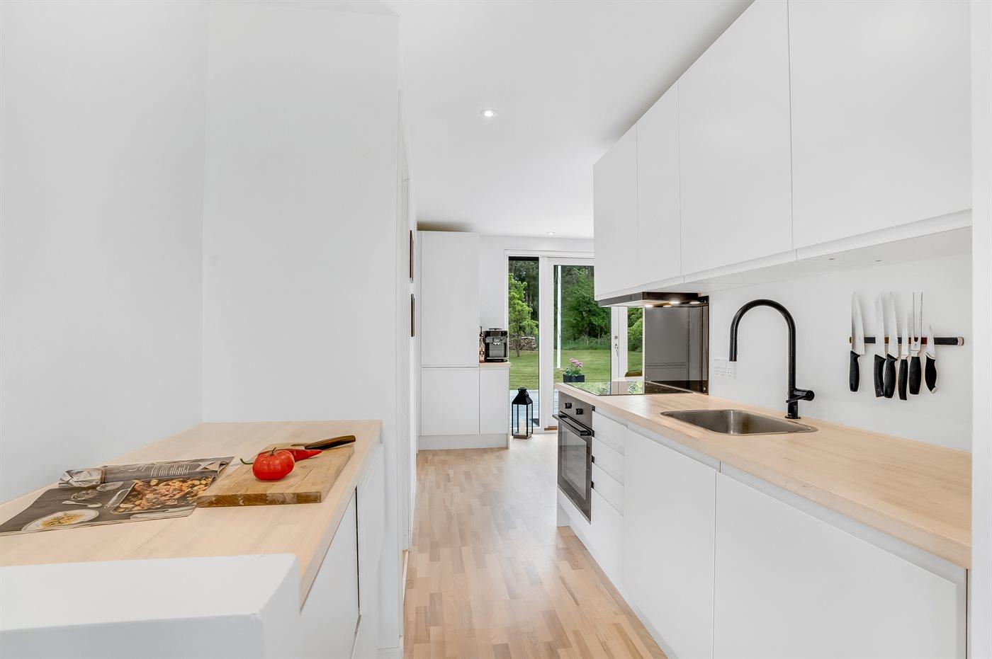 Køkkenet er udstyret med 1 køleskab. Der er 4 keramiske kogeplader, varmluftovn samt opvaskemaskine.
