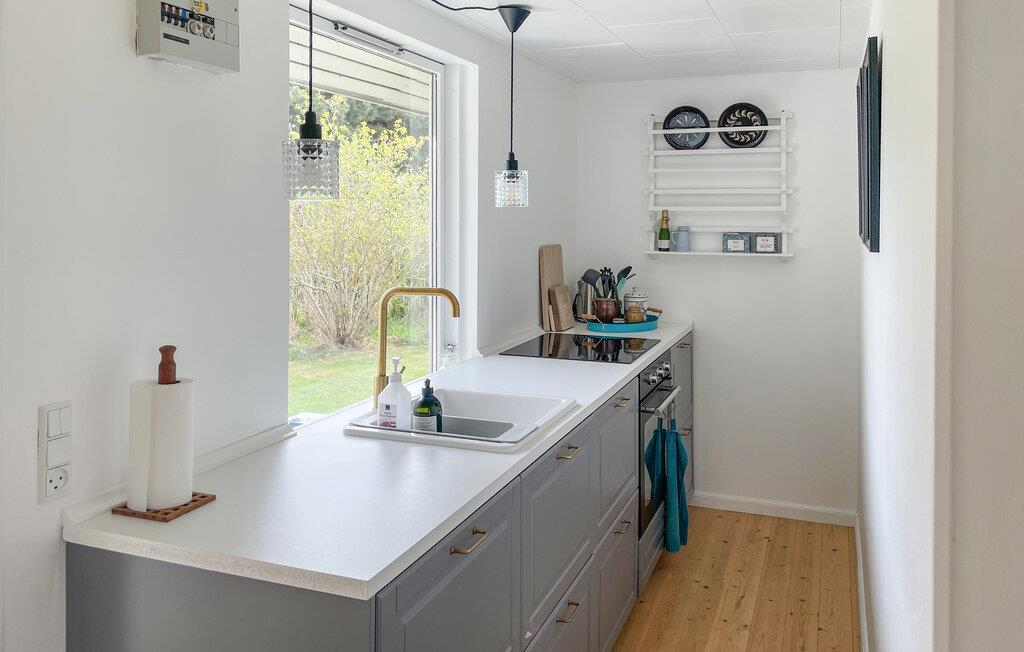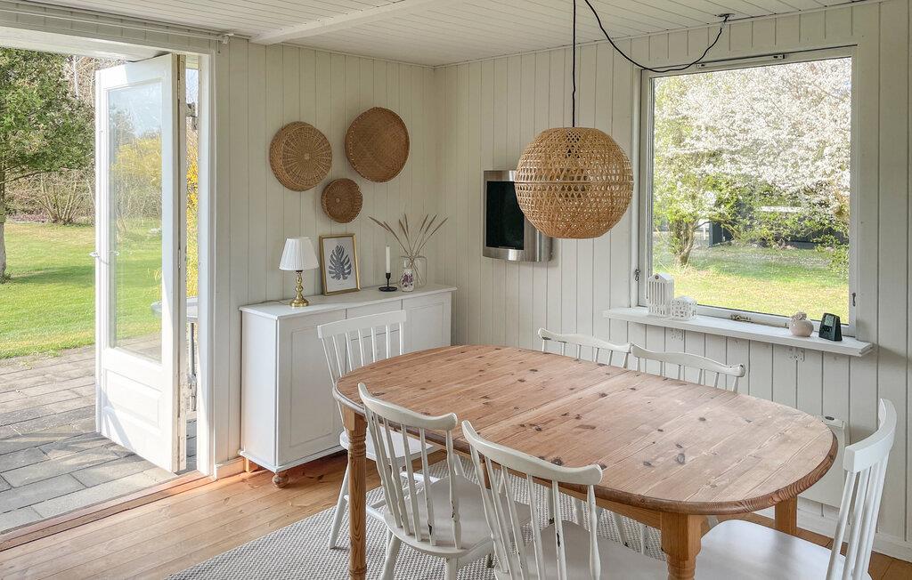 Bliv inspireret af det lyse og stilfuldt møblerede interiør i dette hyggelige feriehus. Her kan I kigge ud i en grøn have, mens I tryller lækre retter frem lavet af friske råvarer fra gårdbutikken eller nyder rolige læsetimer i den behagelige sofa. Glæd jer til hyggelige spilleaftener og harmoniske måltider ved det behageligt oplyste spisebord.