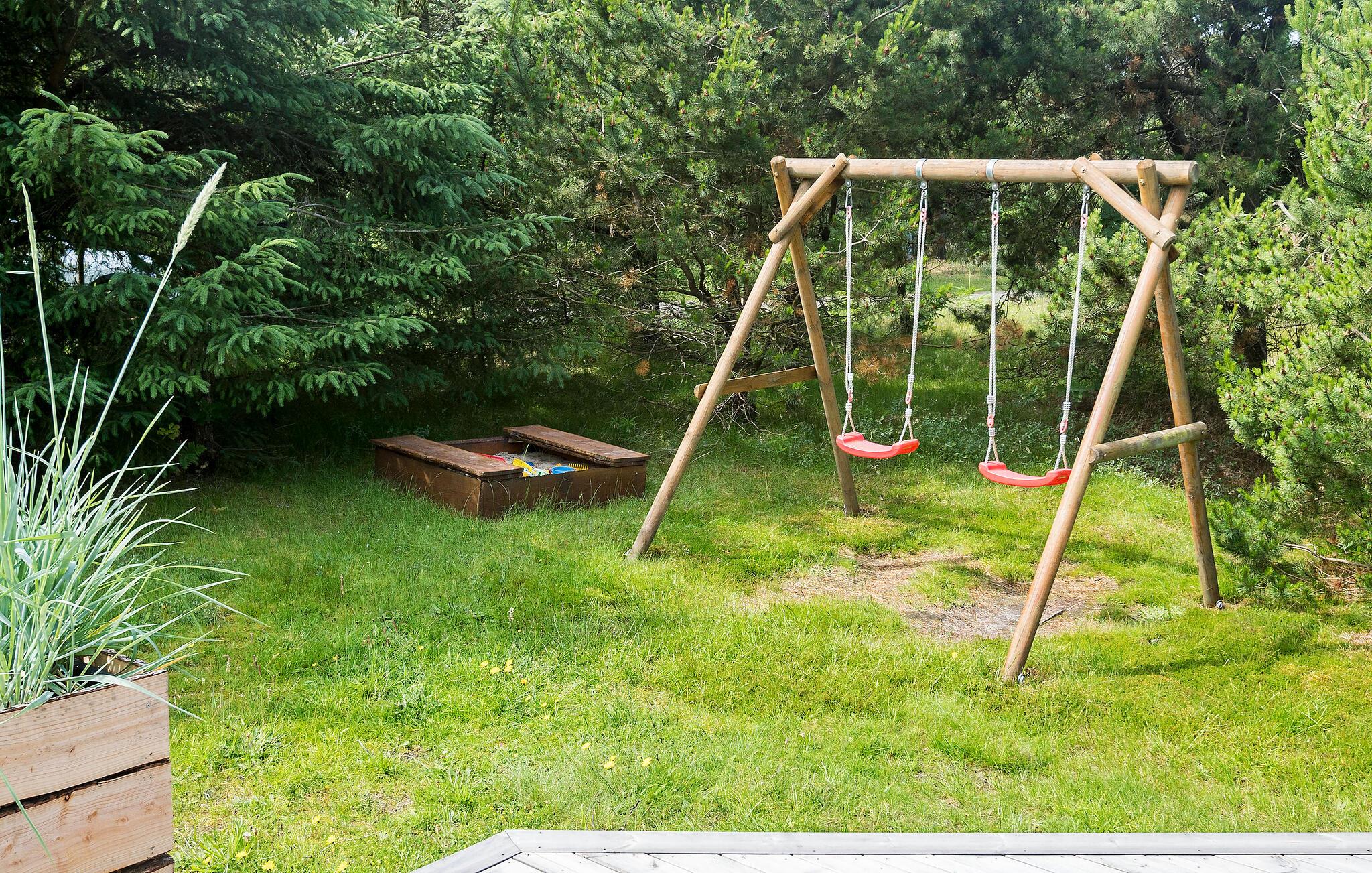 Hyggeligt træhus i roligt område nær Blokhus strand med stor terrasse og legeplads for børn.