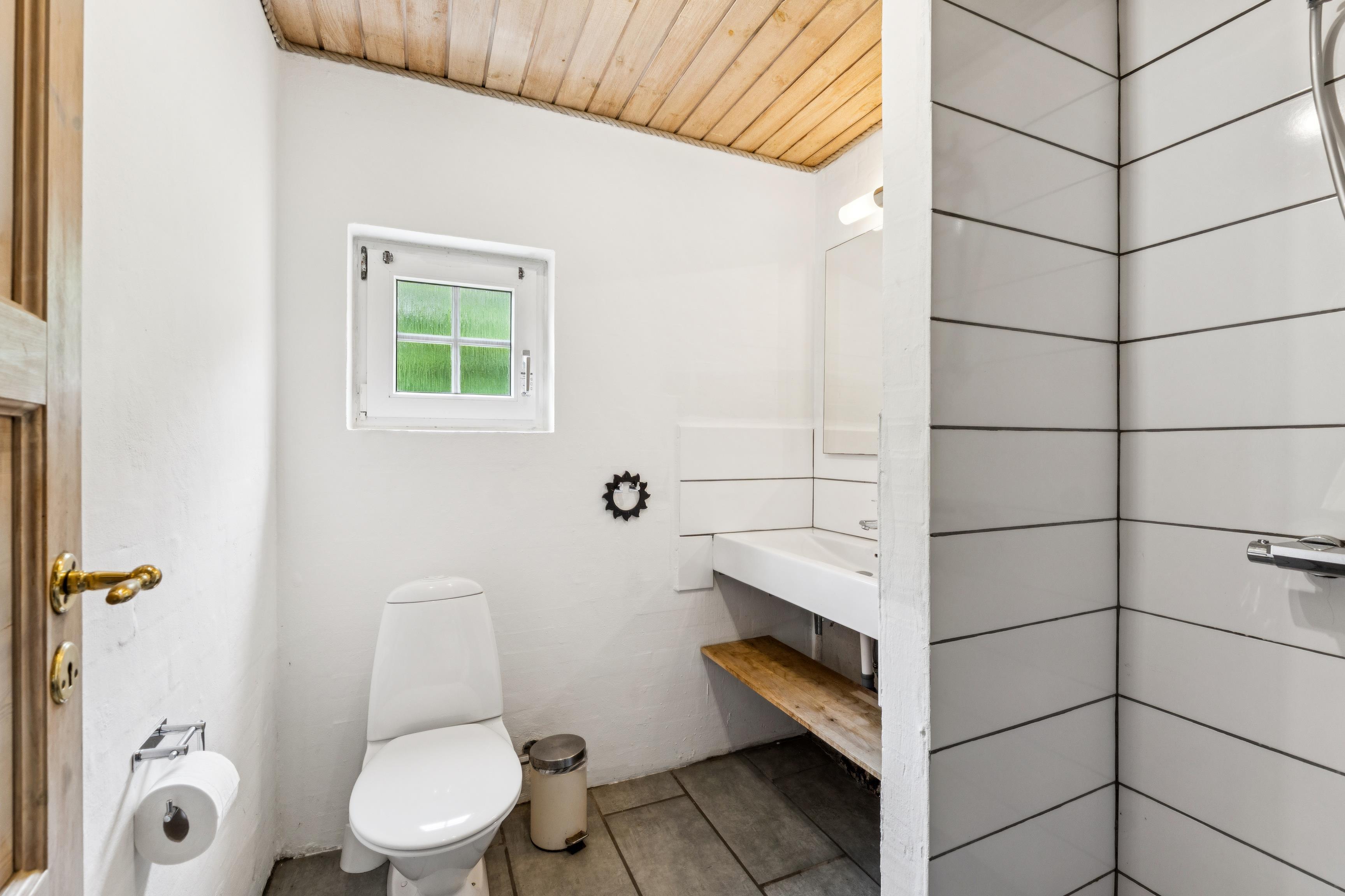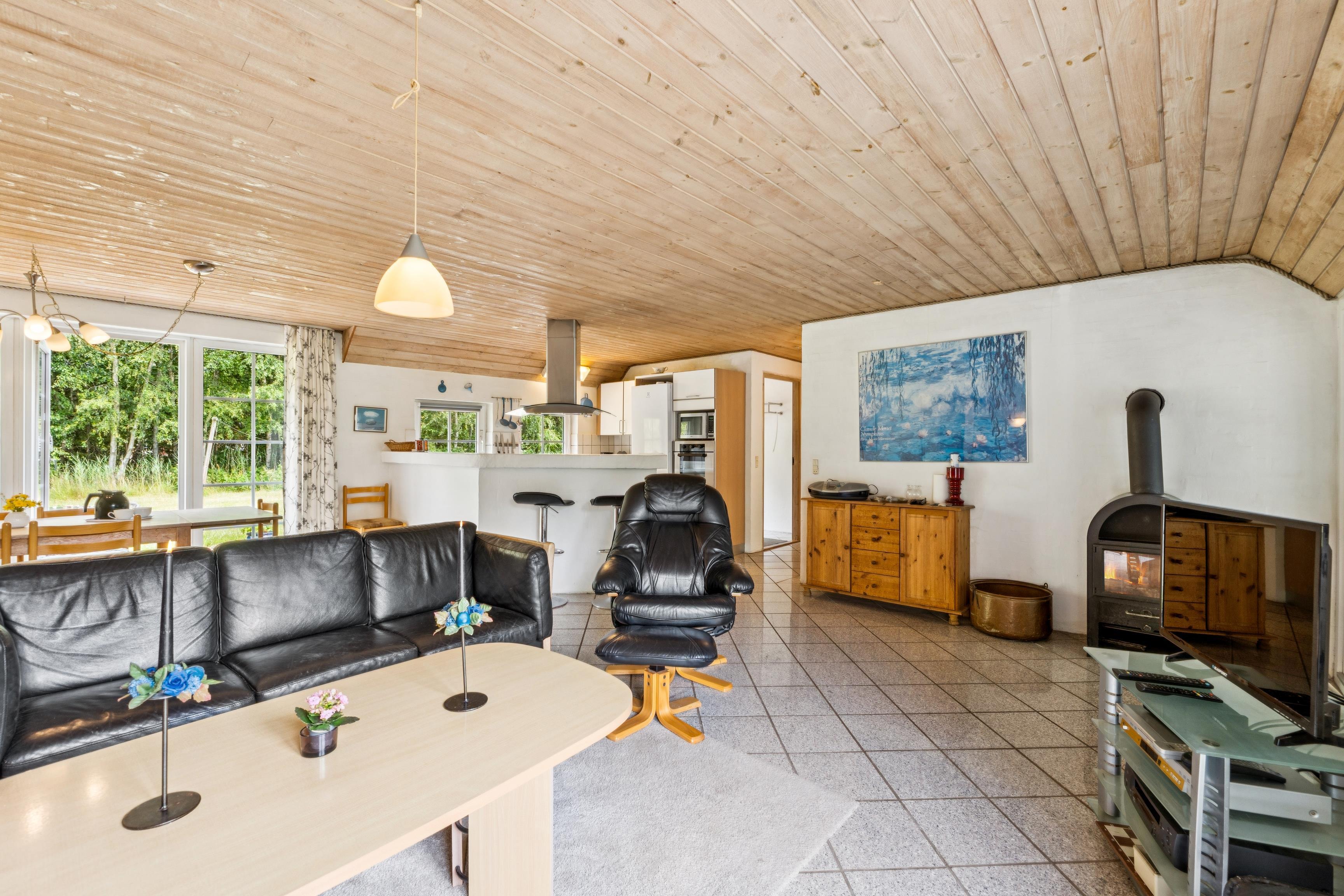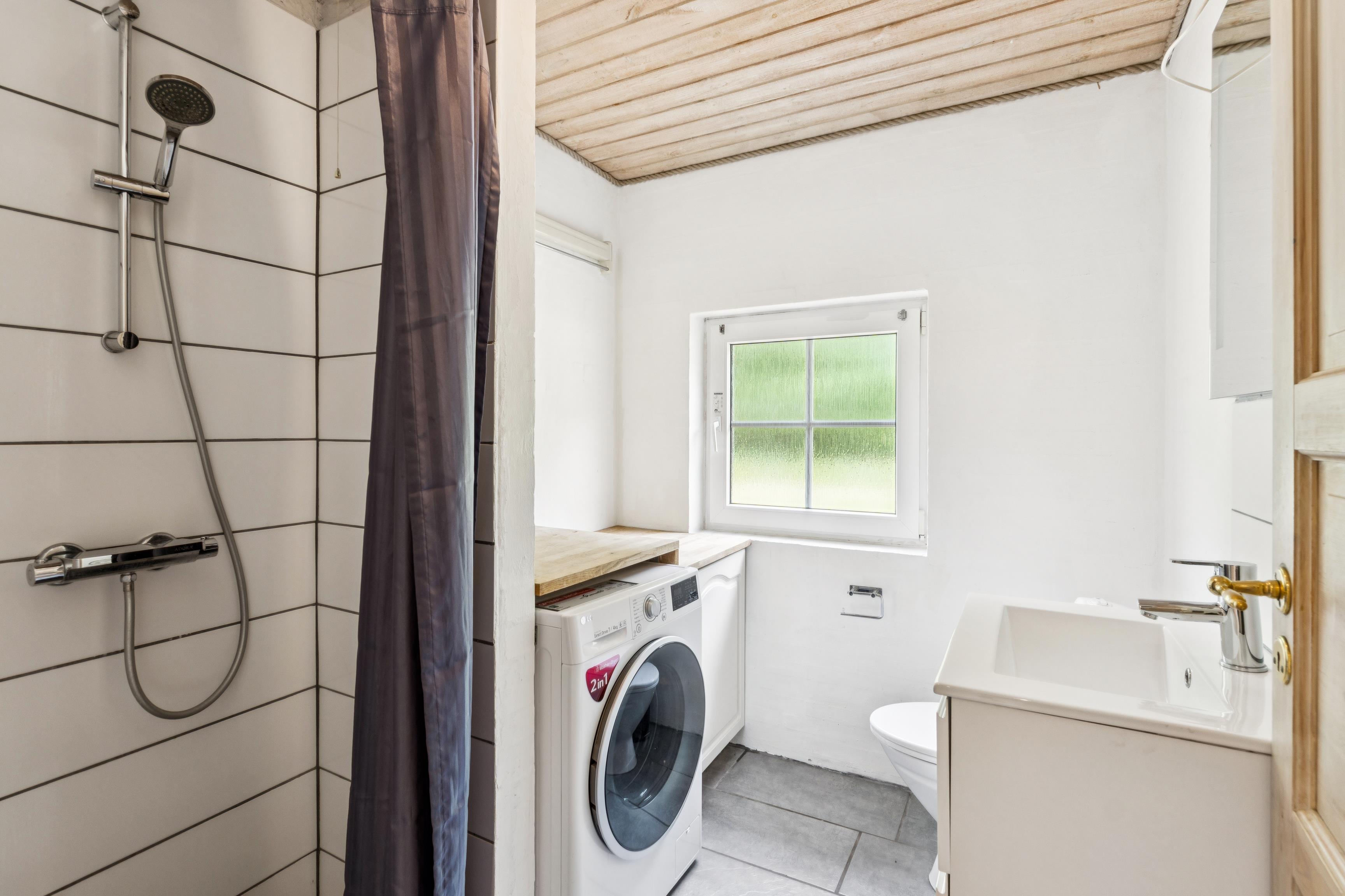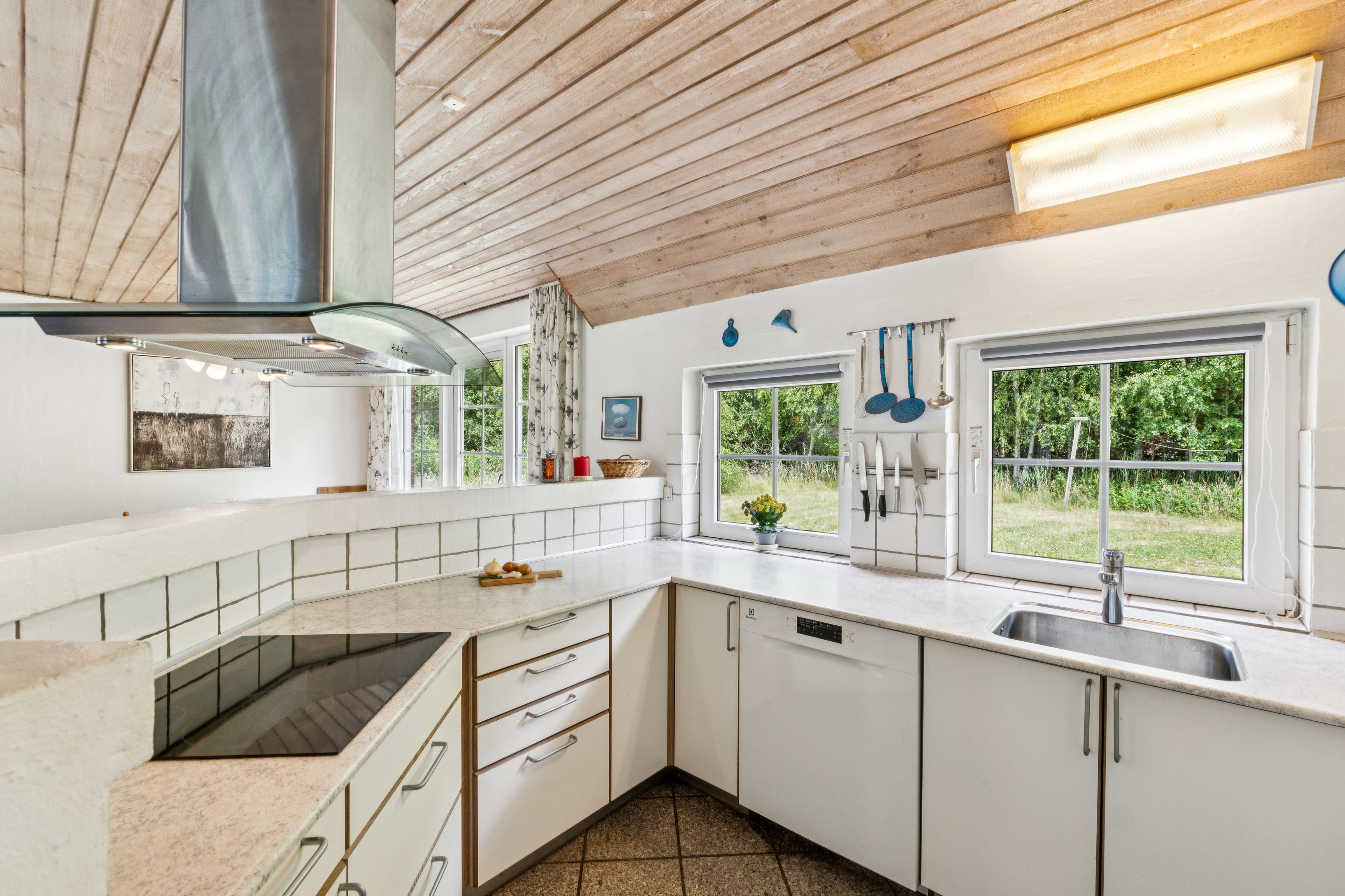 Køkkenet har et køleskab, fire keramiske kogeplader, en ovn, mikrobølgeovn og opvaskemaskine. Huset rummer desuden to badeværelser med bruseniche og toiletter, hvoraf begge badeværelser har gulvvarme. Saunaen er det perfekte sted at slappe af efter en dag ude.