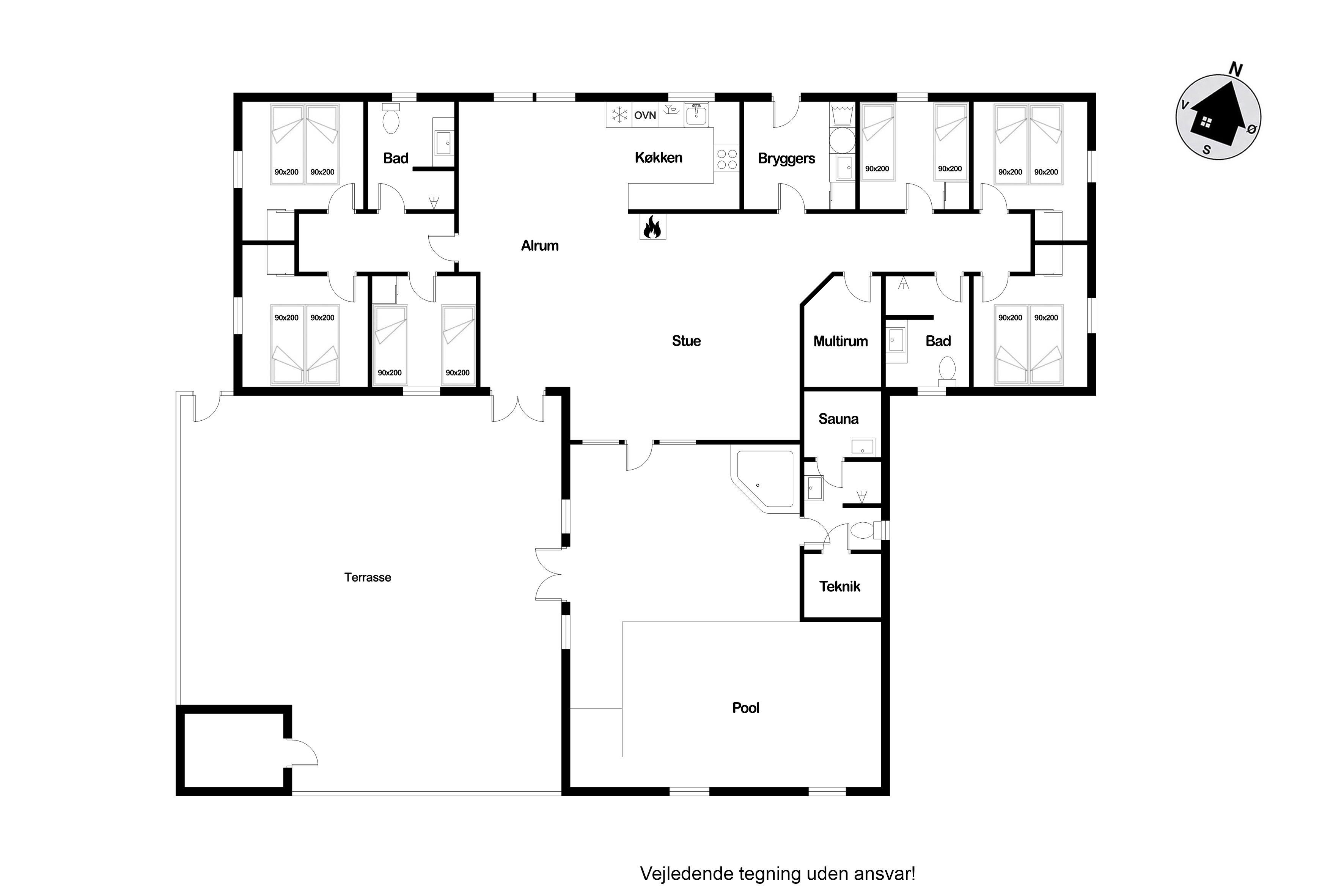 Huset er indrettet med to værelsesafdelinger, hver med 3 værelser, hvilket sikrer komfort og privatliv. De 3 badeværelser, udstyret med bruseniche, toilet, håndvask og gulvvarme, er placeret strategisk i hver værelsesfløj samt i forbindelse med poolrummet.