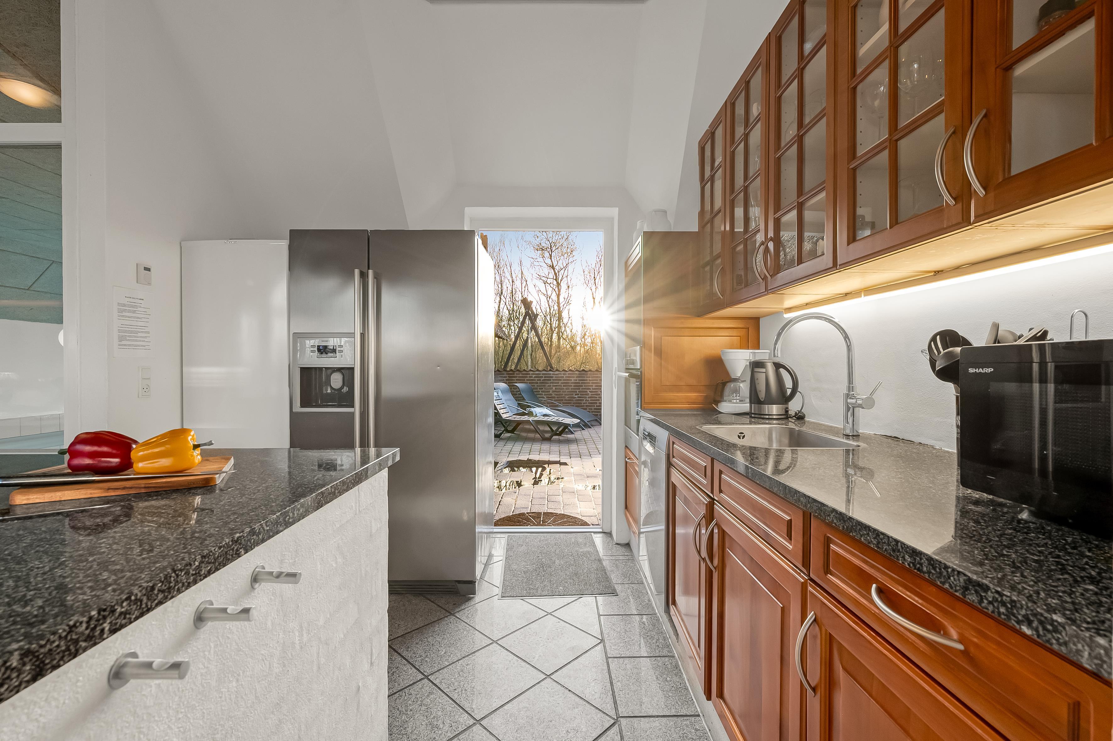 Hvis du ønsker at køle af, kan du tage et dyp i den private pool, som også har en vandrutsjebane – perfekt til både børn og voksne, der ønsker at have det sjovt. I poolrummet er der også et nedsænket spabad, der kan rumme op til 7 personer. Fra det ene badeværelse, som ligger i forbindelse med poolrummet, er der adgang til en en infrarød sauna, hvor du kan slappe af efter en lang dag med aktiviteter.