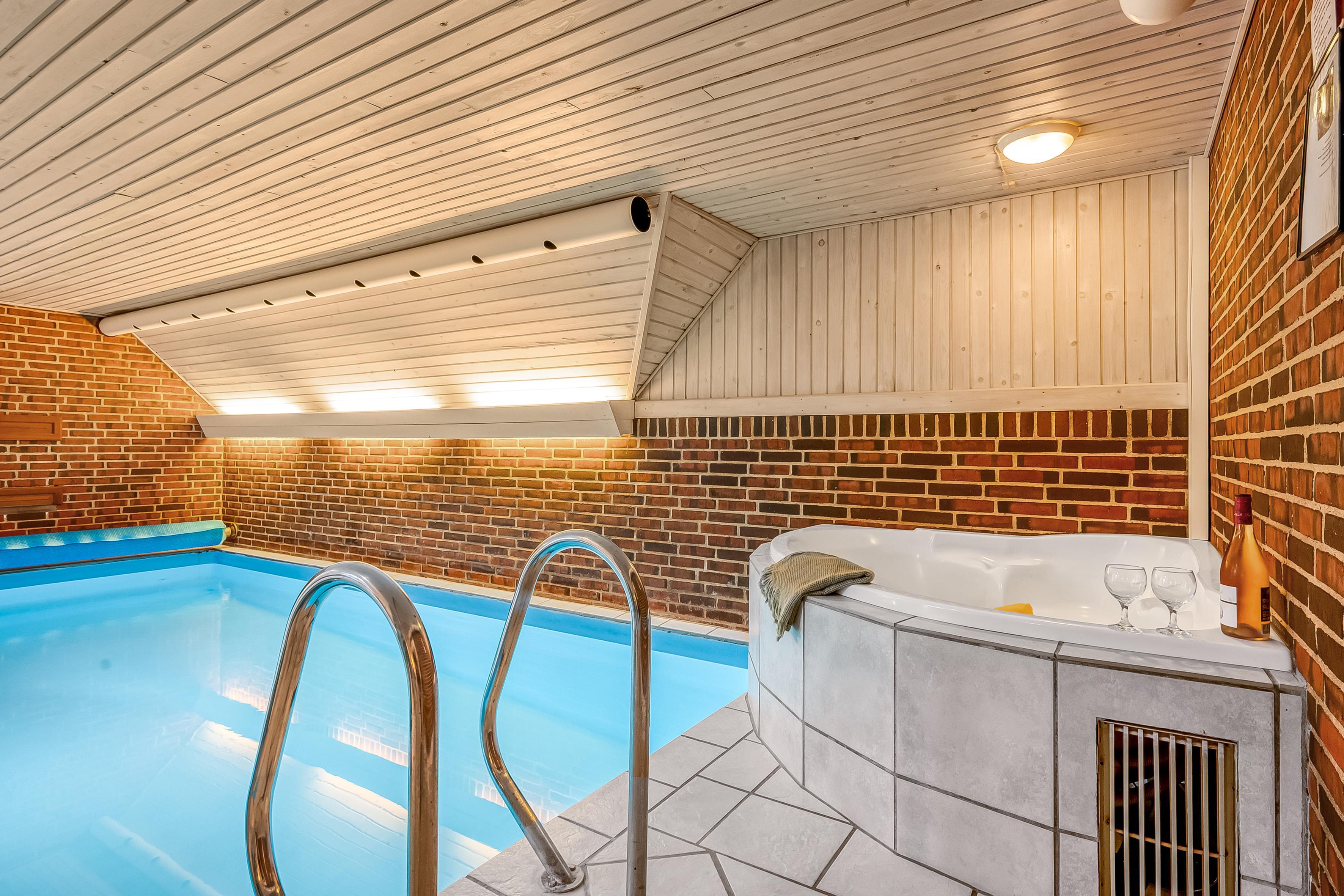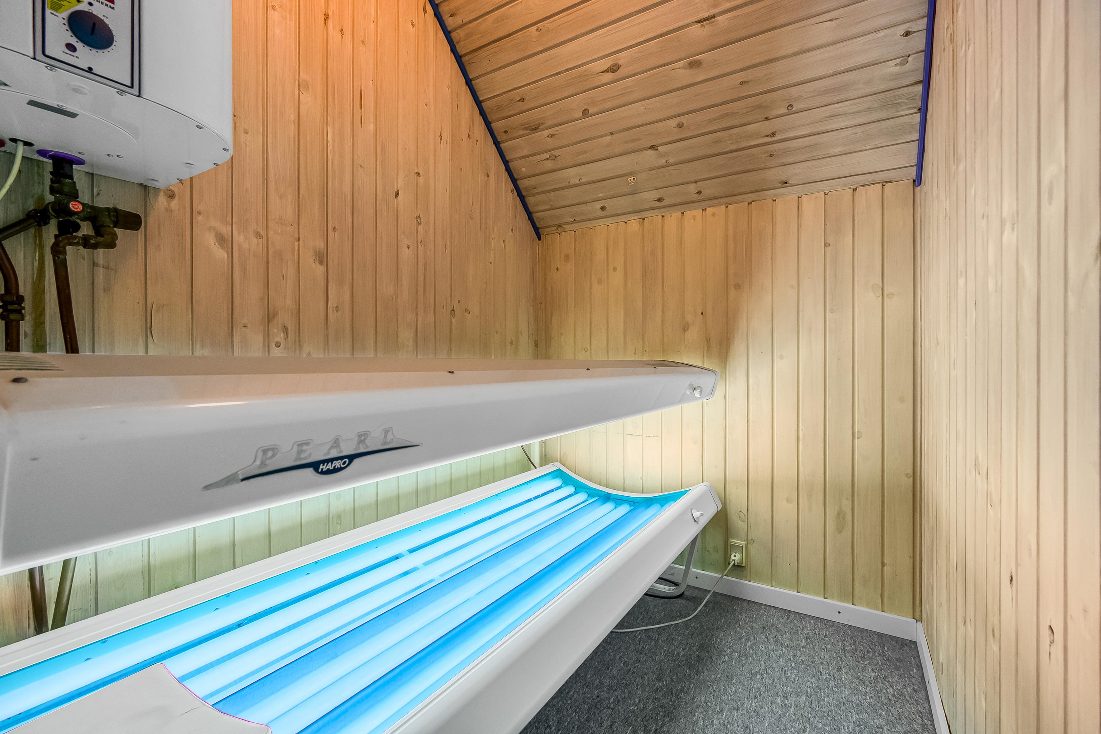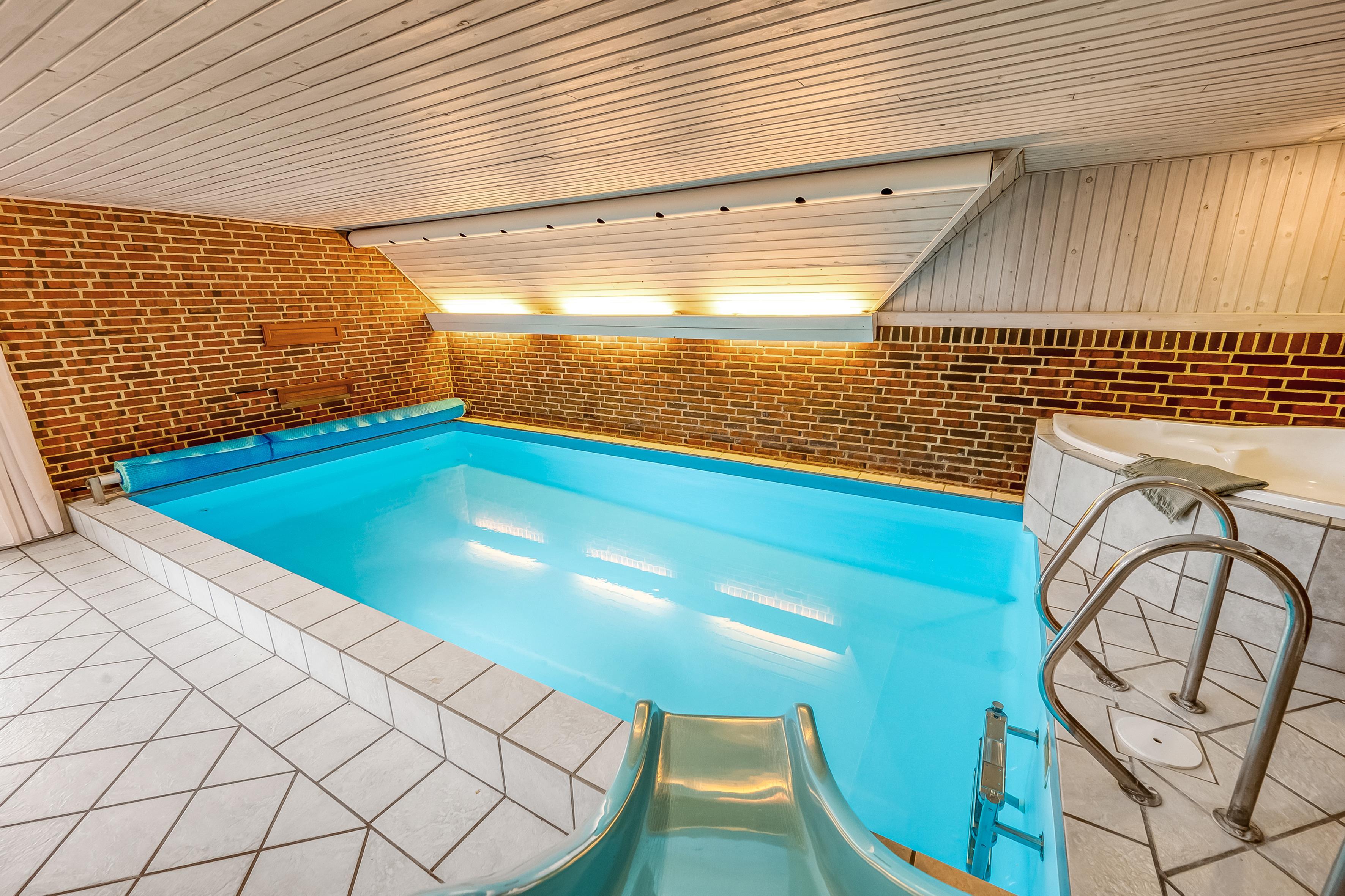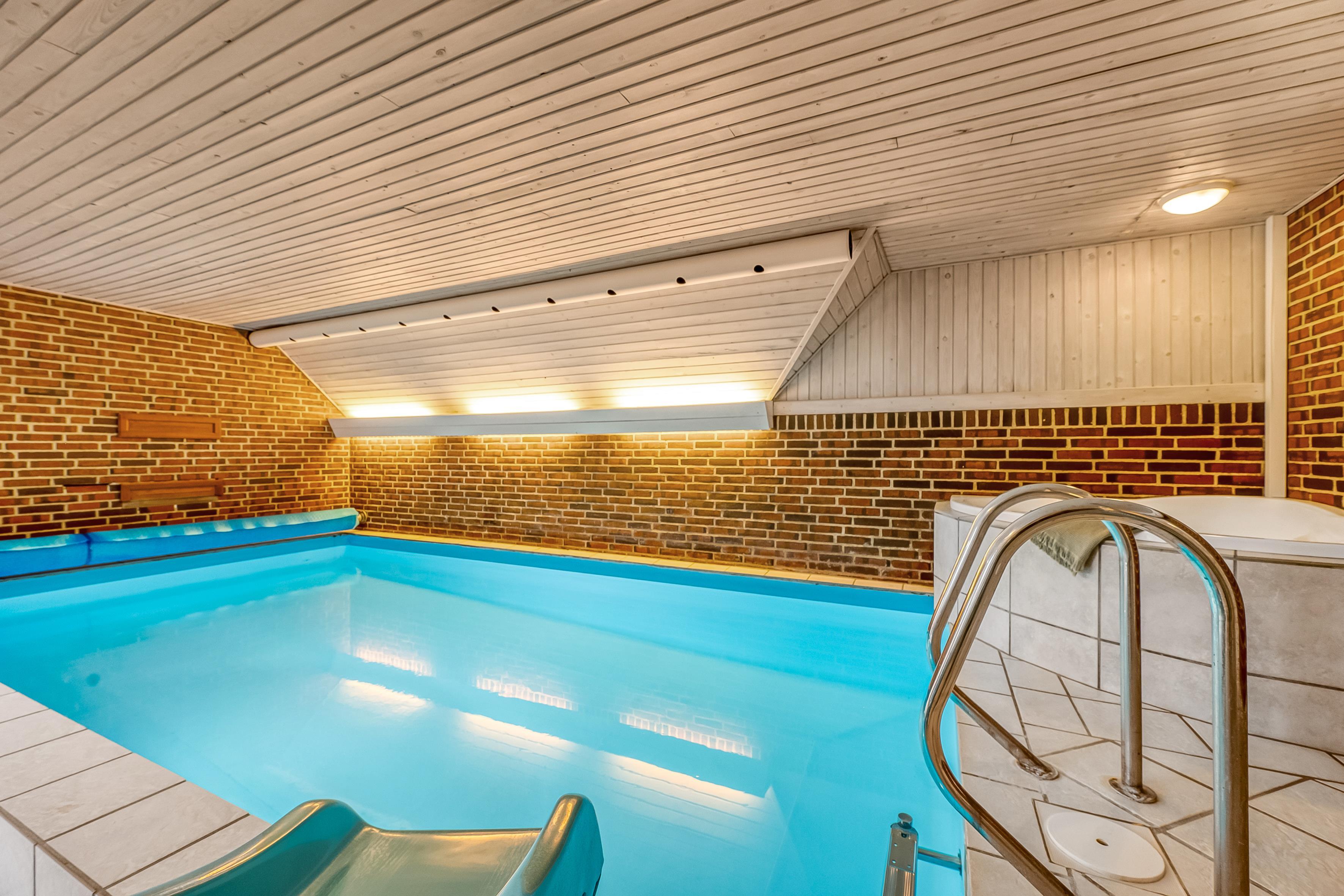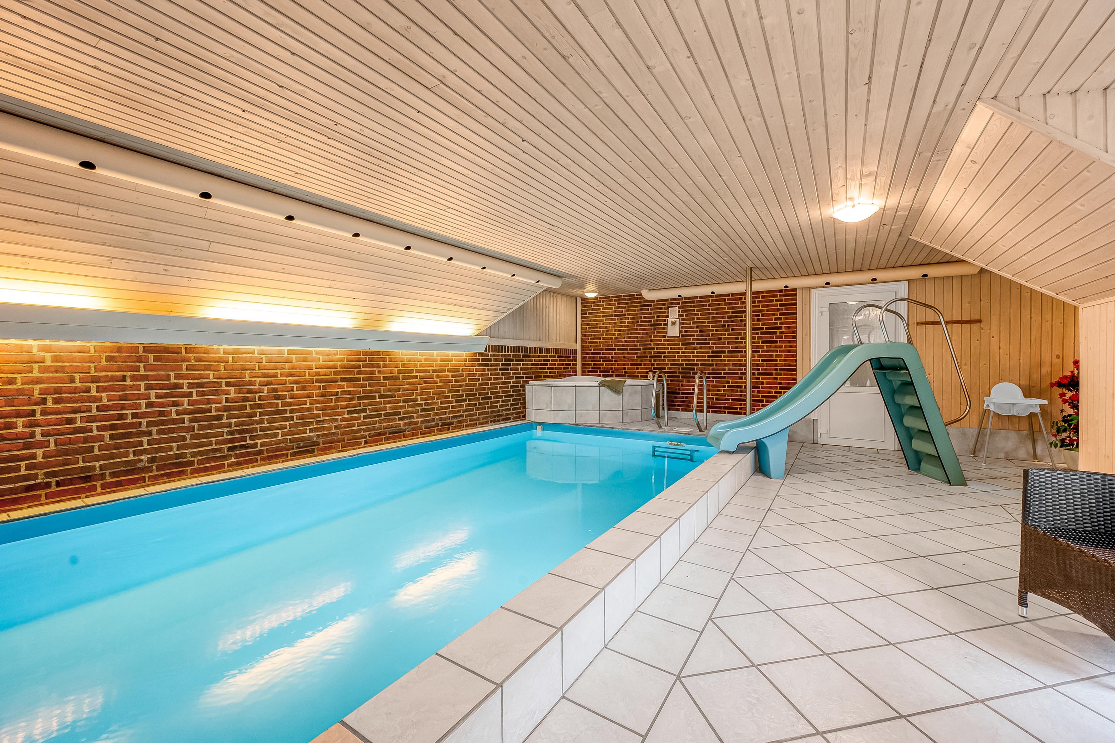 Udenfor kan du nyde den overdækkede terrasse, hvor du kan grille og spise sammen, mens børnene leger på gyngerne, rutsjebanen eller i sandkassen. Det store poolrum er med en 19 kvadratmeter stor pool med vandrutsjebane, samt et spabad, der kan rumme to personer, giver mulighed for sjov og afslapning for hele familien. For dem, der ønsker at forkæle sig selv, er der også en sauna og et solarium til rådighed.