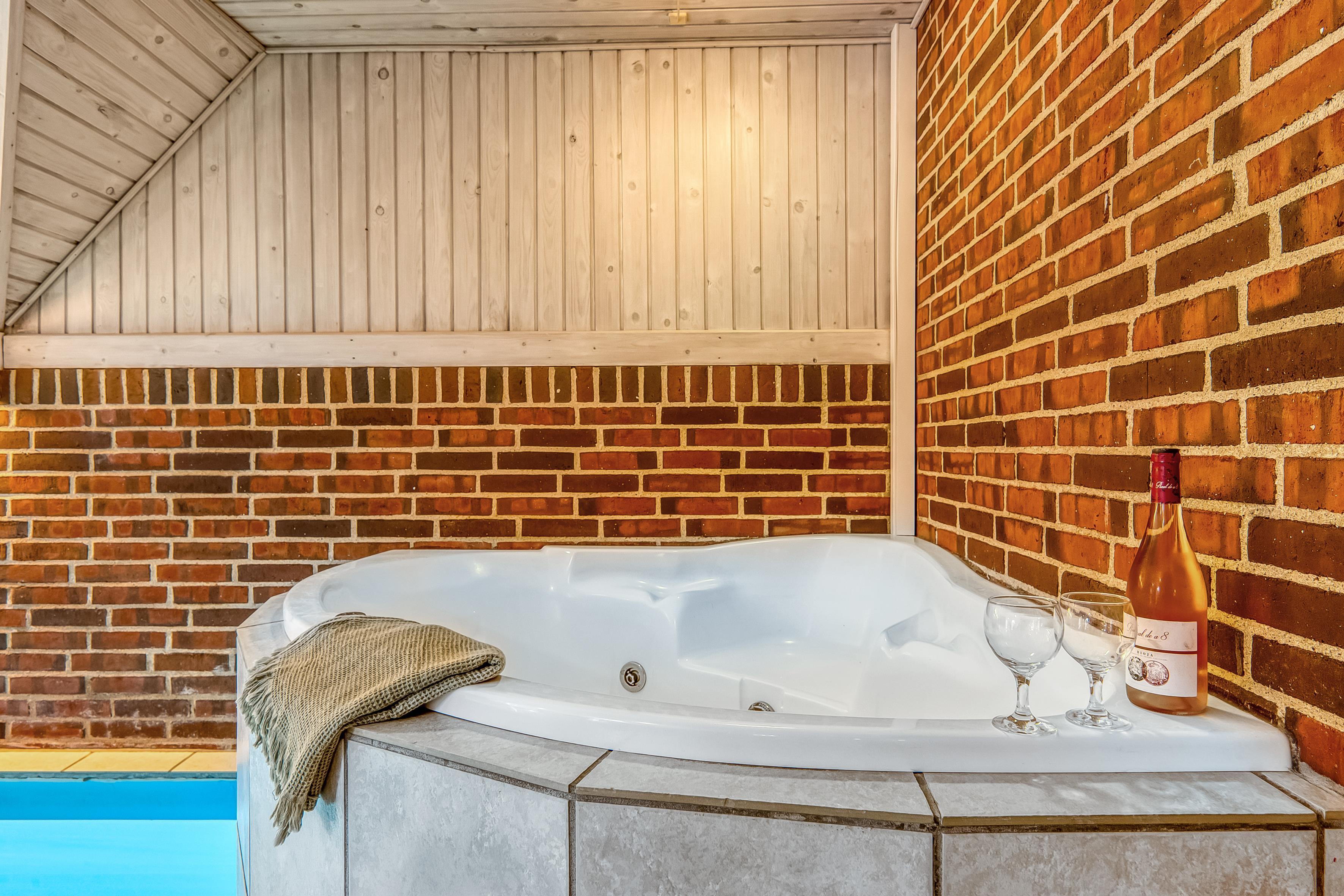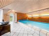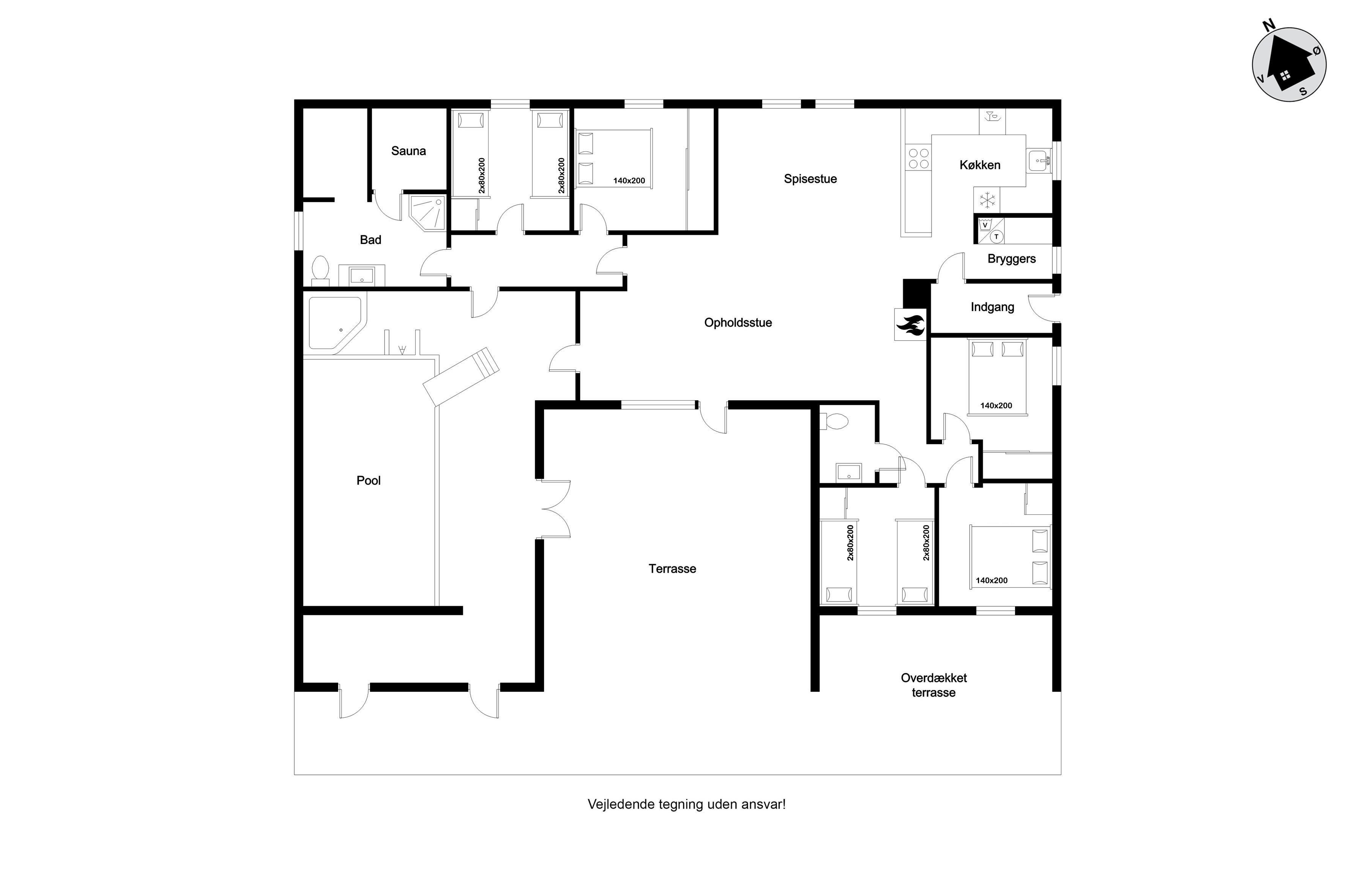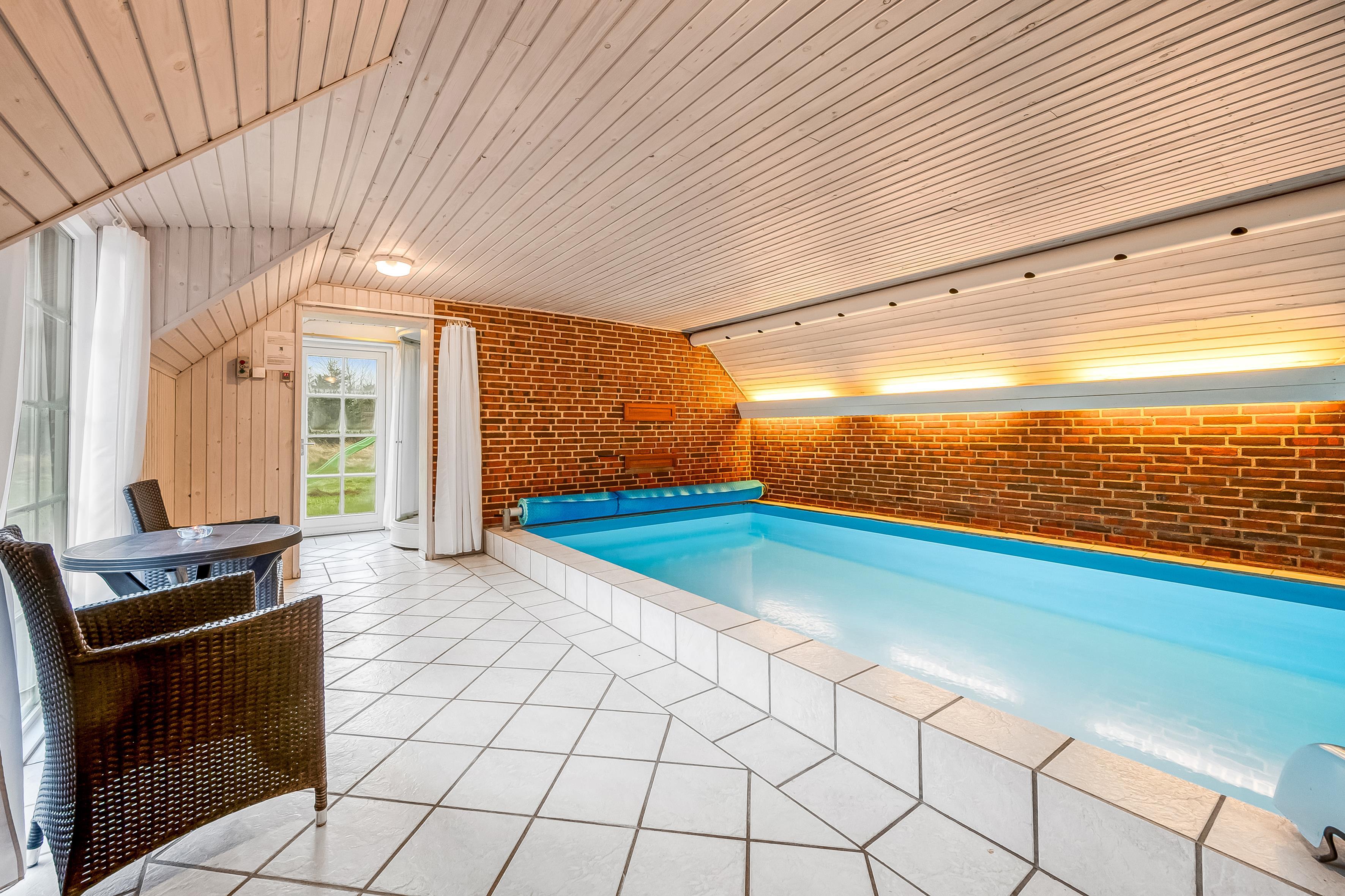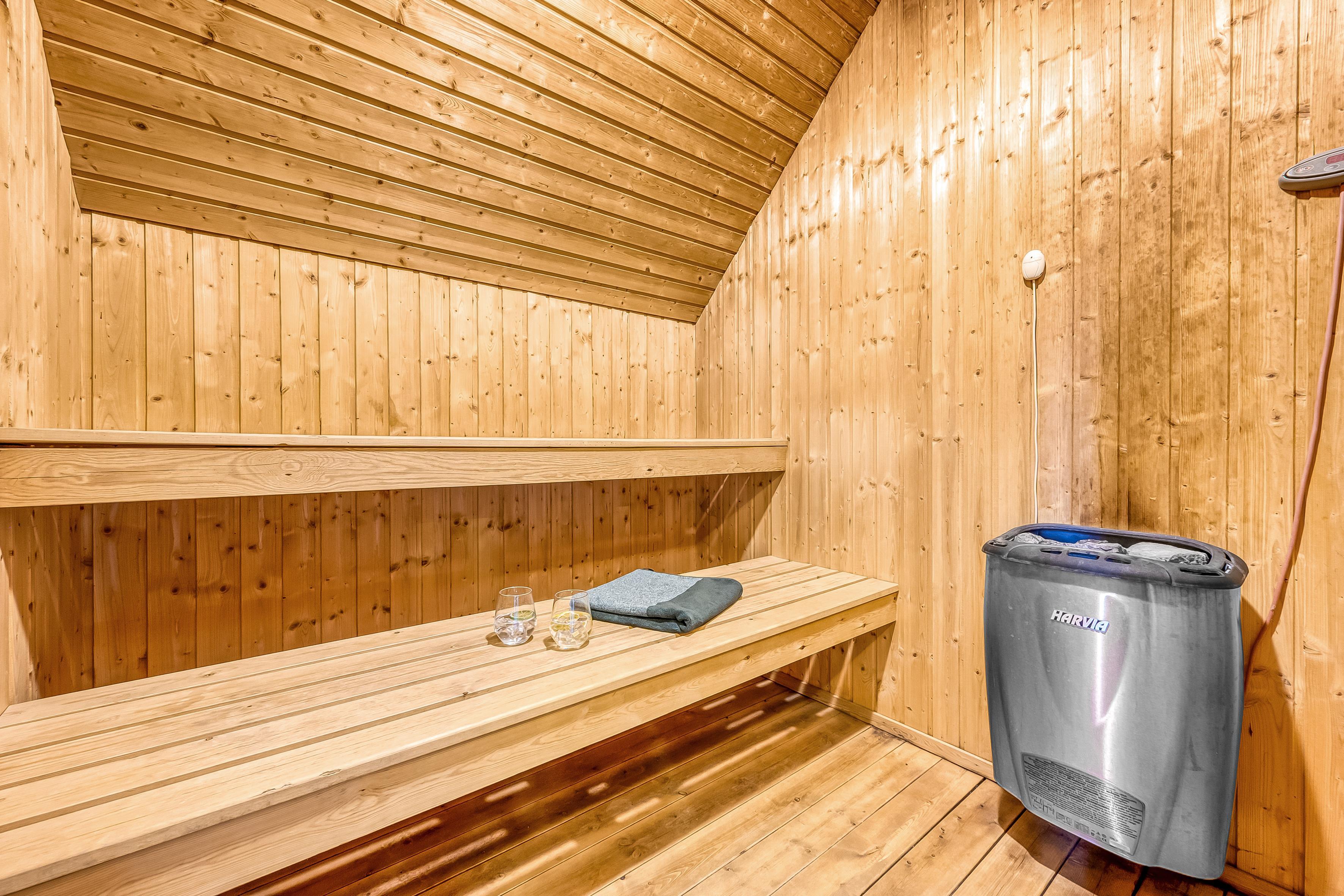 Udenfor kan du nyde den overdækkede terrasse, hvor du kan grille og spise sammen, mens børnene leger på gyngerne, rutsjebanen eller i sandkassen. Det store poolrum er med en 19 kvadratmeter stor pool med vandrutsjebane, samt et spabad, der kan rumme to personer, giver mulighed for sjov og afslapning for hele familien. For dem, der ønsker at forkæle sig selv, er der også en sauna og et solarium til rådighed.