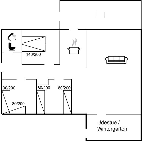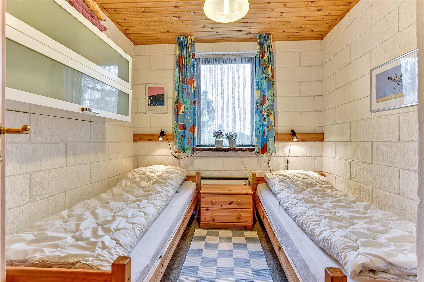 Der er i alt 3 soveværelser. Sovepladserne fordeler sig på: 2 sovepladser i dobbeltseng. 3 sovepladser i enkeltsenge.1 soveplads i køjeseng. Derudover er der 1 stk. barneseng.