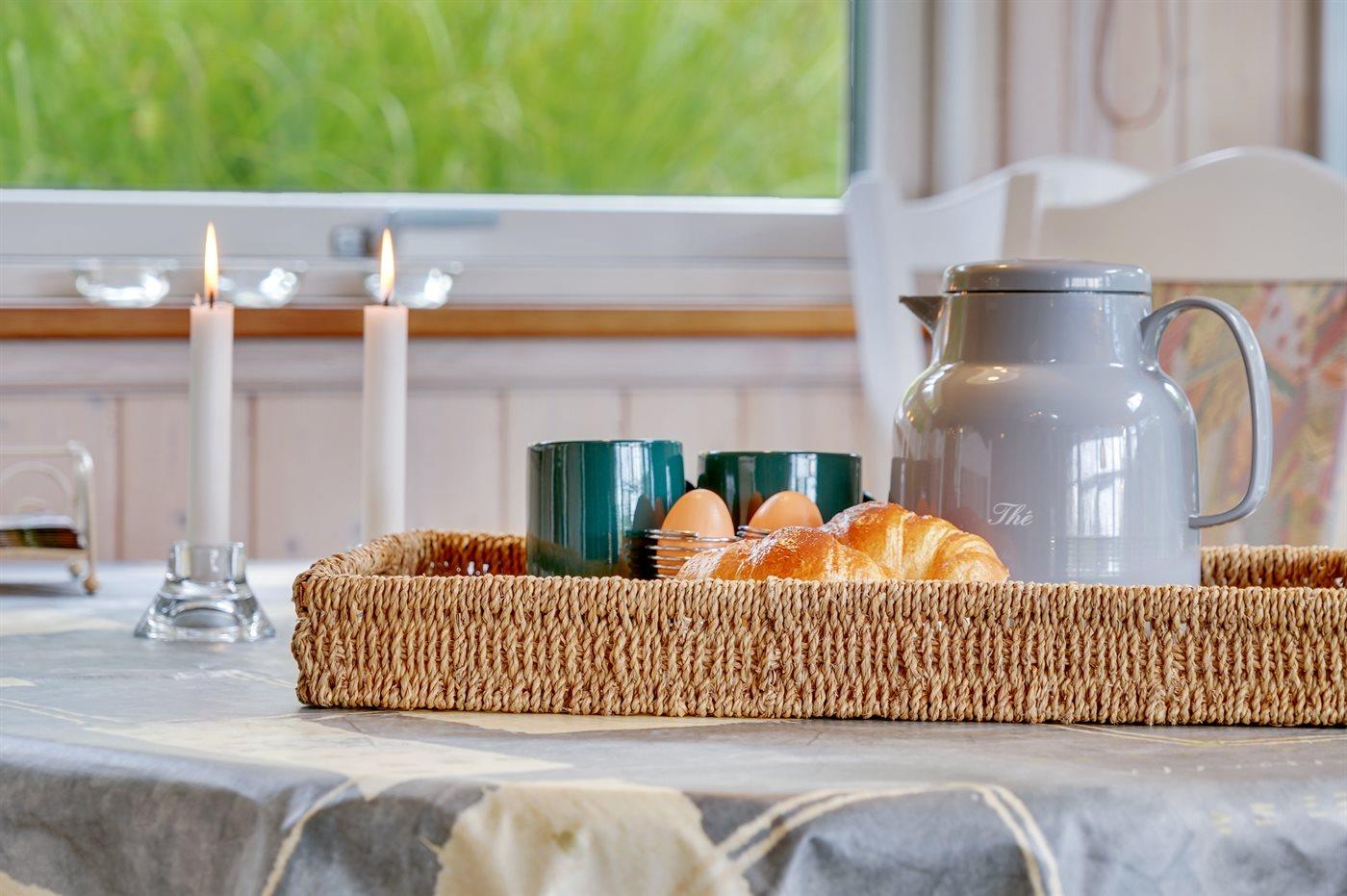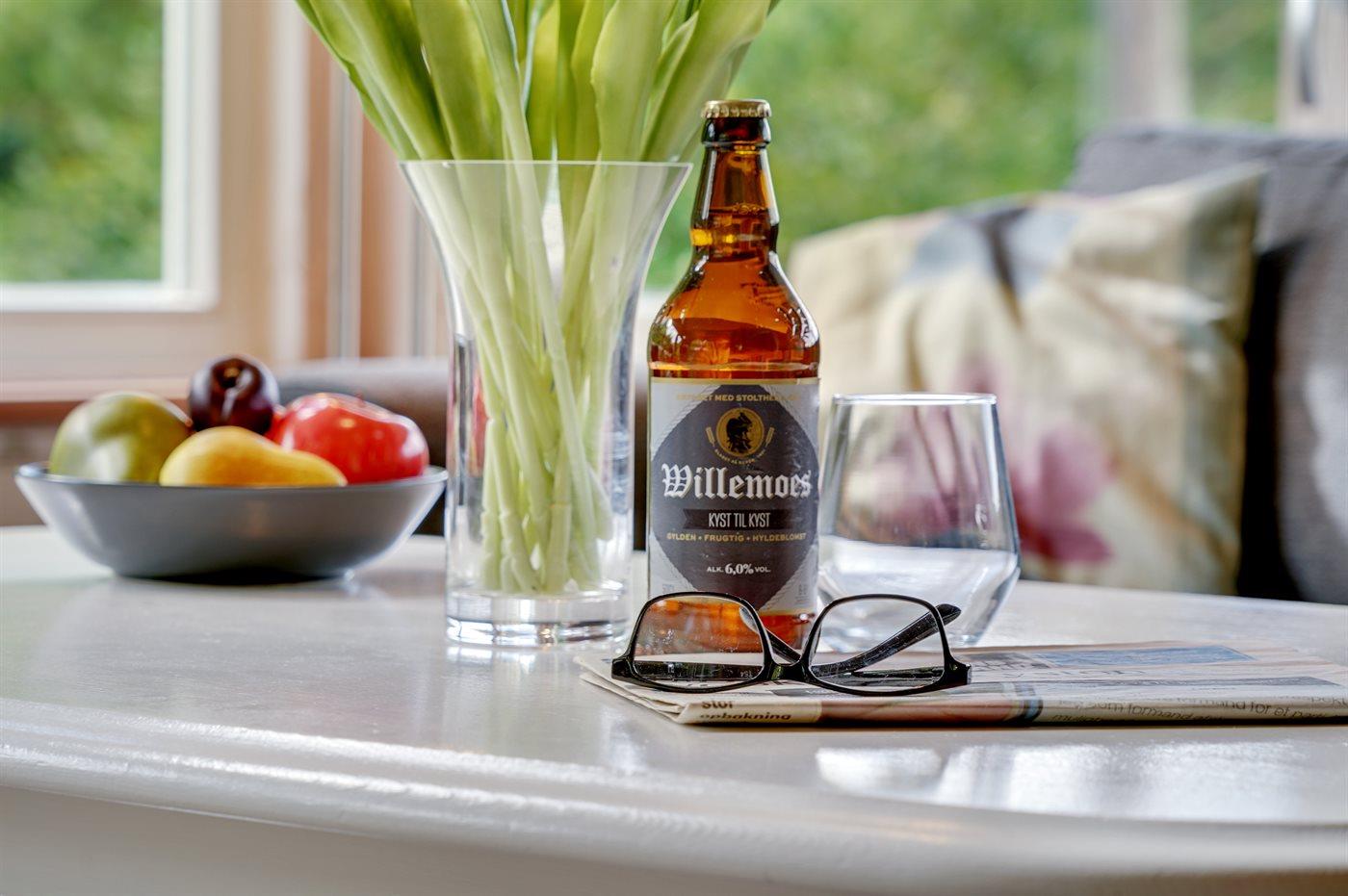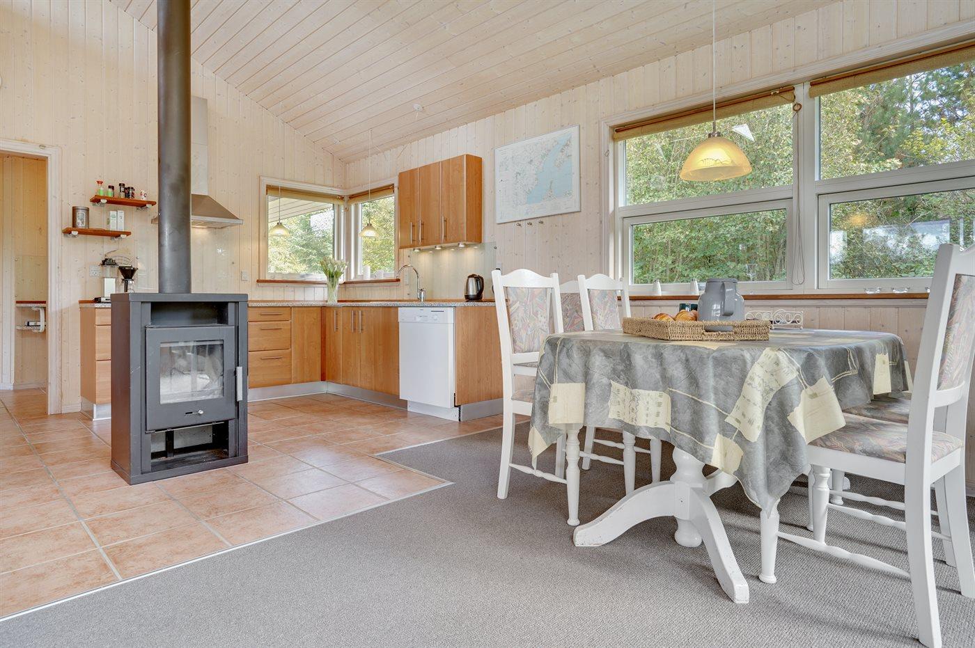 Køkkenet er udstyret med 1 køleskab. Der er 4 keramiske kogeplader, varmluftovn samt opvaskemaskine.