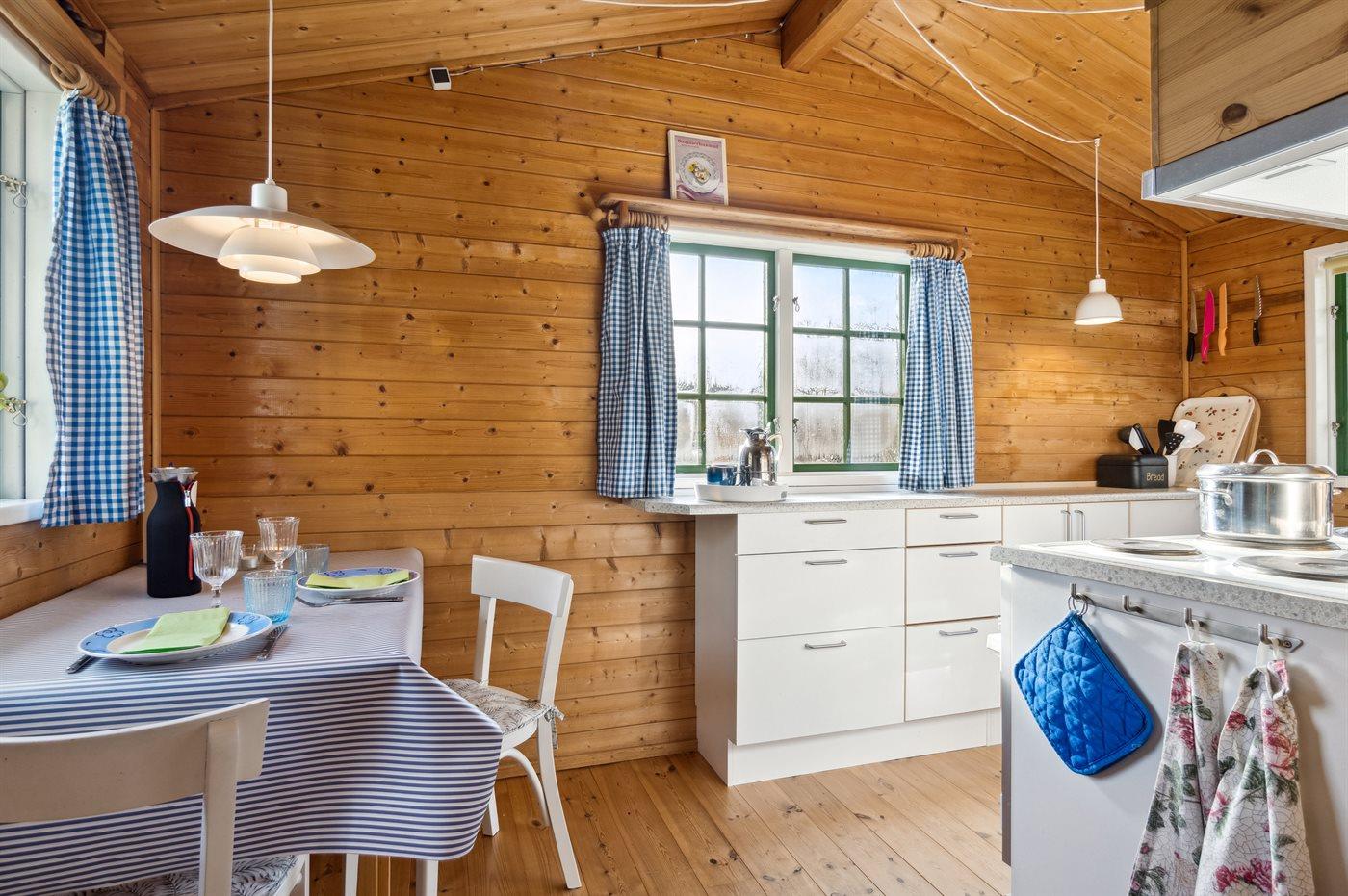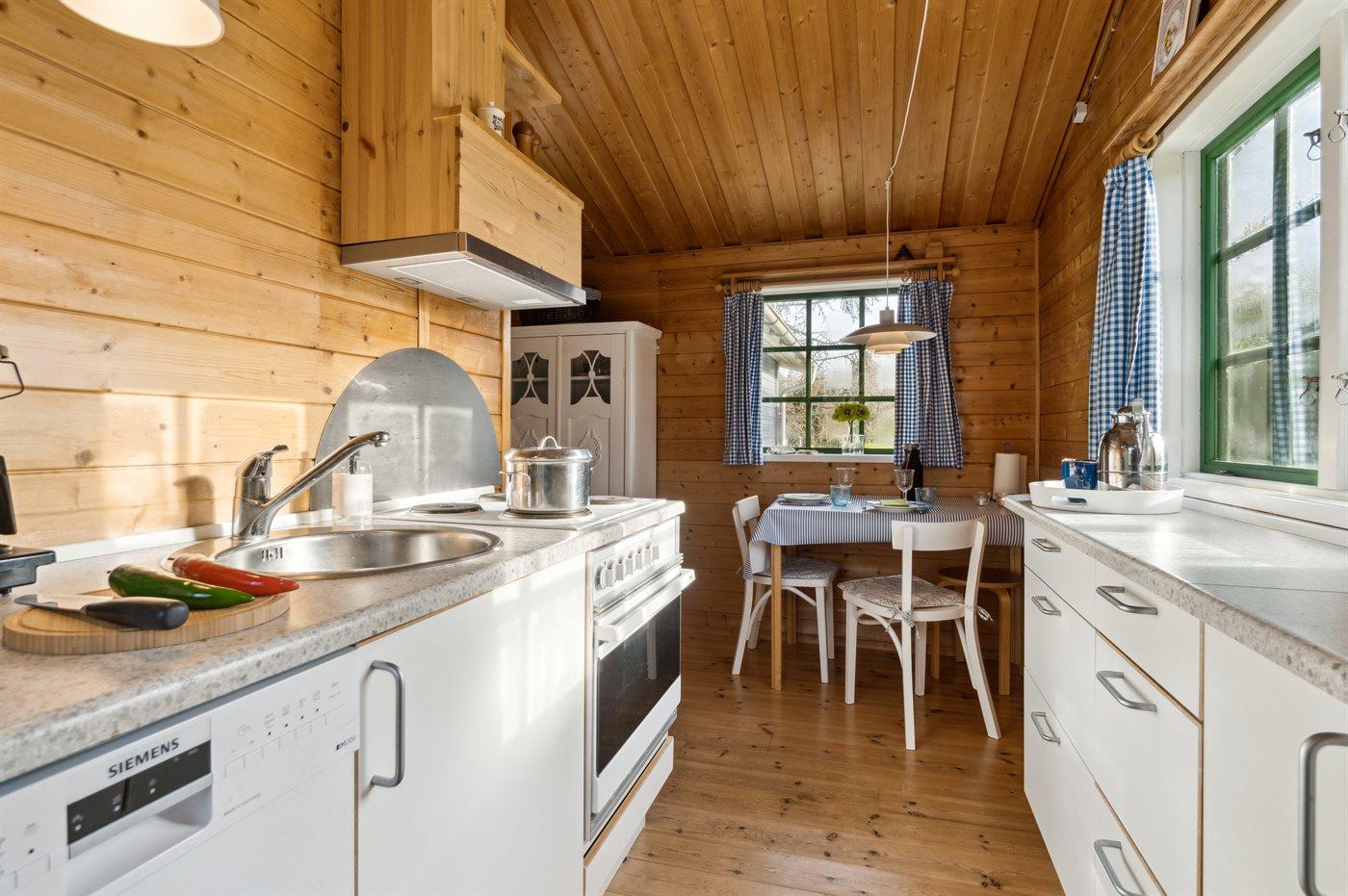 Køkkenet er udstyret med 1 køleskab. Der er 4 elkogeplader, varmluftovn, mikrobølgeovn samt opvaskemaskine.