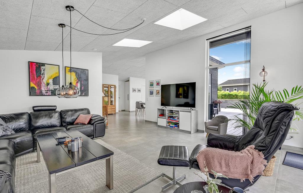 Den overdækkede træterrasse bliver en skøn ramme om jeres rolige stunder og en hyggelig grillmiddag. I vinterhalvåret kan I hygge jer indenfor i den lyse og hyggelige stue, mens aftensmaden trylles frem i det åbne køkken.