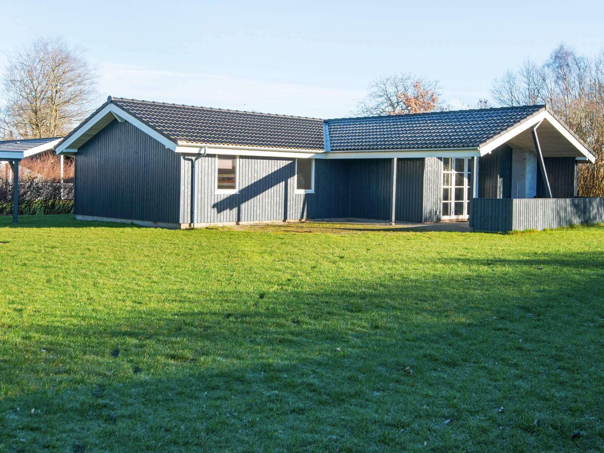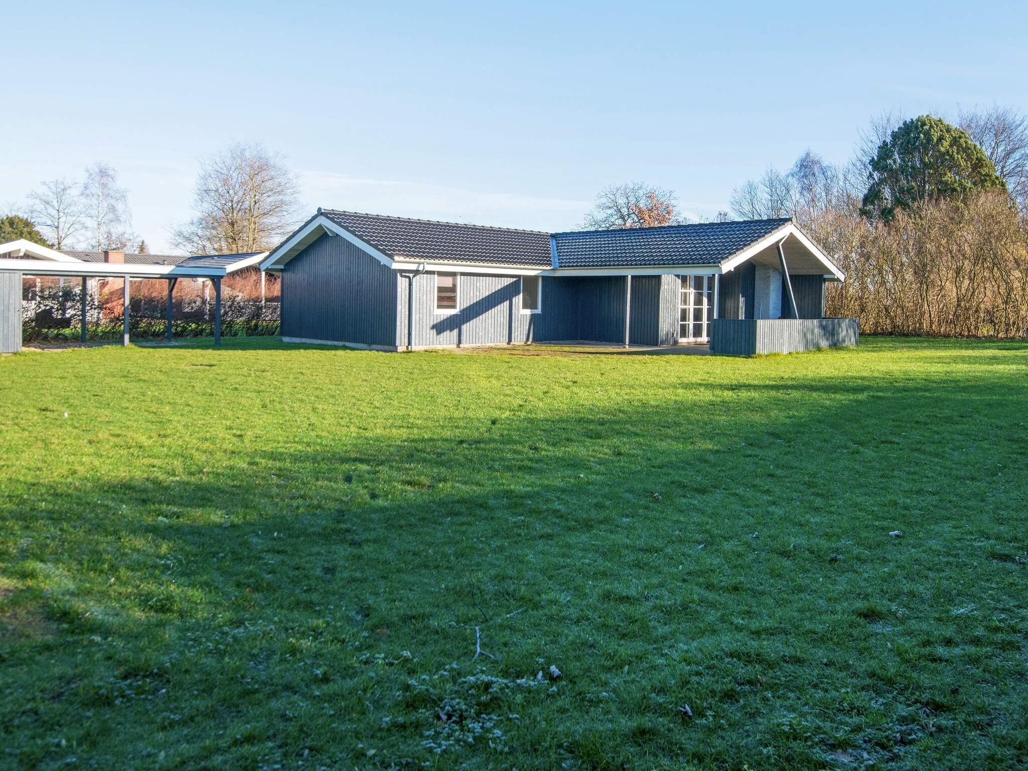 Familievenligt sommerhus nær Hvidbjerg strand med overdækket terrasse og have, perfekt til udendørs aktiviteter.