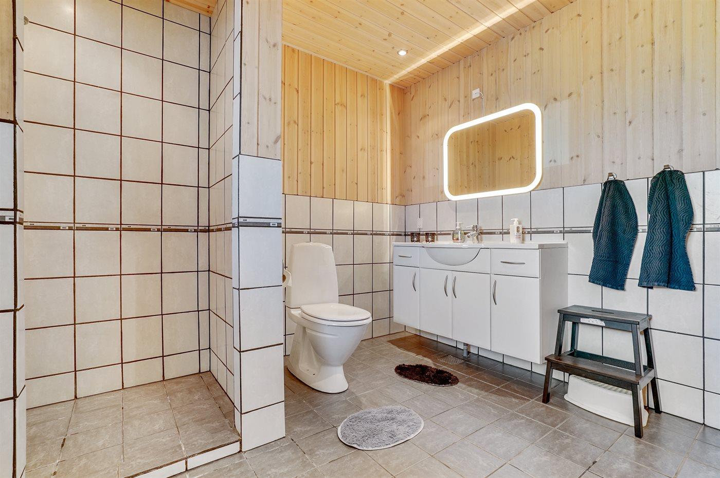 Der er 1 badeværelse med bruseniche og 2 toiletter, heraf 1 gæstetoilet. Der er gulvvarme på 1 badeværelse.