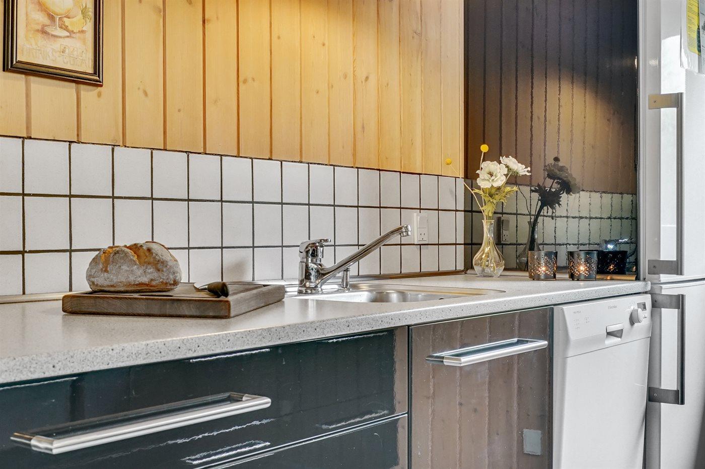 Køkkenet er udstyret med 1 køleskab. Der er 4 keramiske kogeplader, varmluftovn, mikrobølgeovn samt opvaskemaskine.