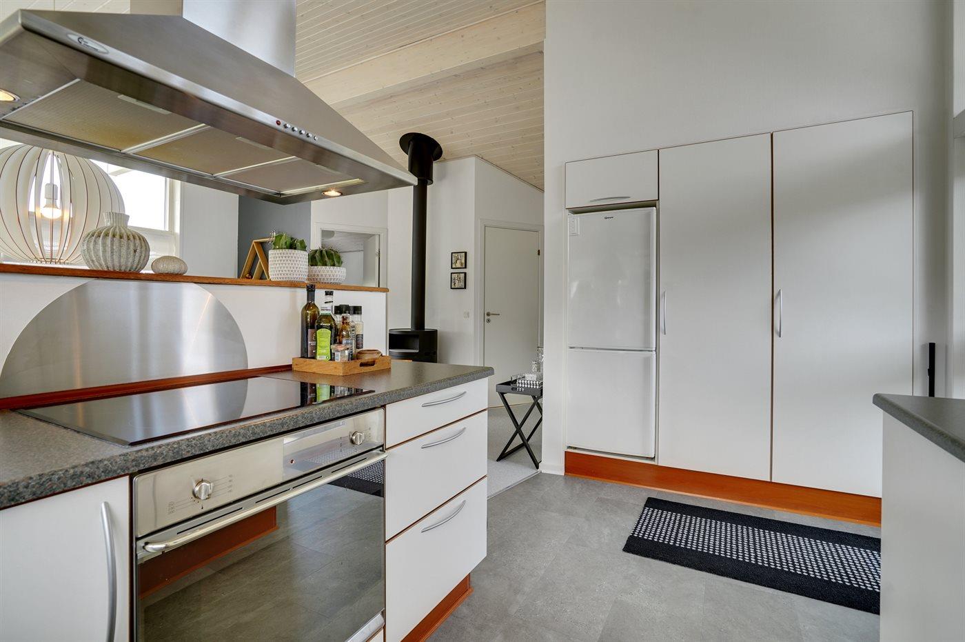 Køkkenet er udstyret med 1 køleskab. Der er 4 keramiske kogeplader, varmluftovn, mikrobølgeovn samt opvaskemaskine.