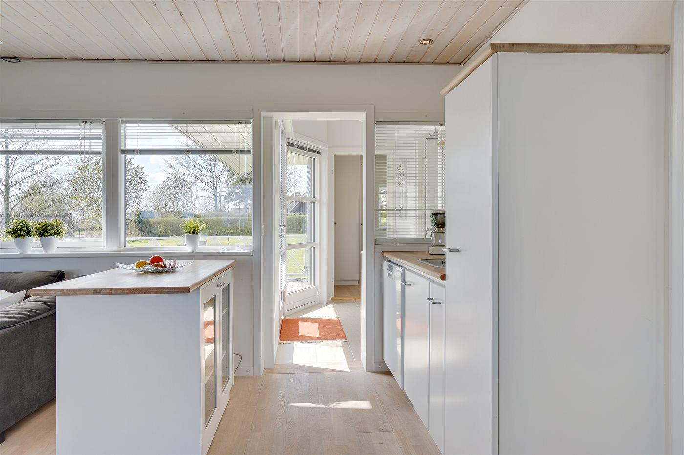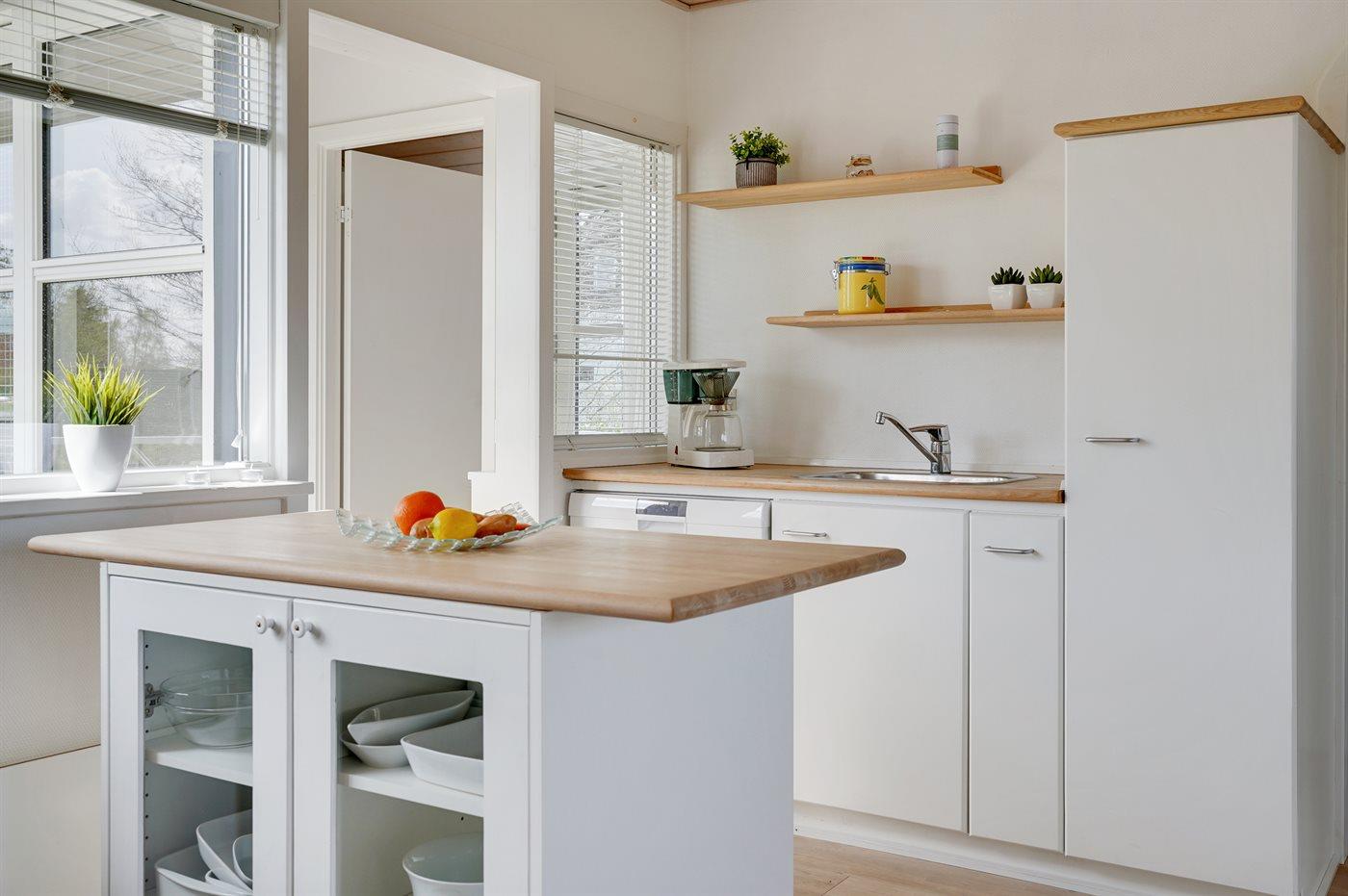 Køkkenet er udstyret med 1 køleskab. Der er 4 keramiske kogeplader, varmluftovn samt opvaskemaskine.