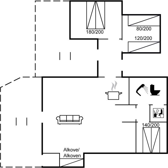 I sommerhuset er der 6 faste sovepladser fordelt på 3 værelser- det ene med udsigt til naturgrunden: 4 sovepladser i dobbeltsenge, 2 sovepladser i enkeltseng. 1-2 soveplads i alkove, der befinder sig i stuen, som er bedst egnet til børn (4-12 år).
