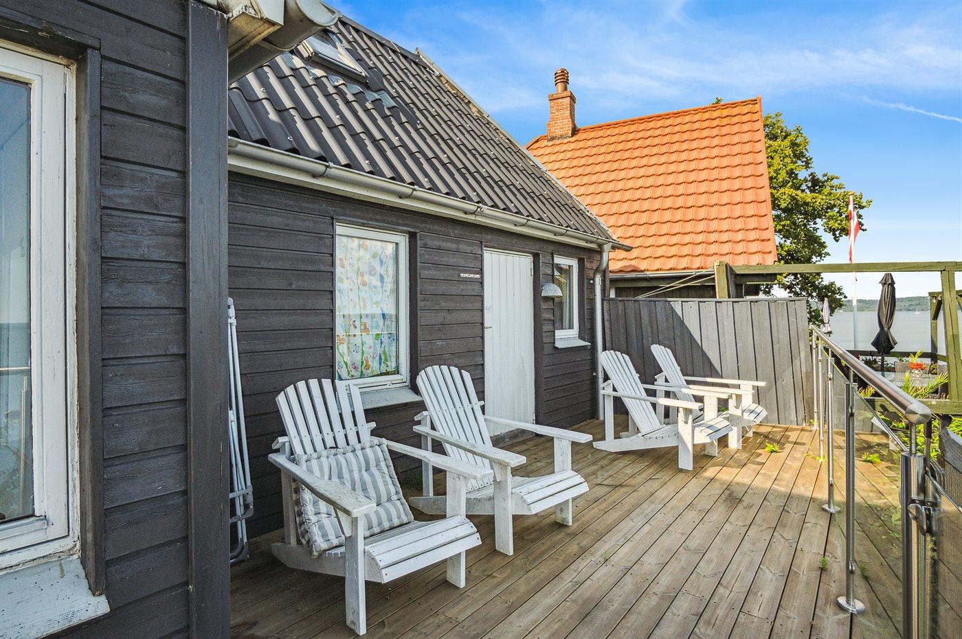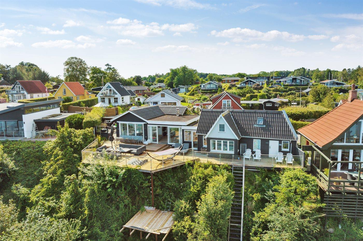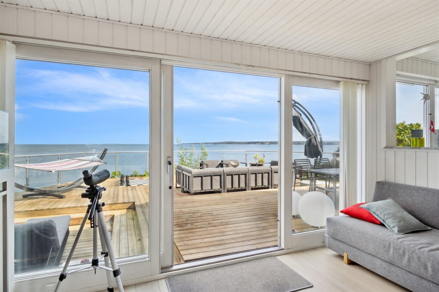Dette skønne og meget velholdte sommerhus har en beliggenhed, som er svær at beskrive med ord og svær at finde bedre. Sommerhuset ligger helt ude i vandkanten højt hævet over fjorden, hvilket giver en enestående og bjergtagende udsigt i hvilken retning, blikket end vandrer. Husets beliggenhed er med andre ord en særdeles unik kombination af panoramaudsigt over fjorden og det smukke landskab. Man kan sidde på den fantastiske terrasse i de dejlige havemøbler med et glas vin eller en kop kaffe og med få skridt nå fjorden, som har en fin sandbund.