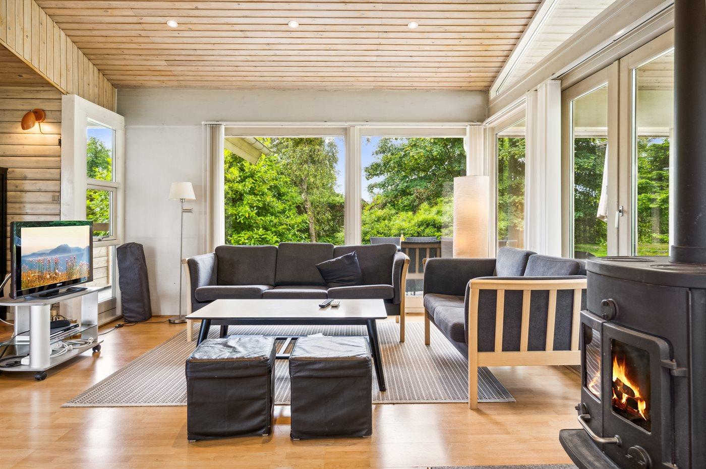 Indvendigt fremstår feriehuset lyst og indbydende med en rigtig god planløsning og her er masser af plads den store stue med åben køkken/alrum integreret, så boligen er oplagt til f.eks. en familie med 2-3 børn eller der er mulighed for at tage bedsteforældre med på ferie. Den skønne have er et herligt sted at opholde sig. Grunden er fuldstændig ugenert med træer og buske, som er vokset op, og her er god plads til, at børn kan boltre sig på den store græsplæne. Sommerhuset har et skønt terrasseareal, som også delvist er overdækket. Herfra kan stilheden nydes i fulde drag, og der er altid mulighed for at finde en dejlig lækrog.