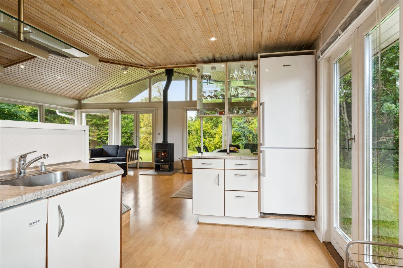 Køkkenet er udstyret med 1 køleskab. Der er 4 keramiske kogeplader, varmluftovn, mikrobølgeovn samt opvaskemaskine.