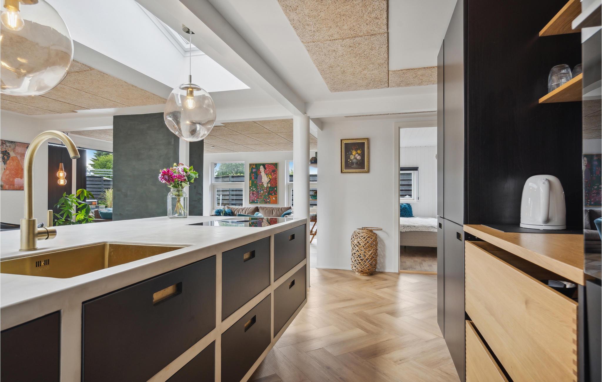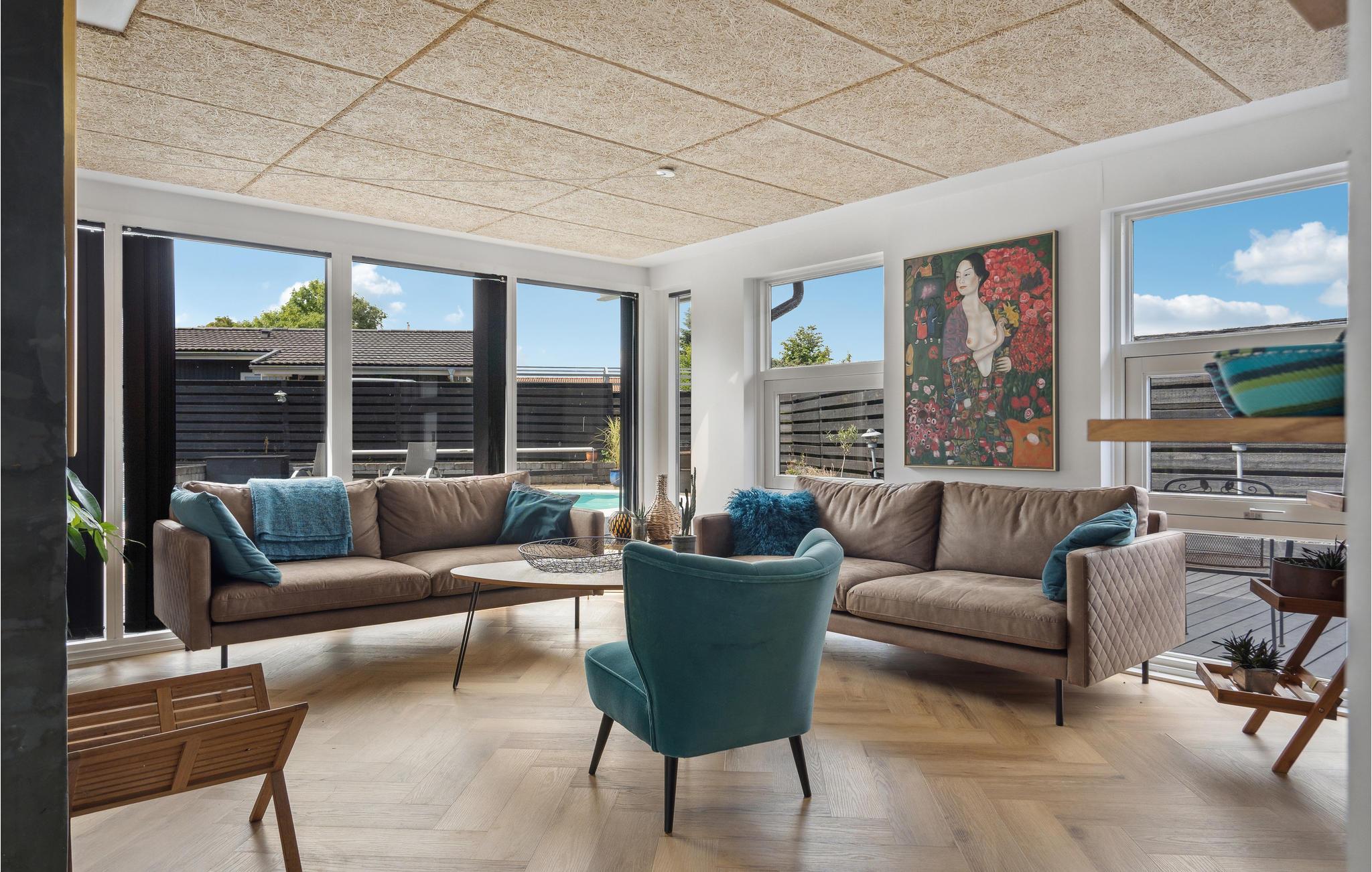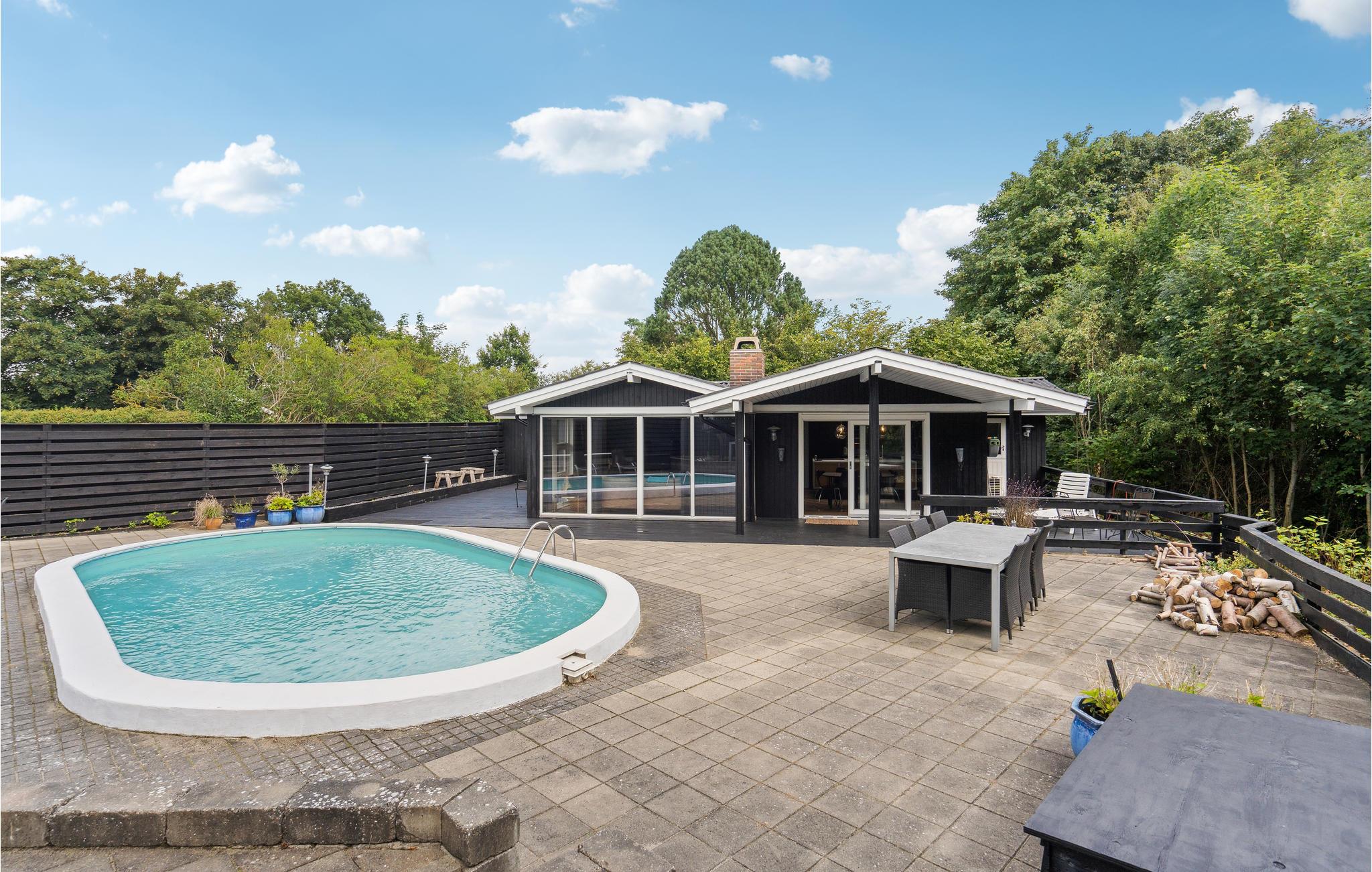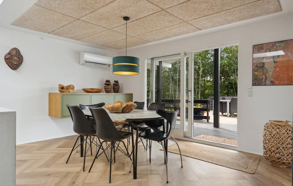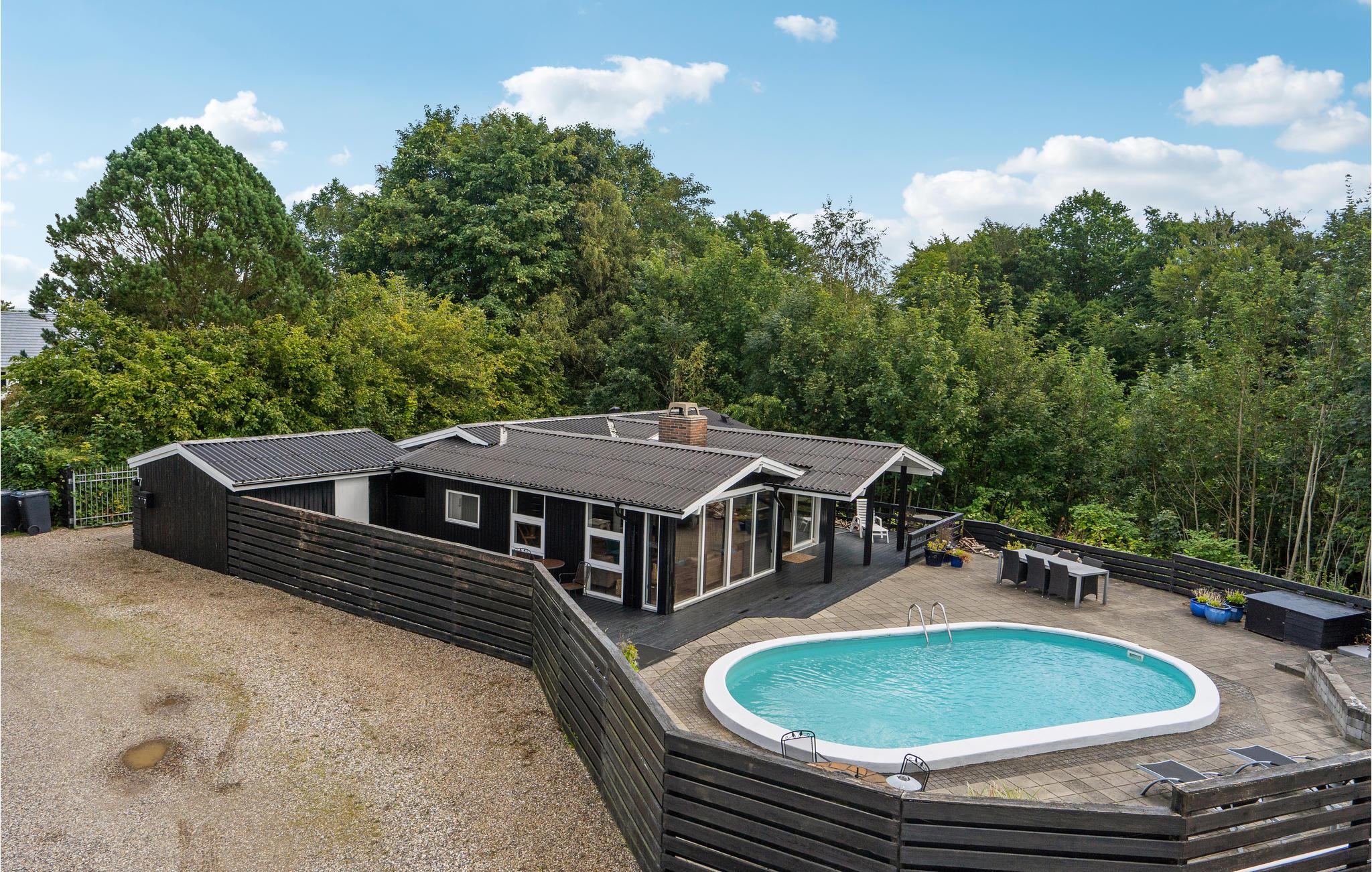 Velkommen til dette moderne og stilfulde feriehus i Hvidbjerg med privat swimmingpool og smuk udsigt over Vejle Fjord.