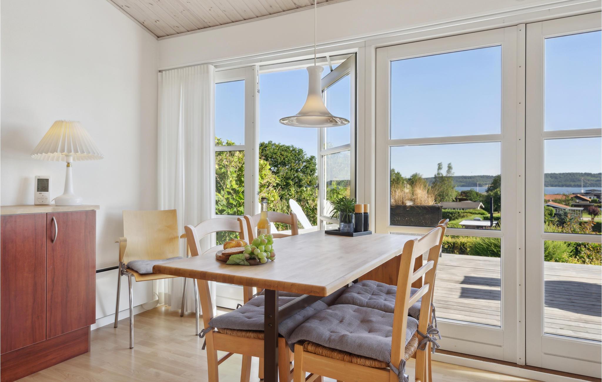 Dette feriehus ligger på en charmerende lille bakketop med en smuk udsigt over den sydlige del af Vejle Fjord. Huset byder på en lys og hjemlig atmosfære, og det store vinduesparti i stuen lukker en masse dagslys ind og skaber en følelse af harmoni. Nyd såvel dejlige familiemåltider med udsigt over vandet som også solnedgangen i den tilstødende hyggekrog med rattanmøbler. Sæt jer godt til rette på sofaen efter en begivenhedsrig dag og se en god film. Der er flere dejlige steder på grunden, hvor I kan nyde hyggelige timer. Nyd en kop kaffe på terrassen, når I kommer tilbage fra stranden. Inden da kan I skylle sandet af under den udendørs bruser. Mærk ferielykken strømme igennem jer, når I sidder i strandkurven. Lige om lidt breder duften af sydende grillmad sig rundt i haven. I morgen kan I gå ned til stranden.