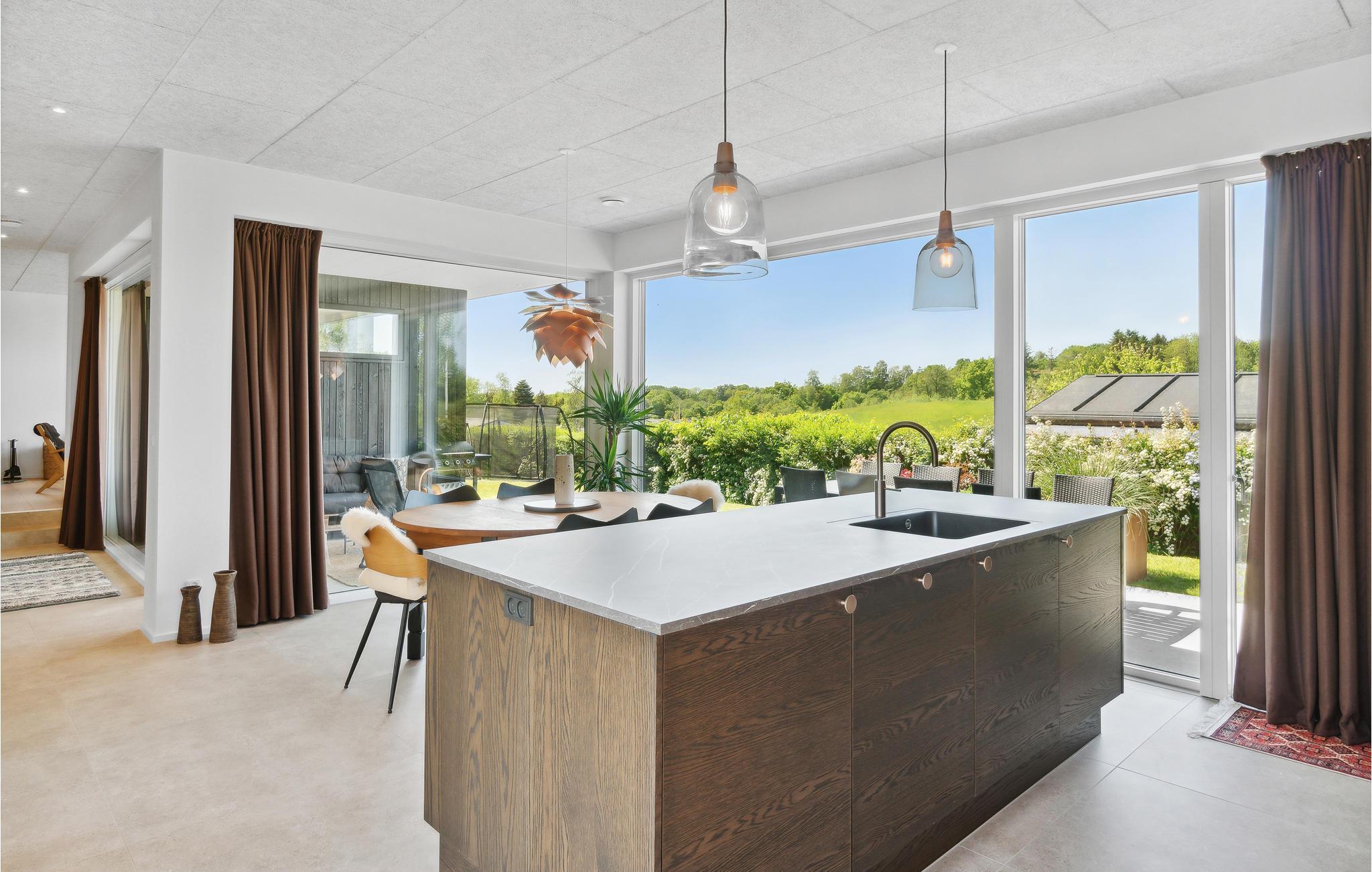 Der venter jer en helt særlig ferieoplevelse i denne drøm af et feriehus, som har store panoramavinduer, der giver jer udsigt til en grøn have og områdets frodige omgivelser. Inde i huset kan I se frem til komfort, design og en hyggelig atmosfære, der gør det nemmere for jer at glemme alt om den travle hverdag. Giv jer god tid til madlavningen i det moderne køkken, som har god kontakt til spisestuen og terrassen i sommermånederne. Ingen detaljer er tilfældige i dette indbydende hus, hvor I omgiver jer med høj komfort både ude og inde.