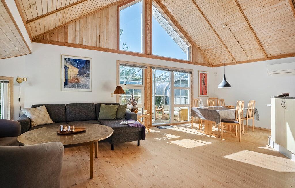Glæd jer til et afslappende ophold i dette feriehus, som giver jer de bedste betingelser for en ferie med familie eller venner. Huset ligger i rolige omgivelser nær kysten og er noget særligt med en behagelig blanding af komfort og funktionalitet. Træd ind i den åbne stue med højt til loftet, store vinduer og trævæggene, som er smukt fremhævet. Find jer til rette i den komfortable hjørnesofa og læs en spændende bog. Brændeovnen skaber en hyggelig atmosfære på kølige dage. Tilbered jeres måltider i det skønne køkken og nyd dem ved spisebordet med udsigt over den grønne have. En hyggelig hems fuldender rummet.