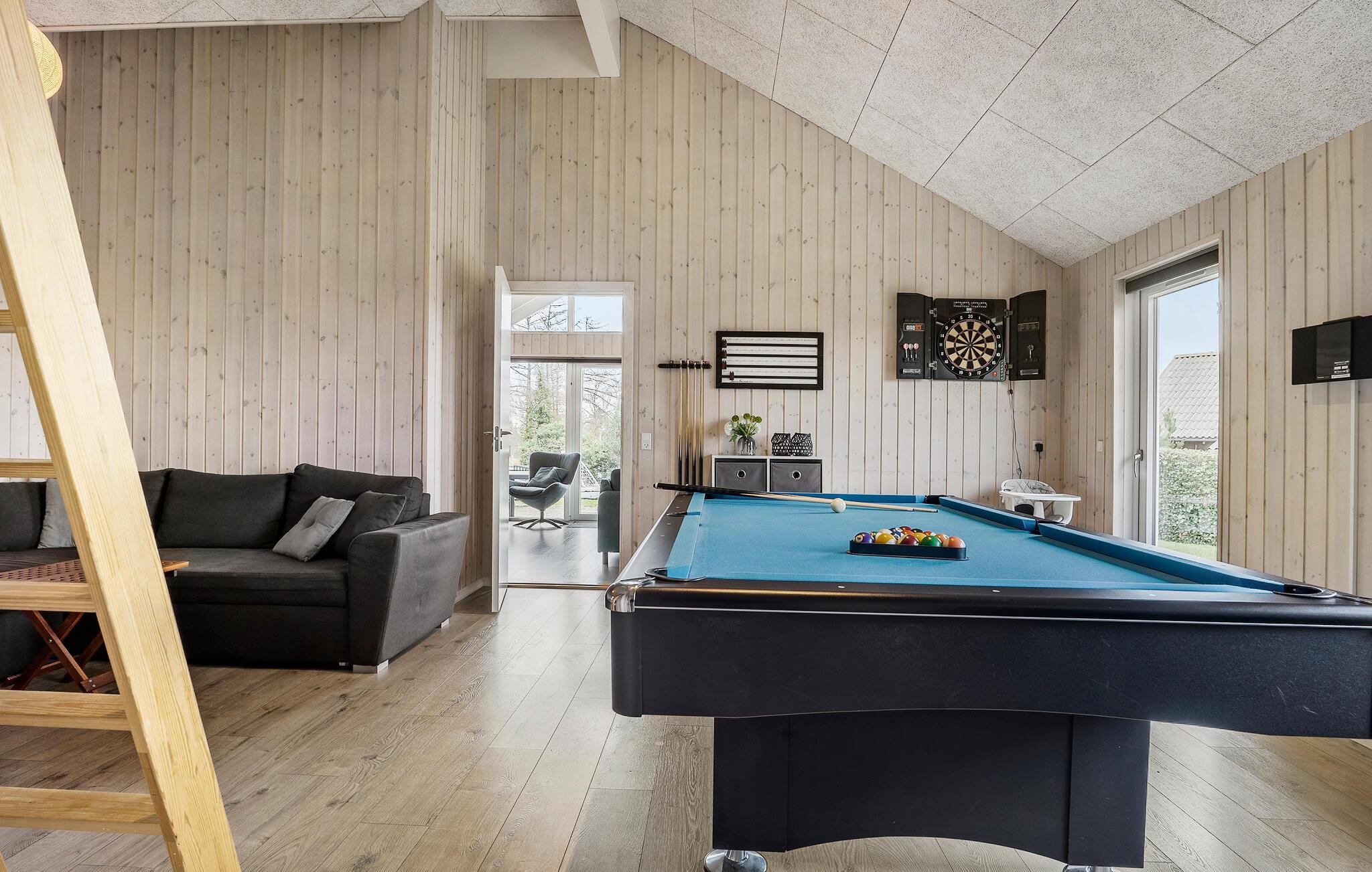 Dette rummelige sommerhus er noget særligt med sensationelle faciliteter, som I kan nyde med jeres venner eller udvidede familie. Glæd jer til hyggelige madlavningsaftener i det moderne køkken og harmoniske måltider ved det lange spisebord. Forkæl jer selv med hyggelige stunder i poolen, saunaen eller spabadet, og kom sammen til en filmaften i den hyggelige stue, mens brændeovnens knitren giver ekstra komfort.