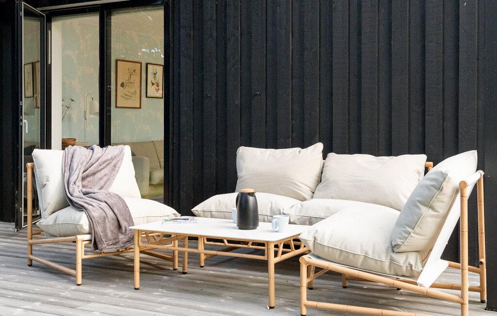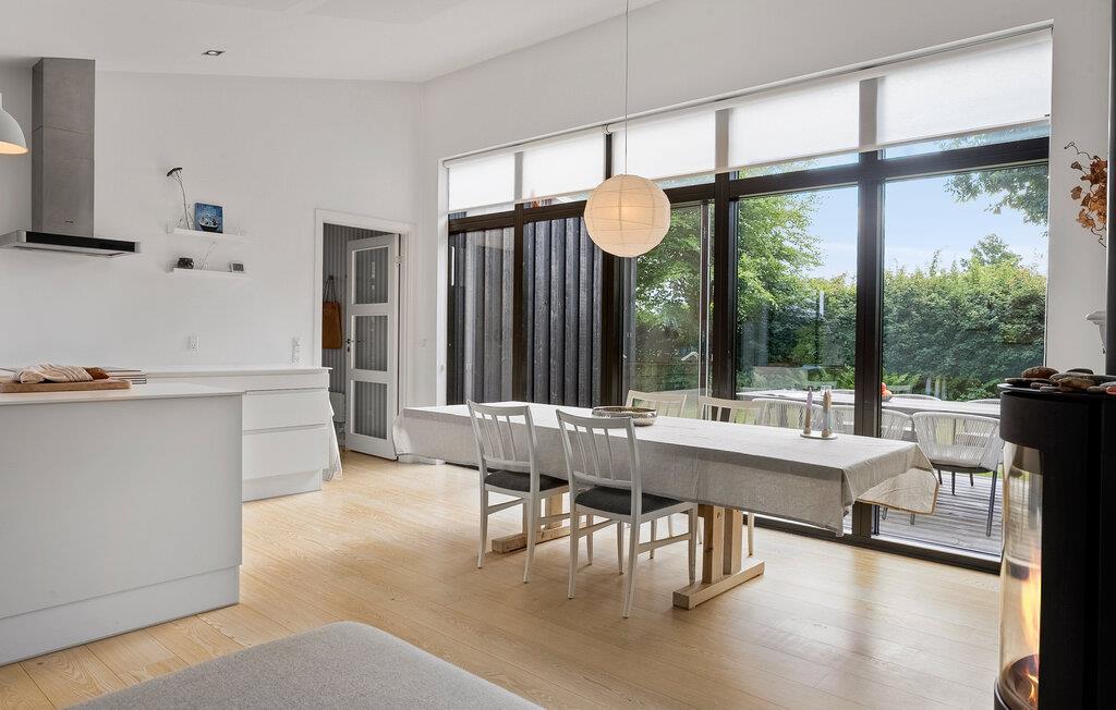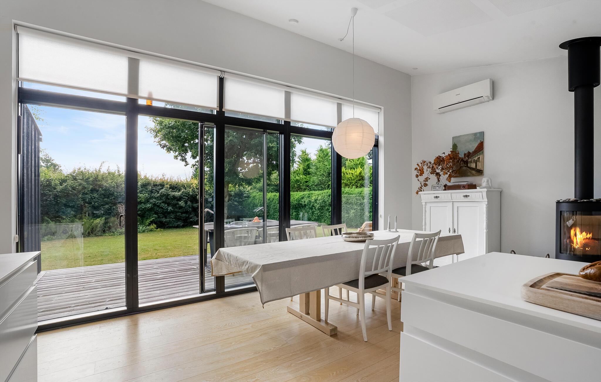 Den rene arkitektur og de naturlige træelementer i dette hus skaber en atmosfære, der er både stilfuld og hjemlig. På kølige dage sørger brændeovnen for hyggelig varme, mens I tilbereder måltider med familien i det moderne køkken. Uanset om I læser, lytter til musik eller snakker – er det nemt at slappe af her.