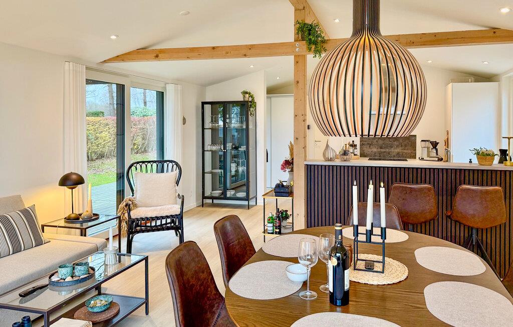 Velkommen til dette lyse hus med store vinduer. Her venter der en skøn ro og elegante indretningsløsninger.. Stuen er hyggeligt indrettet og lægger op til en rolig stund i sofaen eller et fælles brætspil, mens andre laver mad i køkkenet. Her kan alle lade op på hver deres måde.