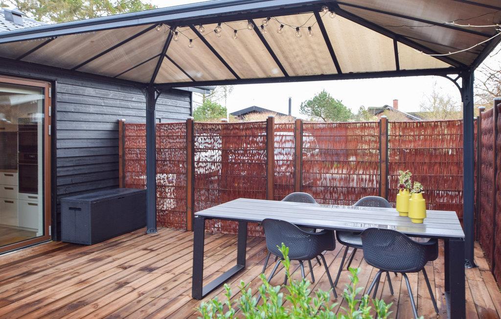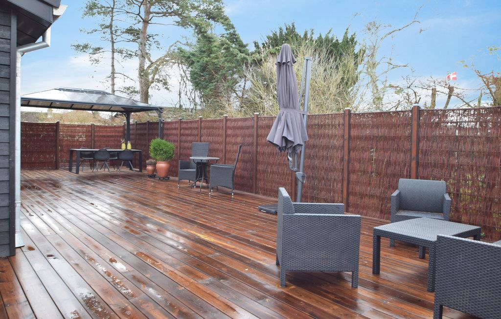I kort gåafstand til den dejlige sandstrand ligger dette rummelige, hyggelige og elegant indrettede feriehus. Huset indeholder en flot stue med moderne og komfortable møbler. Der er store vinduer fra gulv til loft, hvor lyset strømmer ind. De store vinduer vender ud mod den 95 m² store terrasse, der er afskærmet og indkig fra nabohuse og forbipasserende er meget begrænset. Til jeres rådighed er der Chromecast og Netflix i huset. Stuen er i åben forbindelse med det flot og fuldt udstyrede køkken, der er direkte adgang til terrassen fra køkkenet. På terrassen ved køkkenudgangen findes en stor, fastmonteret pavillon således at udelivet kan nydes, selvom der skulle komme en lille byge. I kan få skygge på varme dage, sidde udendørs selv når duggen falder og der er god plads til at hele familien kan samles til hyggelige måltider omkring havebordet. Terrassen vender mod syd og vest.