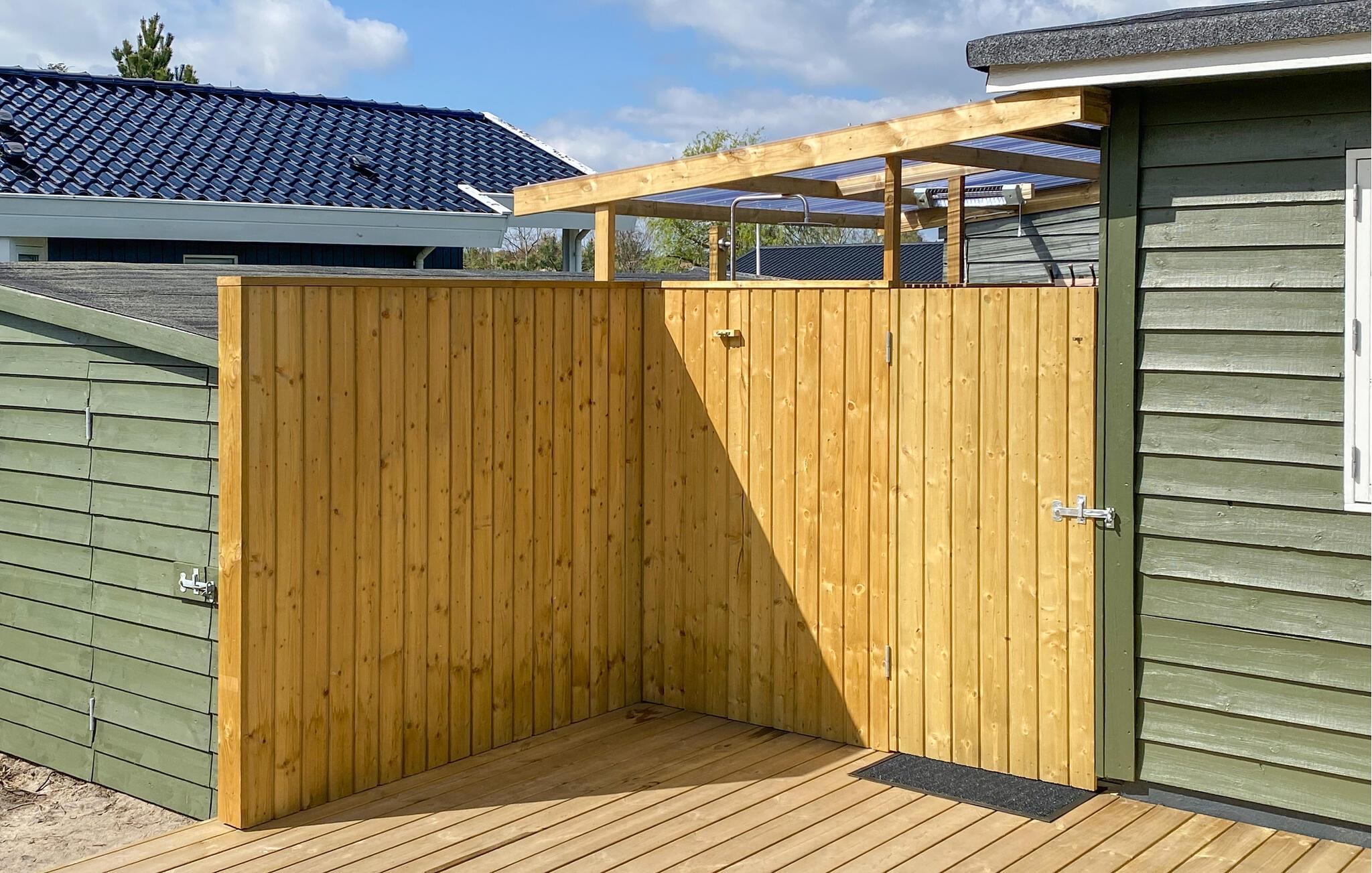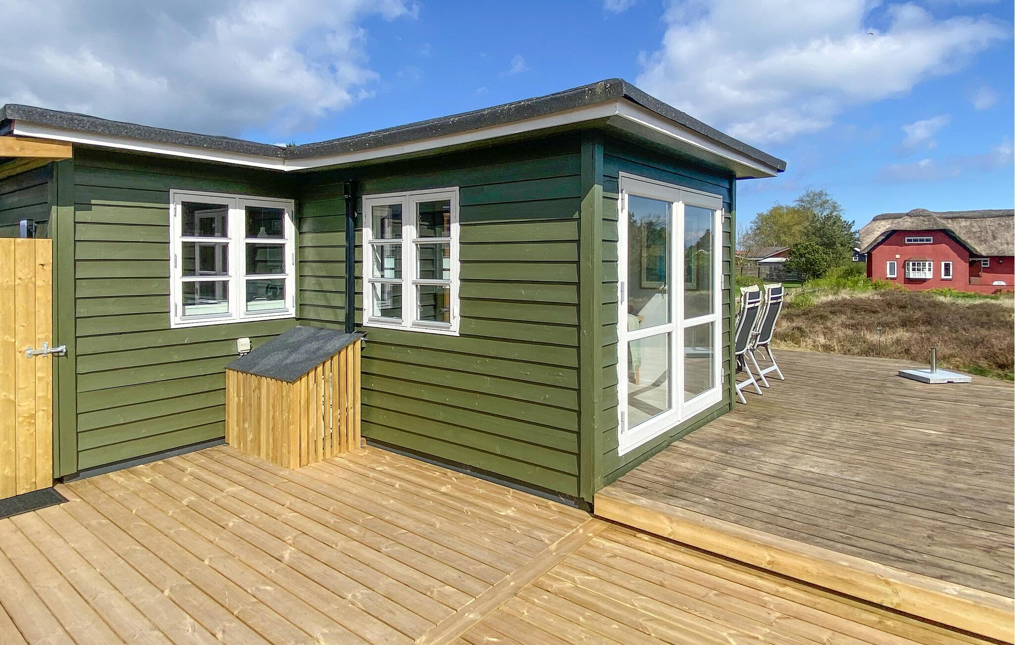 Hyggeligt træhus ved Hvidbjerg Strand med stor terrasse og kort afstand til børnevenlig strand.