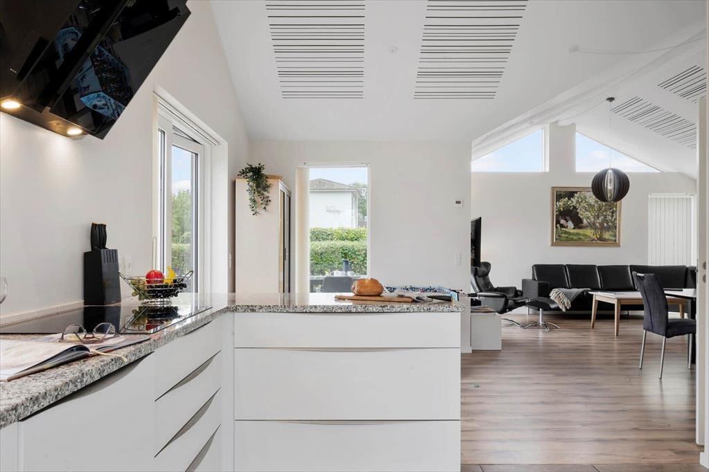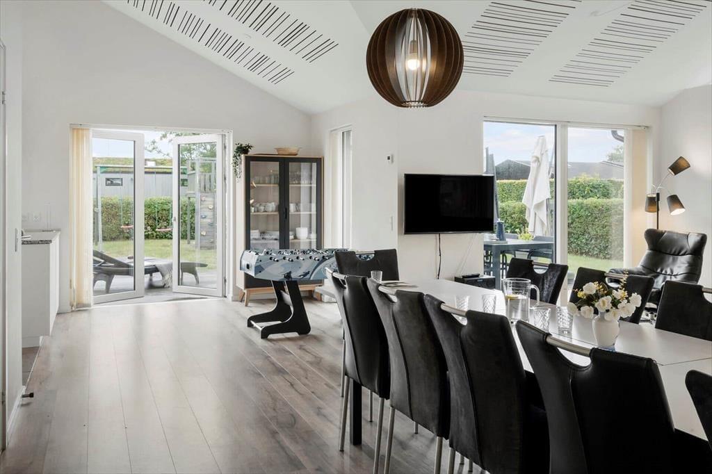 Når du træder ind i dette rummelige sommerhus, mødes du af en lys og indbydende atmosfære. Stuen er indrettet med komfortable møbler og store vinduespartier, der giver masser af naturligt lys og udsigt til den smukke natur udenfor. Her kan hele familien samles omkring spisebordet til hyggelige måltider, eller slappe af i sofaen med en god film. Køkkenet er moderne og veludstyret, så det er nemt at tilberede lækre måltider til alle. Husets højdepunkt er dog det luksuriøse spa- og saunaområde, hvor du kan nyde en afslappende stund efter en dag fuld af aktiviteter.