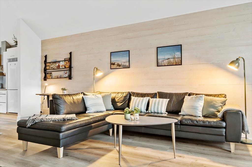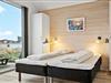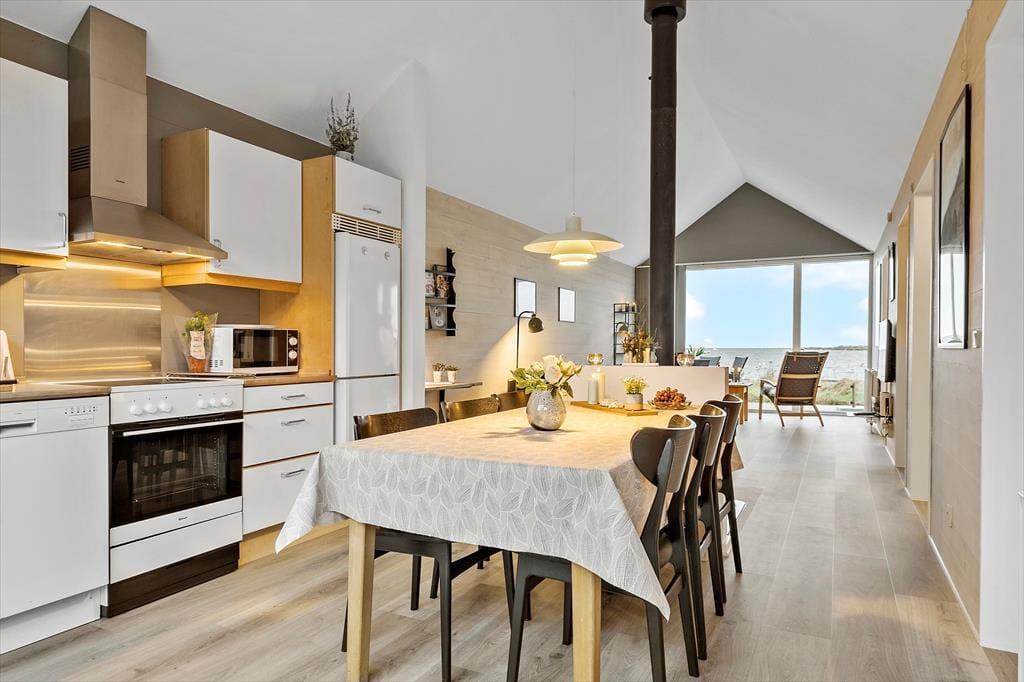 Huset er et af Slusehusene, hvis arkitektur er inspireret af fiskernes charmerende, gamle redskabsskure, og inden døre byder ferieboligen på loft til kip og et skønt, gennemstrømmende lys fra store vinduespartier. I det store, åbne opholdsrum adskilles køkkenet og stuen af brændeovnen, der luner og spreder en hyggelig atmosfære. Køkkenet er godt udrustet til både de store og små måltider, og lækkerierne serveres let ved spisebordet. Stuen er indrettet med et sofaarrangement, hvor I kan se tv eller bruge feriehusets wi-fi, og her er også lænestole, hvor I kan lade jer betage af udsigten. Begge badeværelser har gulvvarme, og det ene byder på et spabad, mens det andet er indrettet med bruseniche og sauna. Det ene soveværelse har direkte adgang til solgården, og det andet har fjordudsigt og adgang til den sydvendte terrasse.