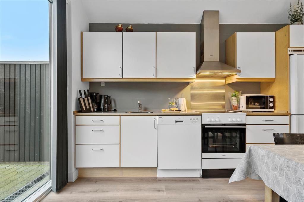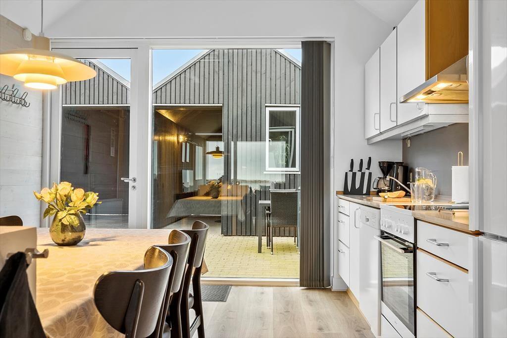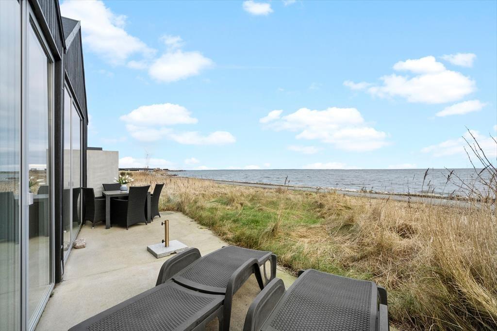 Den sydvendte terrasse ligger direkte ud til strandengen og fjordens bred, og her kan I dagen lang nyde udsigten i solen. Solgården er godt afskærmet og byder på læ, hvis vinden blæser, og her har I det ideelle sted at grille og servere måltiderne i det fri. Feriehuset byder på en integreret carport med lader til elbil, og udhuset rummer et bryggers med vaskemaskine, tørretumbler, fryser og et grovkøkken, hvor lystfiskeren kan rense dagens fangst.