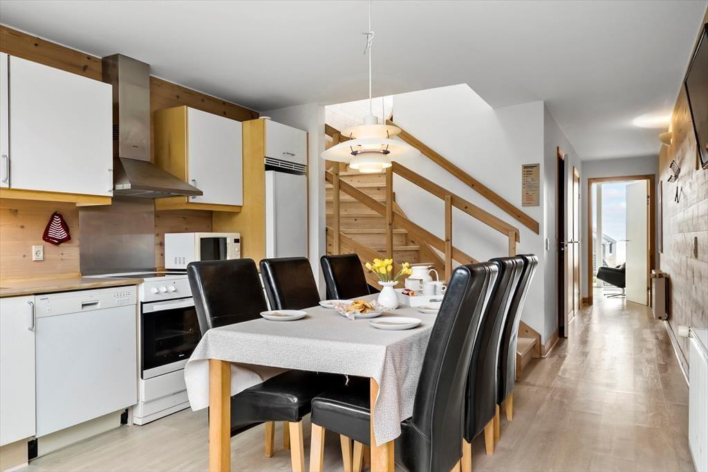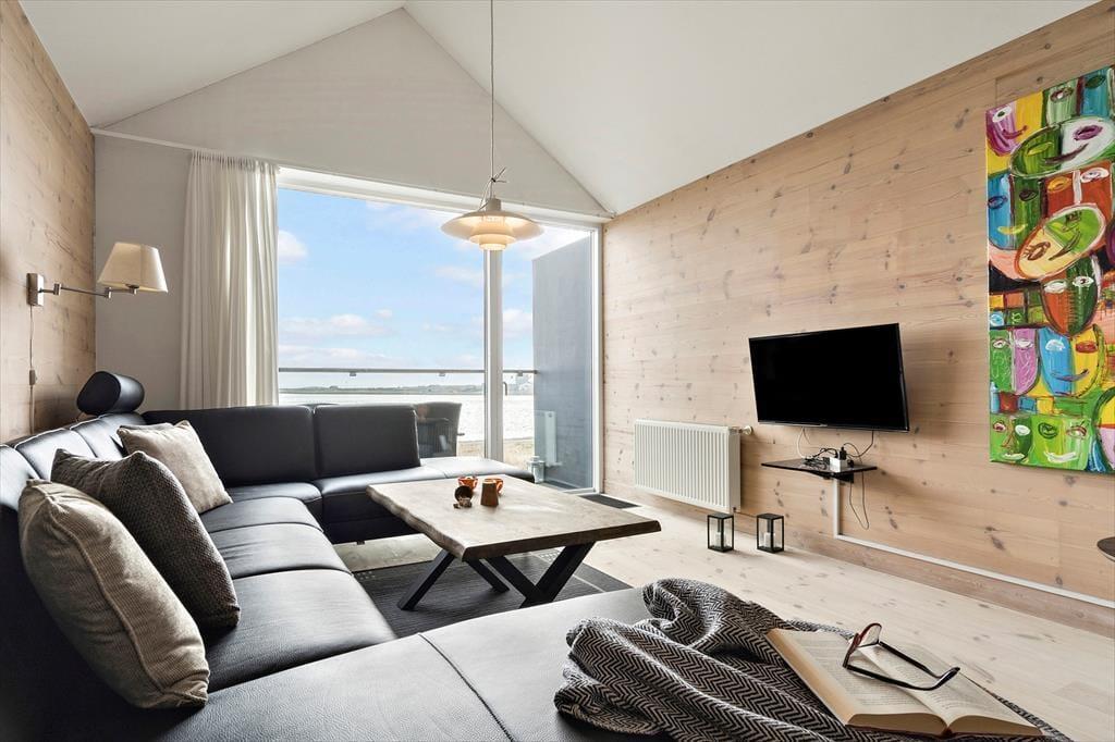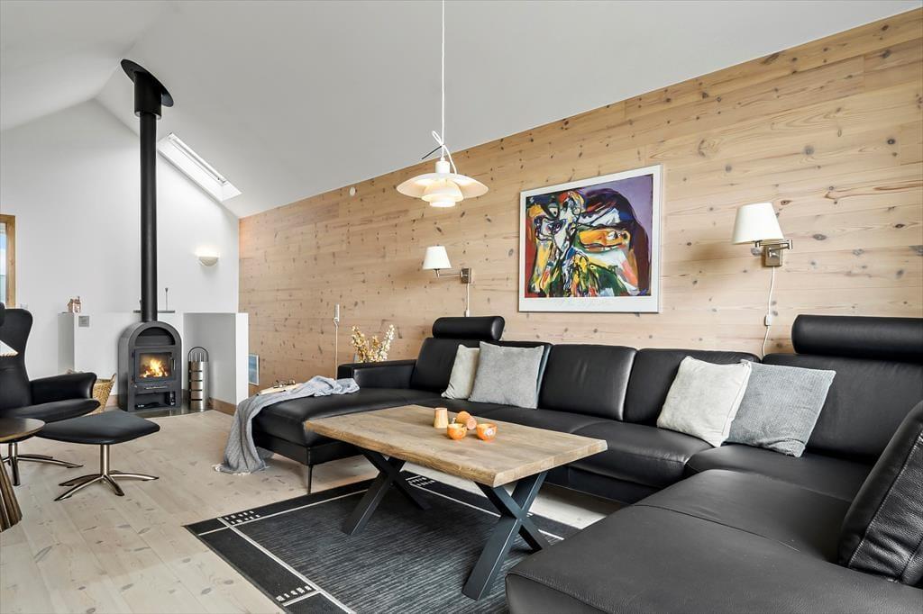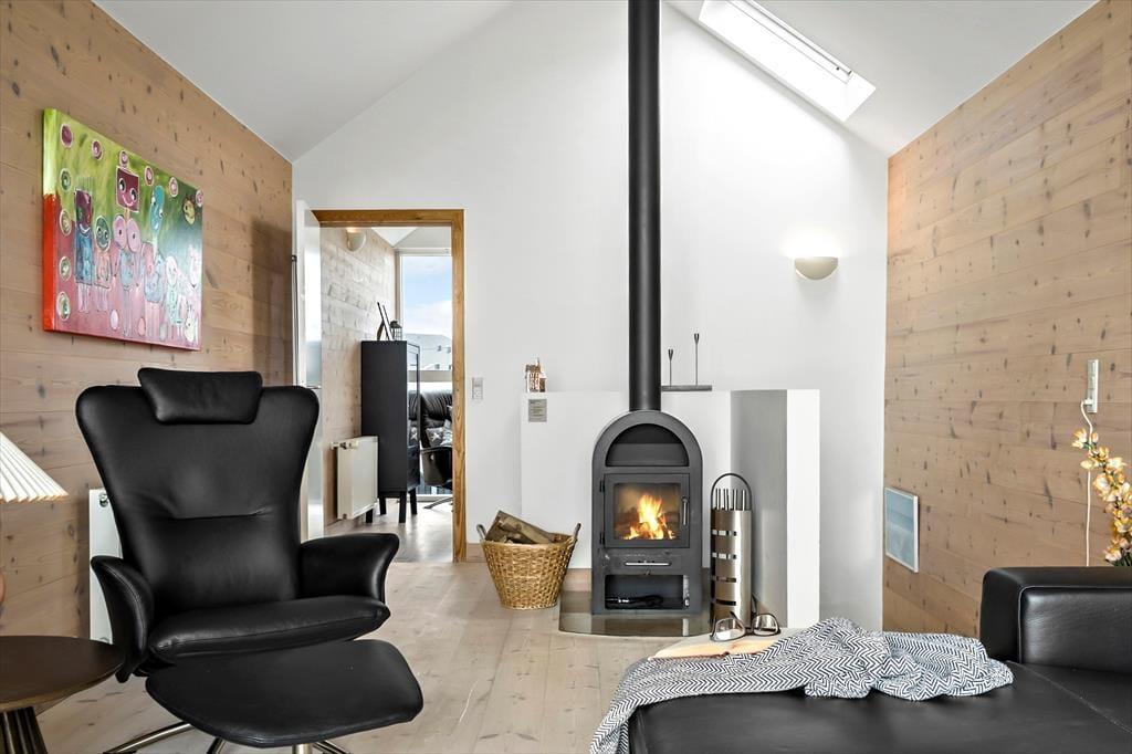 Det 116 m2 store feriehus er et rigtigt kvalitetsbyggeri med en velfungerende indretning og en skøn atmosfære. Planløsningen passer godt til fire personer, for der er to soveværelser at gøre godt med – og det, der ligger i stueplan, har vinduer fra gulv til loft vendt mod fjorden. I stueetagen finder I for øvrigt et velindrettet spisekøkken og to gode badeværelser, hvoraf det ene er med sauna og det andet med spabad. Tager I trappen op til førstesalen, kommer I til en dejlig stue med brændeovn, komfortable siddemøbler og fladskærms-tv. Det er dog det store gavlvindue med fjordudsigt og lysindfald fra syd, der er det mest bemærkelsesværdige, for tænk jer bare at kunne slappe af her i så smukke omgivelser. Ved husets indgang og gårdhave ligger for øvrigt et praktisk bryggers, der er indrettet med vaskemaskine, tørretumbler, fryser og fiskerenseplads.