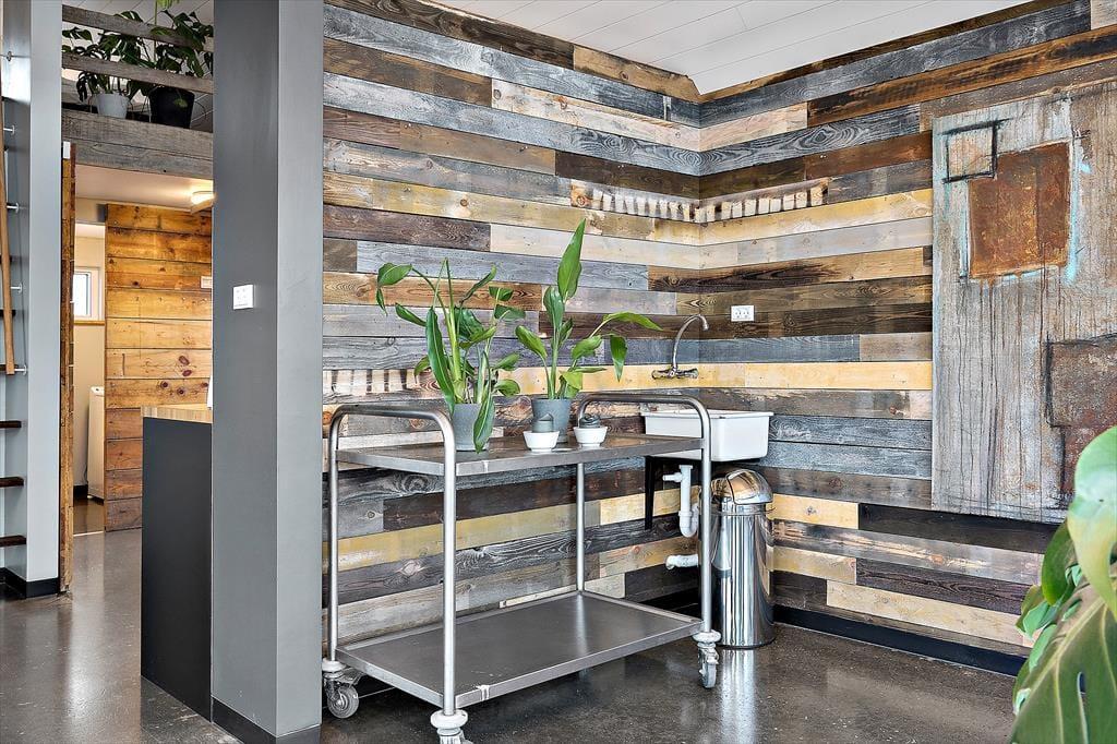 Accentvæggen i atelieret er lavet med genanvendt emballagetræ fra værftet på havnen, og skydedørene er tømret sammen af brugte pallerammer. Også vindueskarme, bænk, trappetrin og hylder er snedkereret i genbrugstræ.