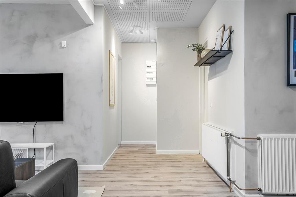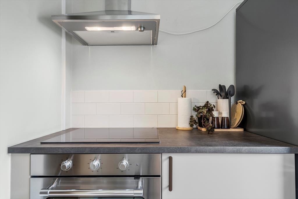 Lejligheden er hyggeligt indrettet med en lys og indbydende atmosfære. I forlængelse af stuen finder du en dobbeltseng, der er afskærmet med et forhæng, så du kan nyde en god nats søvn efter en dag fuld af oplevelser. Køkkenet er praktisk og udstyret med både ovn og kogeplader, så du har mulighed for at tilberede dine måltider hjemme – men du kan selvfølgelig også vælge at spise ude på en af byens mange gode restauranter. Efter en lang dag kan du slappe af i sofaen med en god bog eller en film, mens du lytter til lyden af byen, der langsomt falder til ro. Her er der skabt en atmosfære af afslapning og komfort, så du kan føle dig hjemme fra første øjeblik.