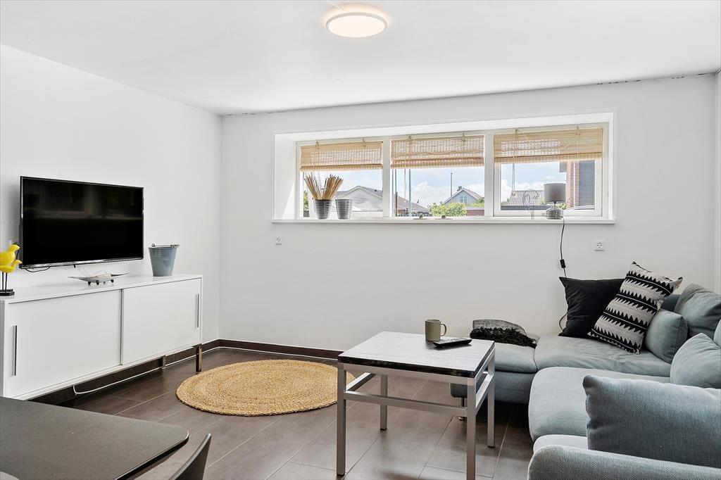 Mere præcist er der tale om en høj kælderlejlighed, der har brede vinduer i alle rum og en pæn indretning efter moderniseringen i 2021. Og inden døre finder du alt, hvad du skal bruge: Stuen har både sofa, spisebord og fladskærms-tv, når du vil hygge dig og slappe af, og når hvis bliver sulten, kan du trylle noget lækkert frem i det stilfulde og veludstyrede køkken. Badeværelset er med badekar, hvis du trænger til et varmt bad, når du vender hjem fra en cykeludflugt eller vandretur, og endelig sørger de to soveværelser for, at du og dine kære kan sove både godt og længe.