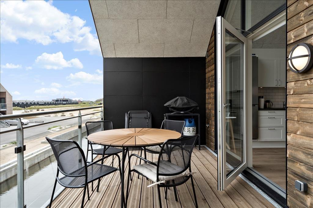 Ude i det fri hører der en parkeringsplads med til lejligheden og hele to overdækkede altaner. Den ene altan ligger i forbindelse med trappeopgangen, og her kan I sidde i solen sidst på dagen, mens I kigger ned på livet, der udspiller sig ved og på vandet. Kanaludsigten er også skøn fra den sydvendte altan, og her har I ovenikøbet kig til Ringkøbing Fjord.