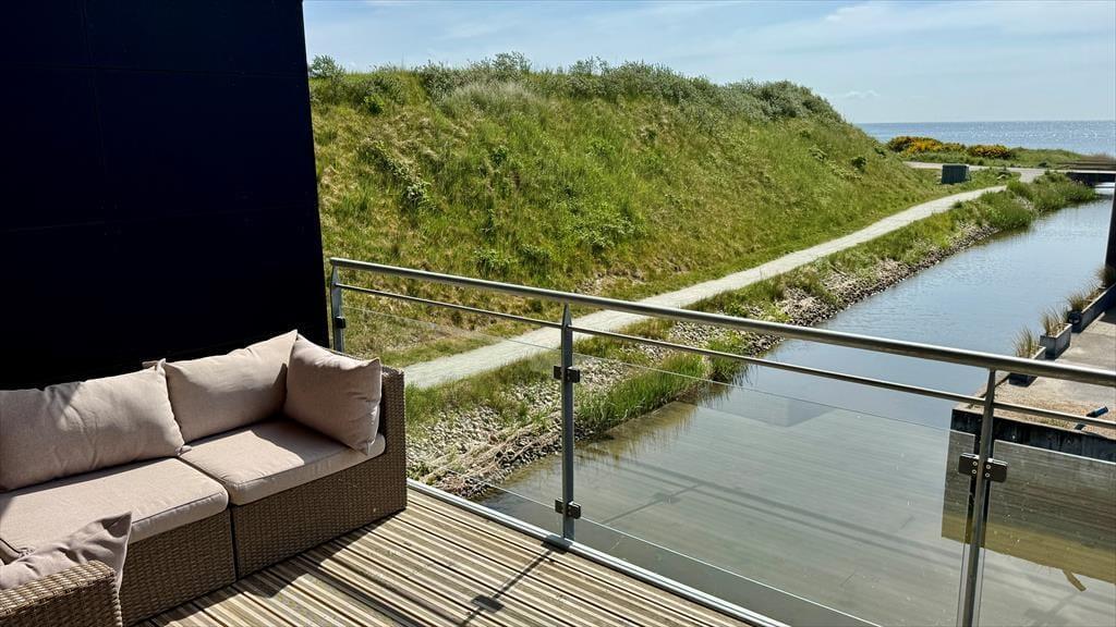 I får en flot ramme om ferielivet i denne moderne lejlighed fra 2021. Lejligheden er supergodt indrettet og udstyret med to altaner, der begge ligger smukt ud til kanalerne i Langsand Langs Vand. Kigget til Ringkøbing Fjord er bestemt også med til at pynte, og den centrale adresse i Hvide Sande er endnu et plus.