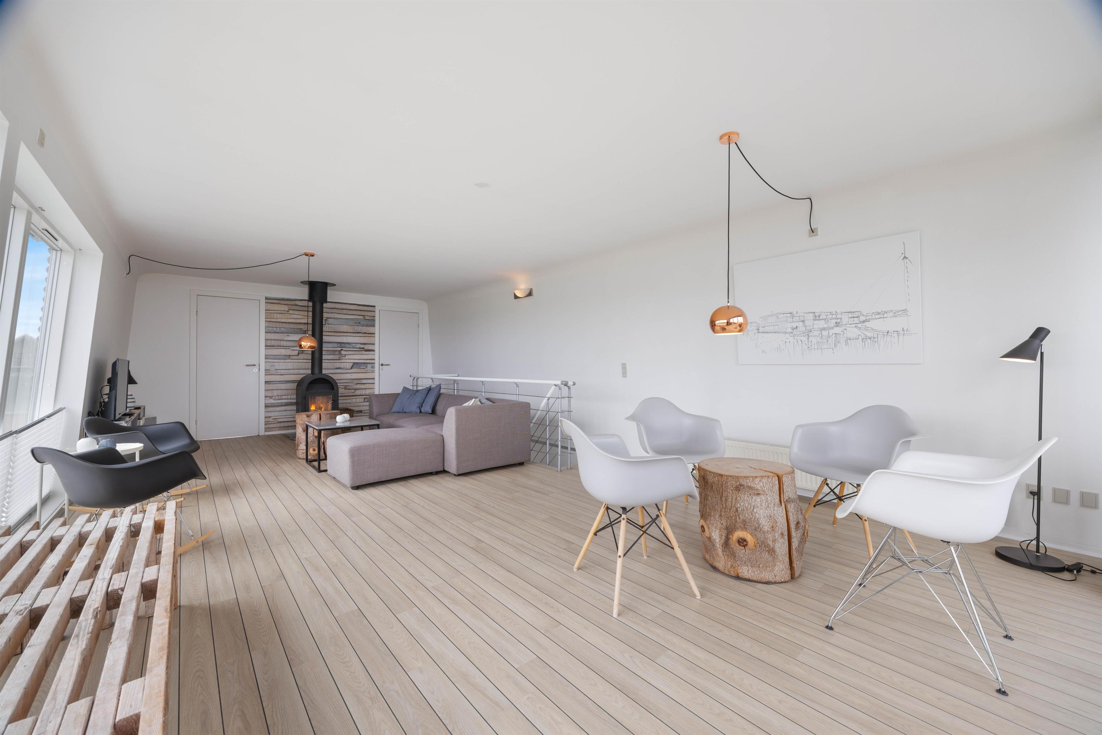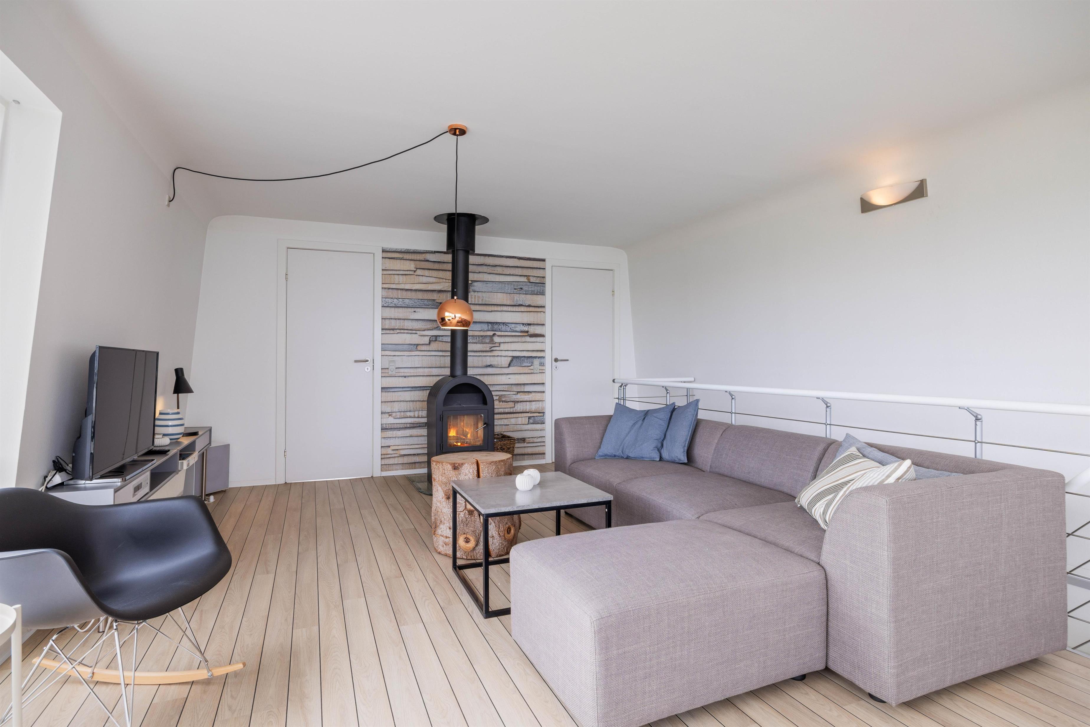 Ovenpå finder du yderligere to soverum samt en hyggelig og rummelig stue, hvor du om aftenerne kan hygge dig med ild i brændeovnen, tændte stearinlys og den smukke udsigt over fjorden.